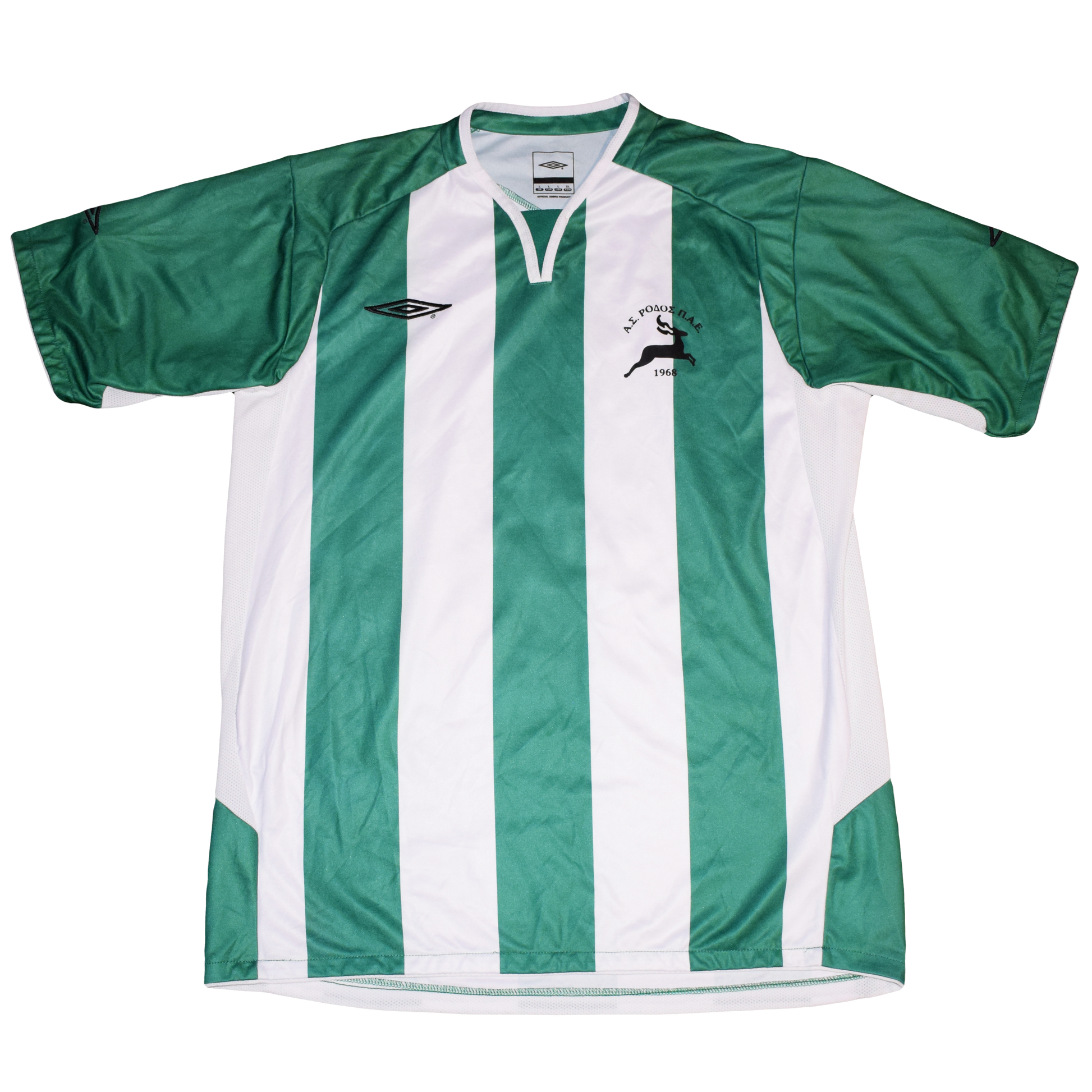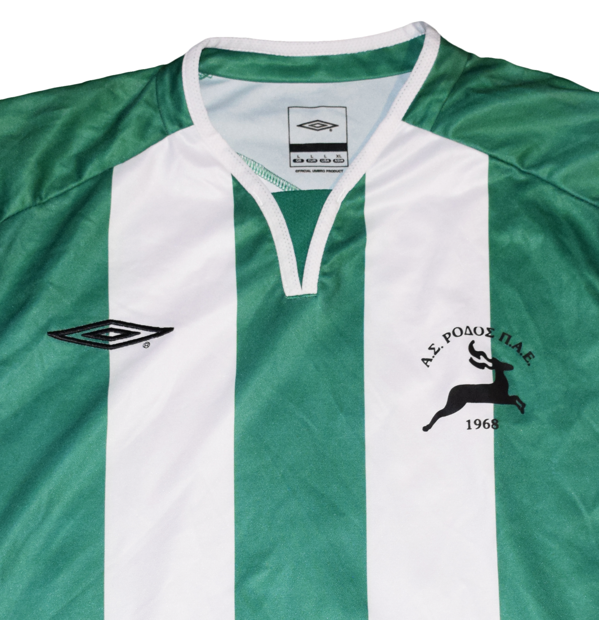 Ένα πραγματικά ξεχωριστό κομμάτι για συλλέκτες ελληνικού ποδοσφαίρου: αυτή η αυθεντική εμφάνιση εκτός έδρας της AS Rodos για την σεζόν 2008/09 σε Large, με την εκτύπωση του αριθμού 2, είναι φορεμένη σε αγώνα και εξαιρετικά δύσκολο να βρεθεί. Κατασκευασμένη από την Umbro.