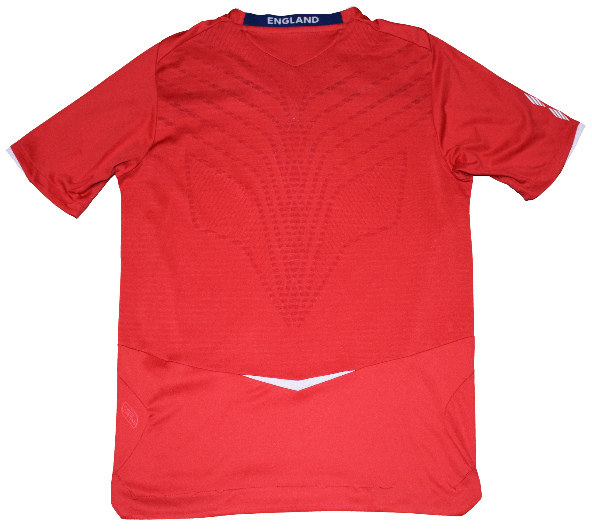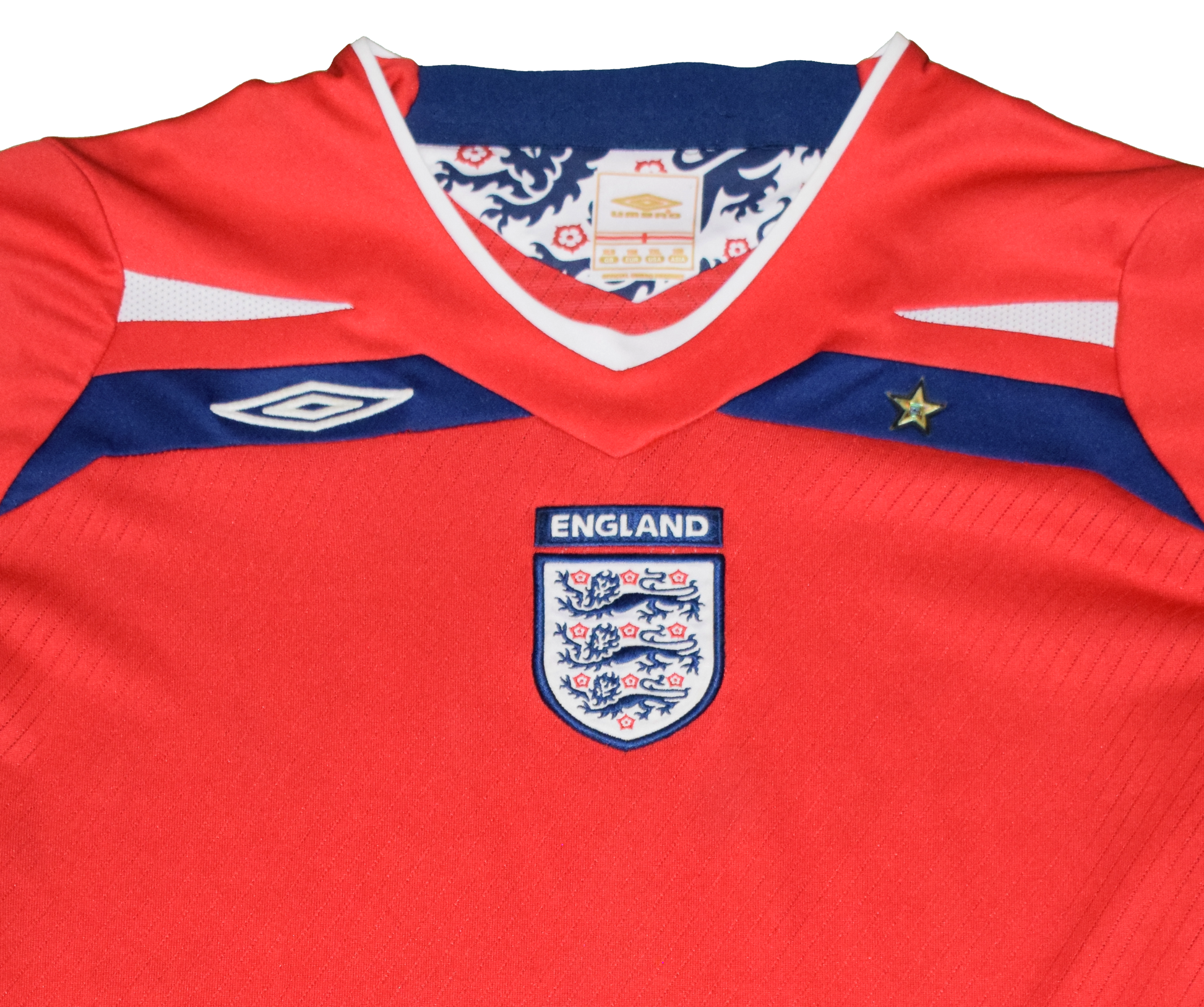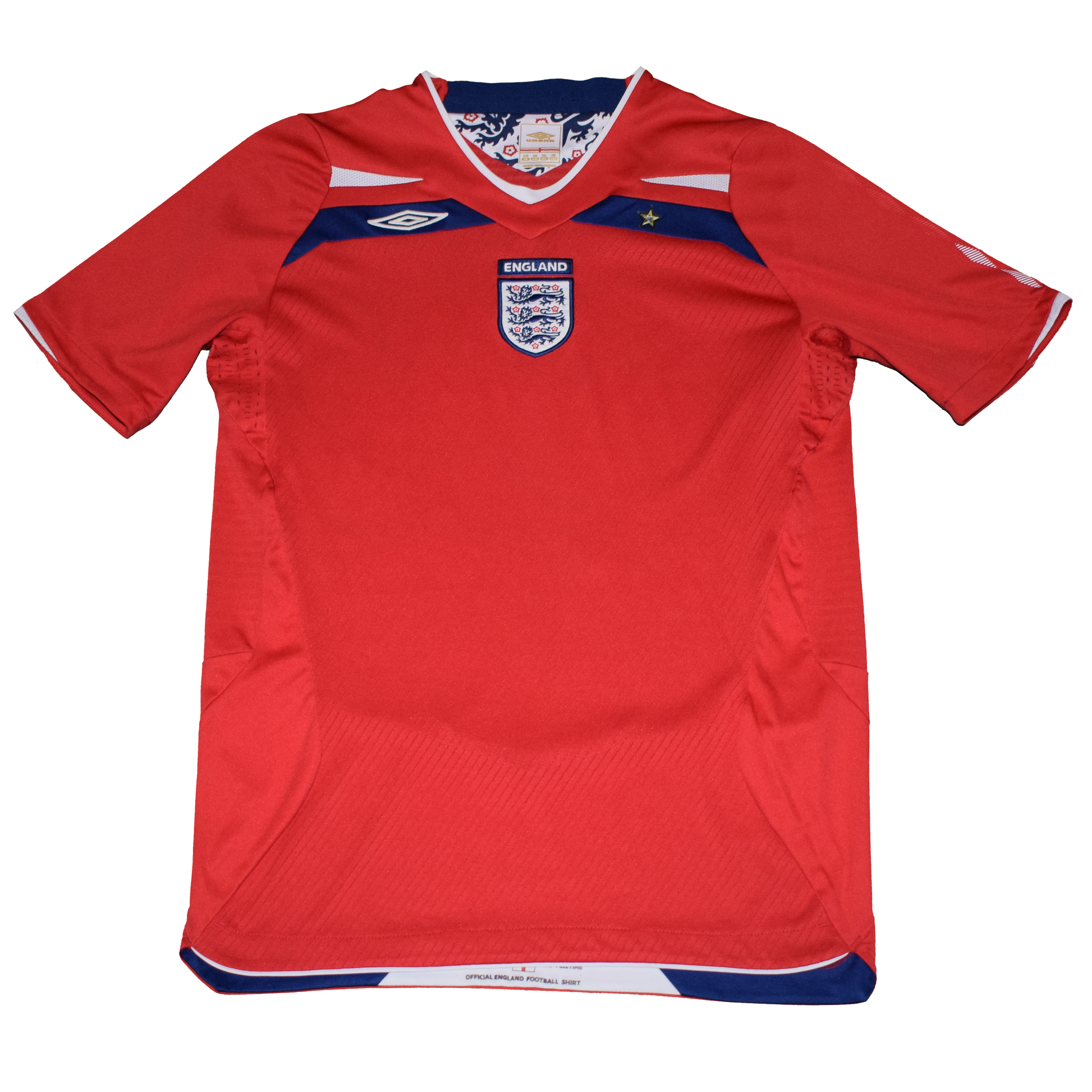 Η εκτός έδρας εμφάνιση της Αγγλίας το 2008 (Youth XL) , στο χαρακτηριστικό κόκκινο χρώμα της, κυκλοφόρησε κατά τη διάρκεια μιας μεταβατικής περιόδου για την εθνική ομάδα της Αγγλίας. Σχεδιασμένη από την Umbro , η φανέλα είχε ένα εντυπωσιακό αστέρι πάνω από το έμβλημα που μνημονεύει τον θρίαμβο της Αγγλίας στο Παγκόσμιο Κύπελλο του 1966, μαζί με έντονες μπλε και λευκές λεπτομέρειες στο στήθος και τα μανίκια.