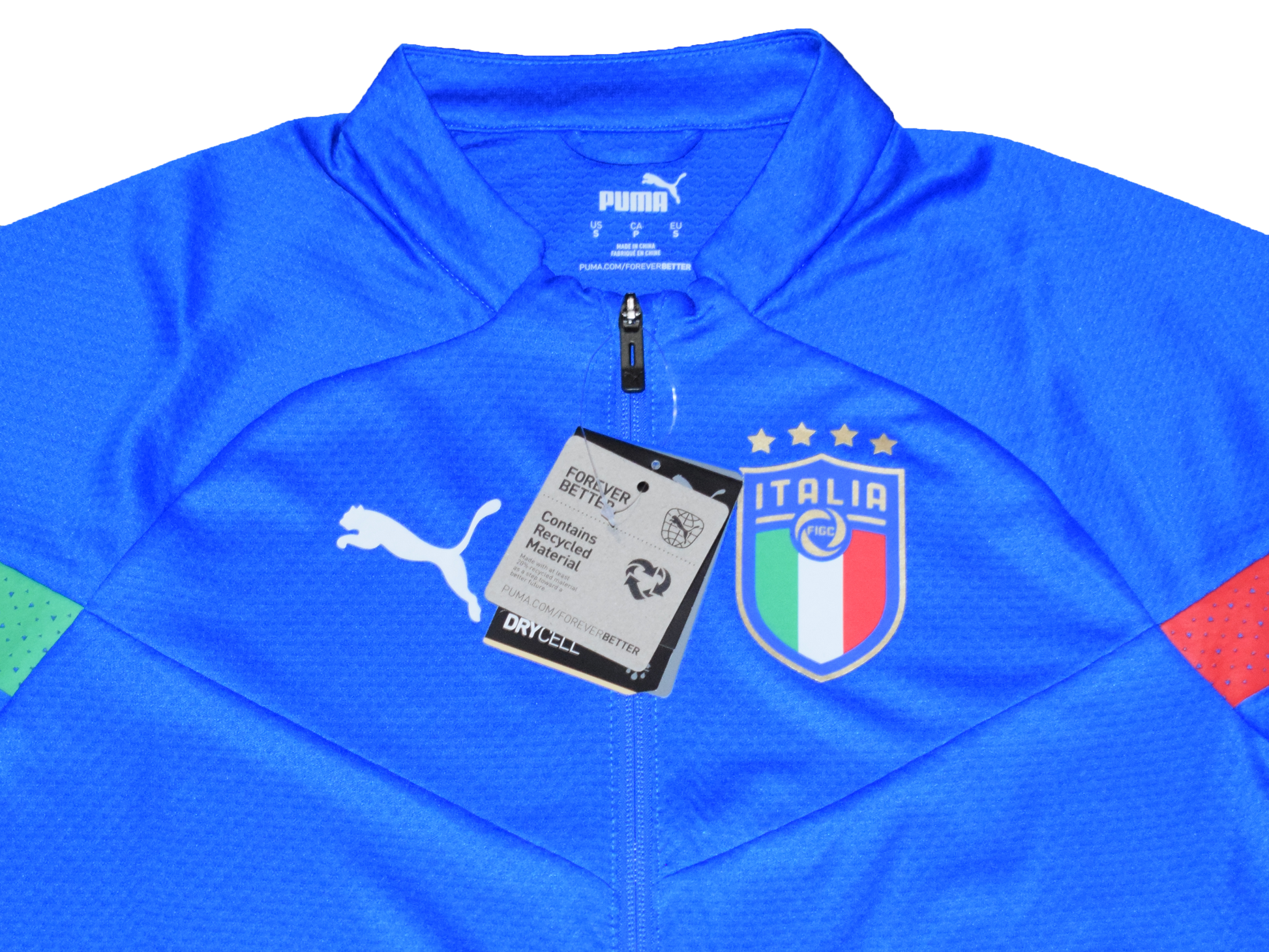Επίσημη ζακέτα προπόνησης Puma σε signature μπλε Azzurri. Διαθέτει πλήρες φερμουάρ, μοντέρνο κόψιμο σε λεπτή εφαρμογή, έμβλημα Ιταλίας με 4 αστέρια, ύφασμα απόδοσης DryCELL και μοναδικές τρίχρωμες ρίγες ώμου (πράσινο/κόκκινο). Ολοκαίνουργια με ετικέτες. Μέγεθος Small.
