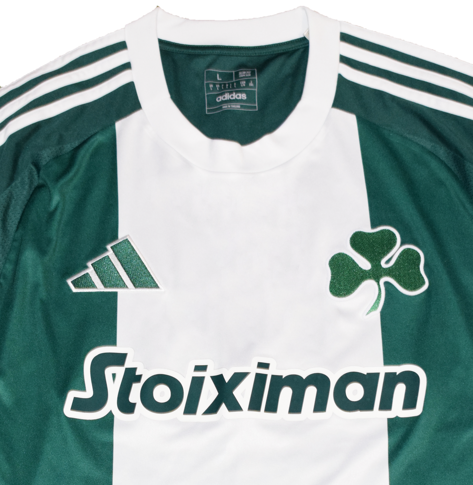 Αυτή είναι η επίσημη εντός έδρας φανέλα του Παναθηναϊκού για τη σεζόν 2024/25, την οποία φόρεσε ο Σουηδός επιθετικός Γκούσταβ Γερεμέγιεφ κατά τη διάρκεια του αγώνα της Super League εναντίον του Λεβαδειακού στις 25 Αυγούστου 2024 στο Ολυμπιακό Στάδιο (ΟΑΚΑ) της Αθήνας. Ο Γερεμέγιεφ έπαιξε και τα 90 λεπτά στη δύσκολη νίκη του Παναθηναϊκού με 1-0, βοηθώντας τους «πράσινους» να ξεκινήσουν την εγχώρια σεζόν τους με τρεις κρίσιμους βαθμούς.
