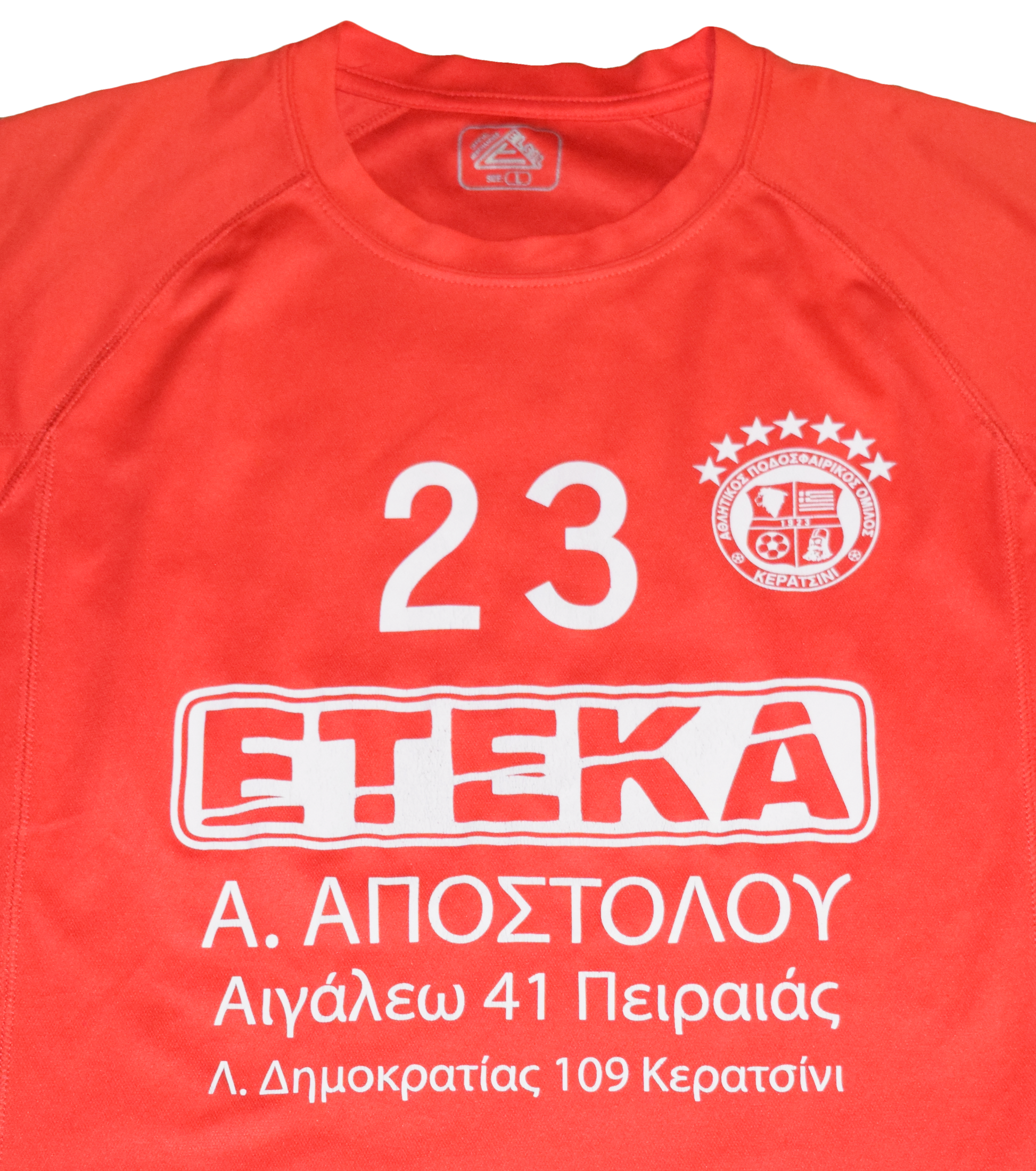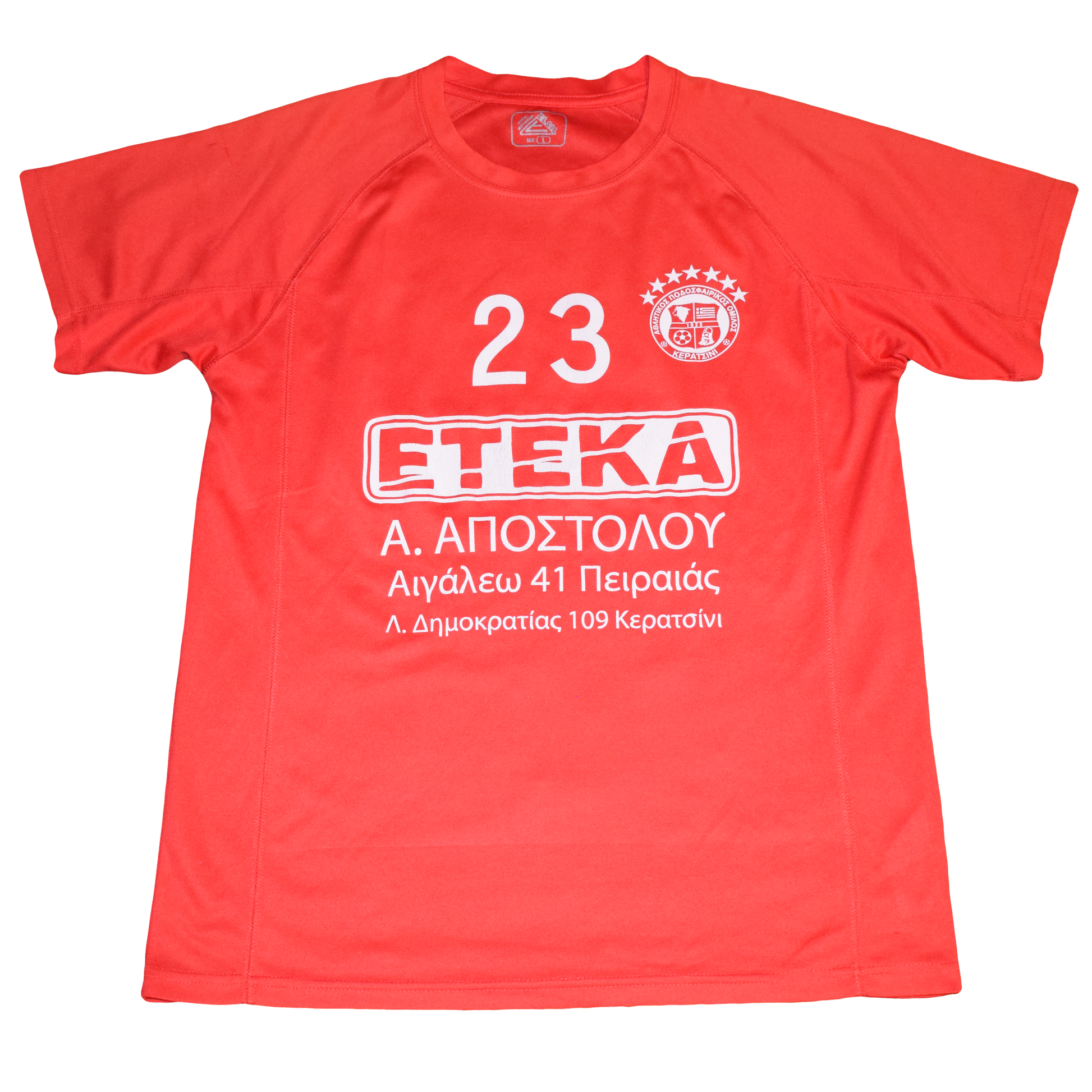 Σχεδιασμός: Φωτεινή κόκκινη βάση με έντονη λευκή εκτύπωση χορηγού (ETEKA) και τον αριθμό 23 στο στήθος.