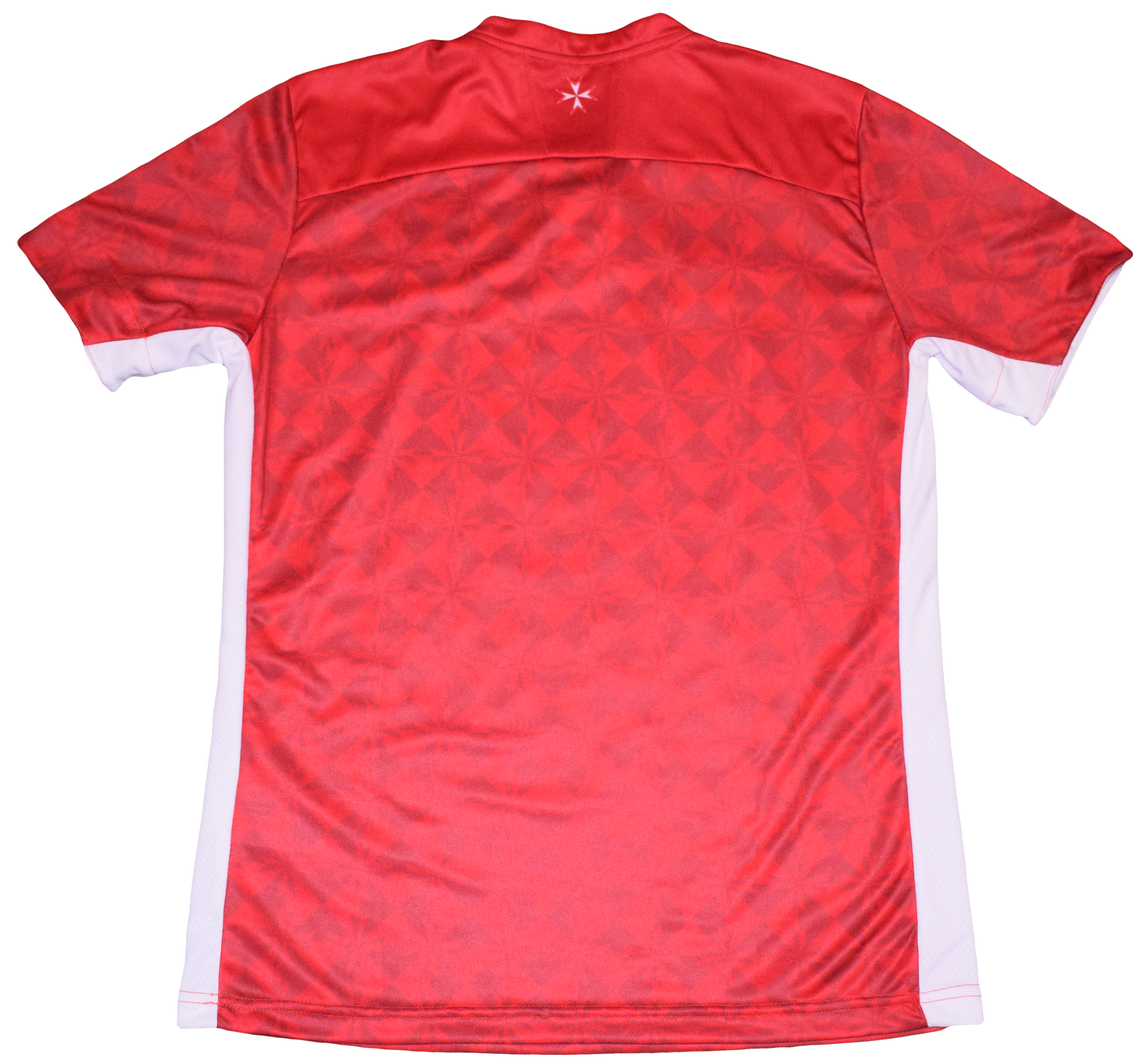 Η φανέλα διατίθεται σε πλούσια κόκκινη βάση με διακριτικά γεωμετρικά σχέδια, λευκά πλαϊνά πάνελ και το εμβληματικό σήμα του σταυρού της Μάλτας που κοσμεί περήφανα το στήθος. Ένας καθαρός γιακάς με V ντεκολτέ ολοκληρώνει τη μοντέρνα διεθνή εμφάνιση.