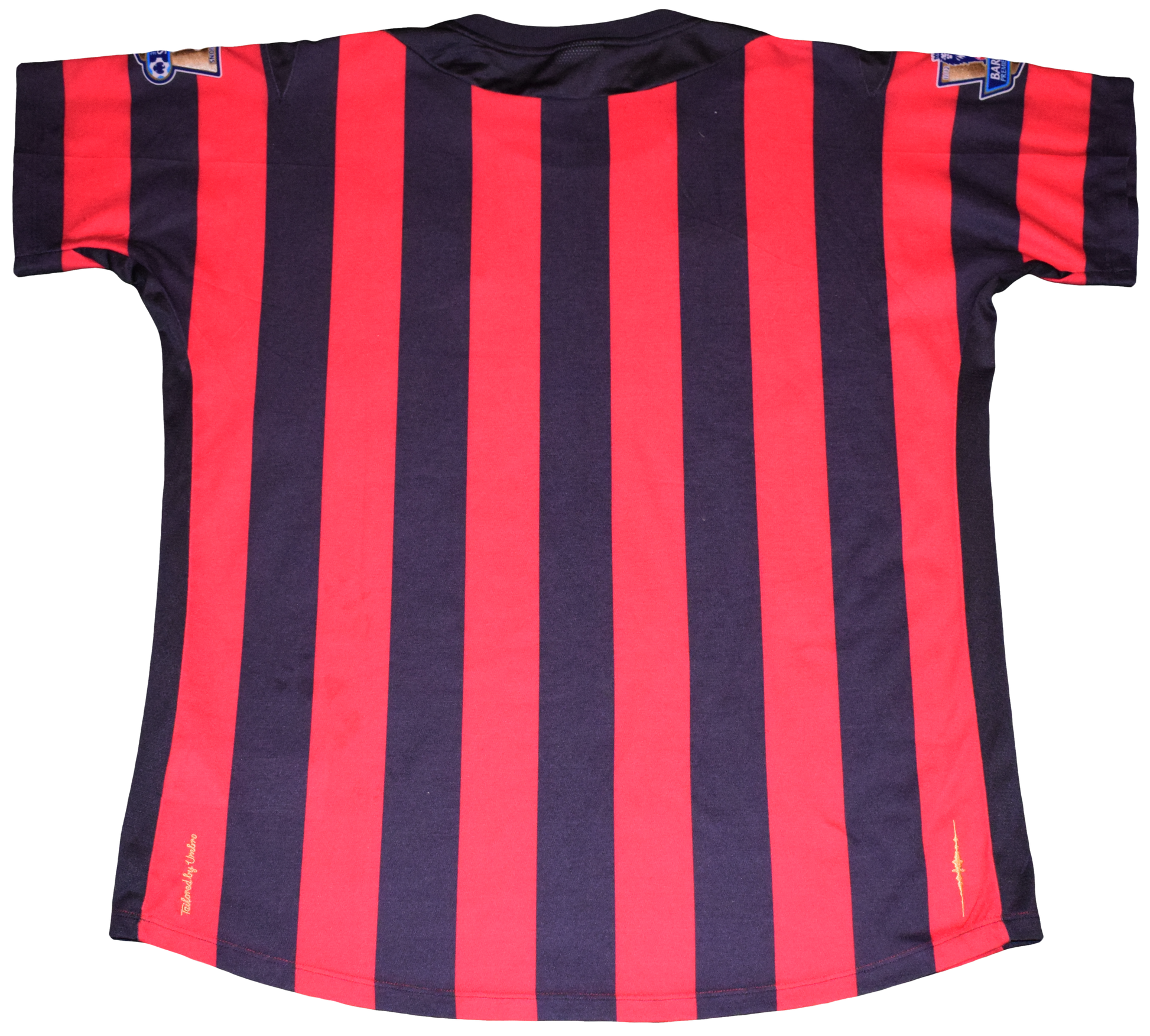 Σε άριστη κατάσταση. Κλασικό κόκκινο και μαύρο ριγέ σχέδιο από την Umbro, με τον χορηγό της Etihad Airways και σπάνια επίσημα σήματα στα μανίκια της Barclays Premier League. Μια ξεχωριστή φανέλα από μια από τις πιο ιστορικές σεζόν στην ιστορία του συλλόγου. Μέγεθος XL, κατασκευασμένη από την Umbro.