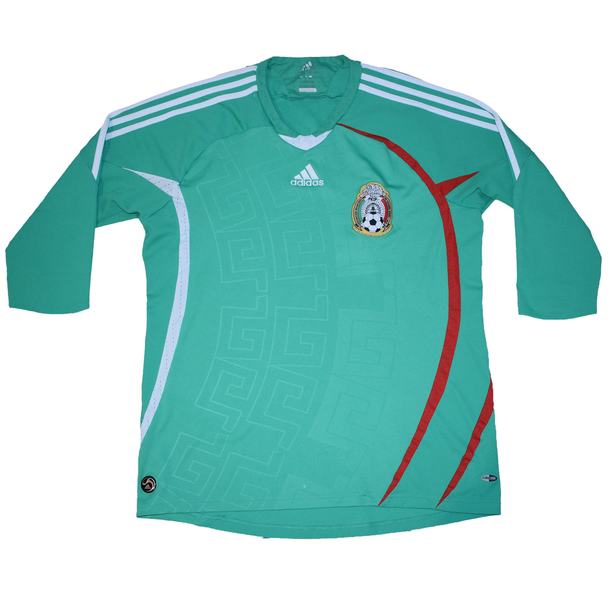 Το 2008, οι φανέλες της εθνικής ομάδας του Μεξικού είχαν ένα χαρακτηριστικό σχέδιο που περιελάμβανε μανίκια 3/4, κάτι που ήταν αρκετά μοναδικό για τα ποδοσφαιρικά ρούχα εκείνη την εποχή. Η φανέλα ενσωμάτωσε επίσης διάτρητα σημεία για αερισμό, ενισχύοντας την αναπνοή του σώματος κατά τη διάρκεια έντονων αγώνων. Το μέγεθος είναι Large και είναι σε καλή κατάσταση χωρίς σημαντικά ελαττώματα εκτός από μερικά τραβήγματα και την φθαρμένη ετικέτα μεγέθους στον σβέρκο.
