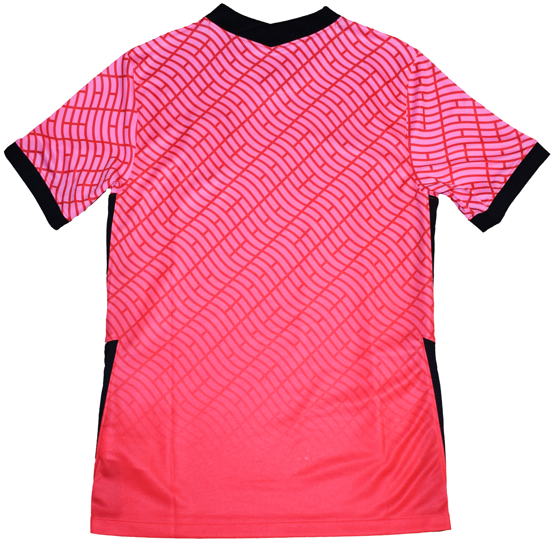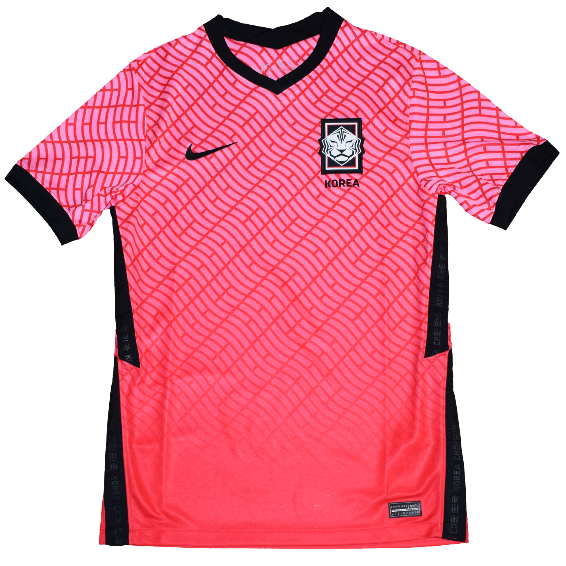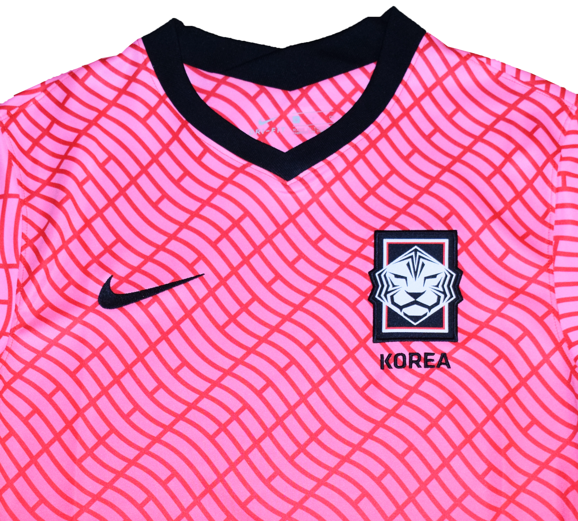Με τολμηρή και μοντέρνα σχεδίαση, η φανέλα της Νότιας Κορέας 2020/21 διαθέτει ένα εντυπωσιακό ροζ και κόκκινο μοτίβο εμπνευσμένο από τις ρίγες μιας τίγρης—συμβολίζοντας το άγριο και ατρόμητο πνεύμα του έθνους. Οι μαύρες πινελιές στον γιακά, τα μανίκια και τους ώμους προσθέτουν μια έντονη αντίθεση, ενώ το νέο σήμα δείχνει ένα στυλιζαρισμένο κεφάλι τίγρης, που ενσωματώνει τη δύναμη και την αποφασιστικότητα.