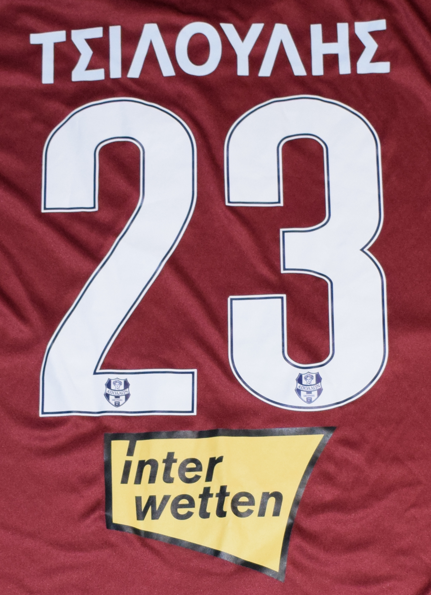 Authentic Match-Issued & Worn Jersey – Αυτή η εντυπωσιακή τρίτη φανέλα Hummel σε μπορντό χρώμα διαθέτει θερμικά τυπώματα, όπως το τολμηρό #23 του Τσιλούλη, το έμβλημα του Απόλλωνα Σμύρνης και τα λογότυπα χορηγών.
