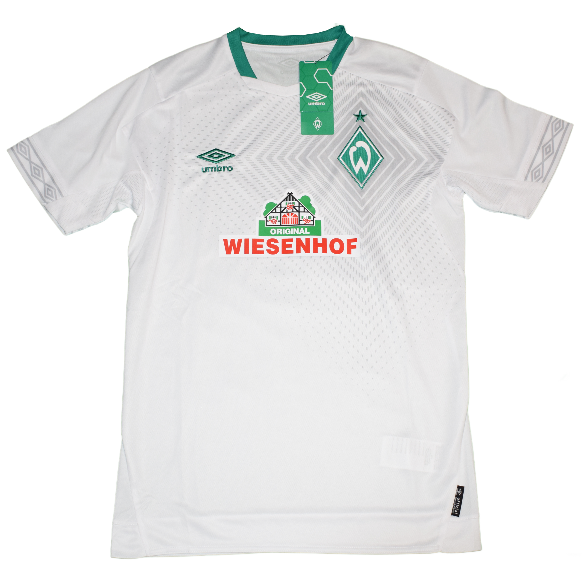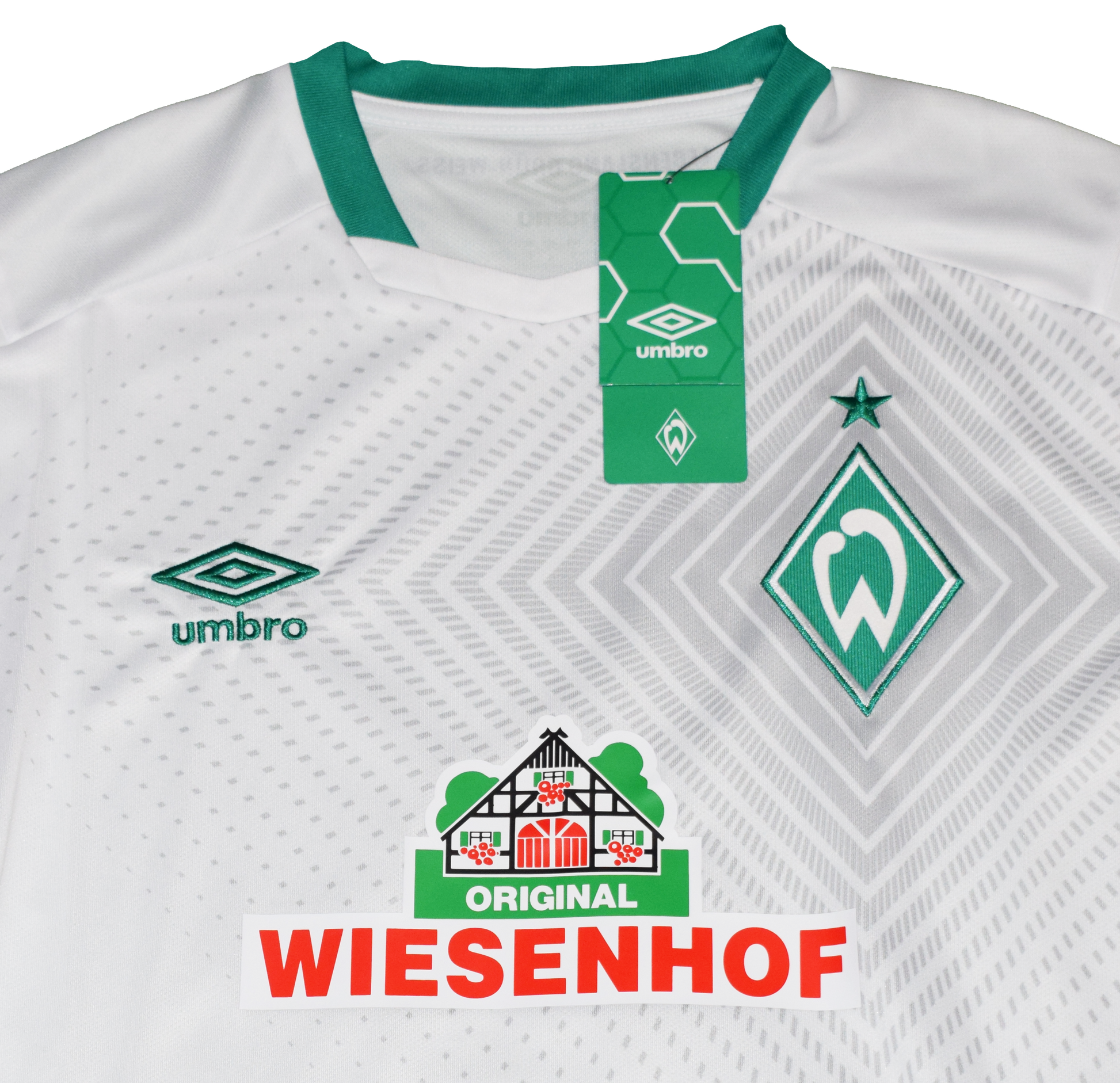 Μέγεθος Small, ολοκαίνουργια με ετικέτες (BNWT). Κατασκευασμένη από την Umbro για τη σεζόν 2018/19, αυτή είναι η τρίτη επίσημη εμφάνιση της Werder Bremen. Το σχέδιο είναι καθαρό και μοντέρνο, με μια ολόλευκη βάση με διακριτικά τονικά σχέδια στο μπροστινό μέρος. Το έμβλημα του συλλόγου είναι κεντημένο στο αριστερό στήθος, με το λογότυπο της Umbro σε πράσινο χρώμα απέναντι.
