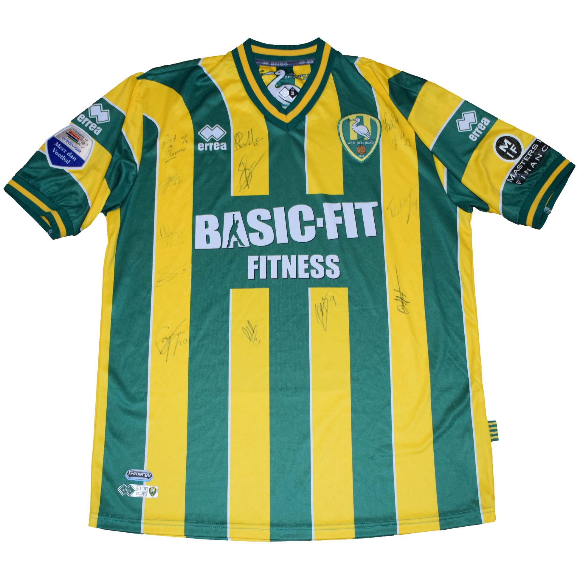 Iconic Erreà home jersey in green and yellow vertical stripes and full squad autographs across the front. This shirt is a true piece of Eredivisie history from a memorable season for ADO.