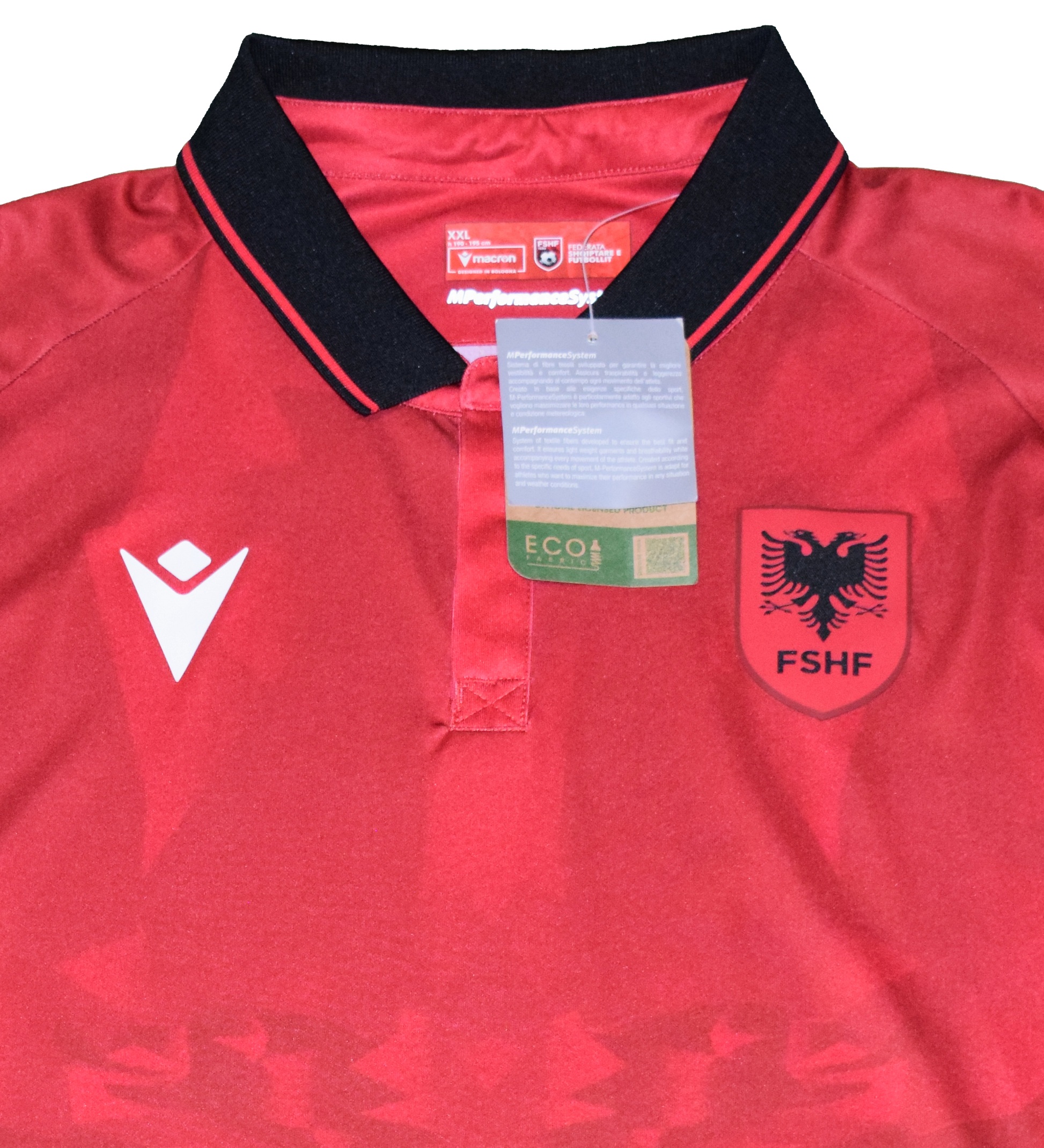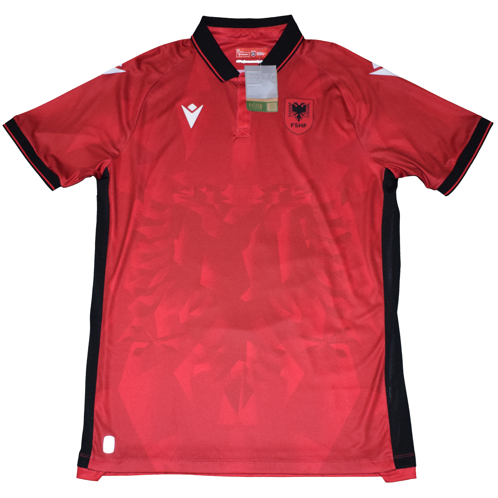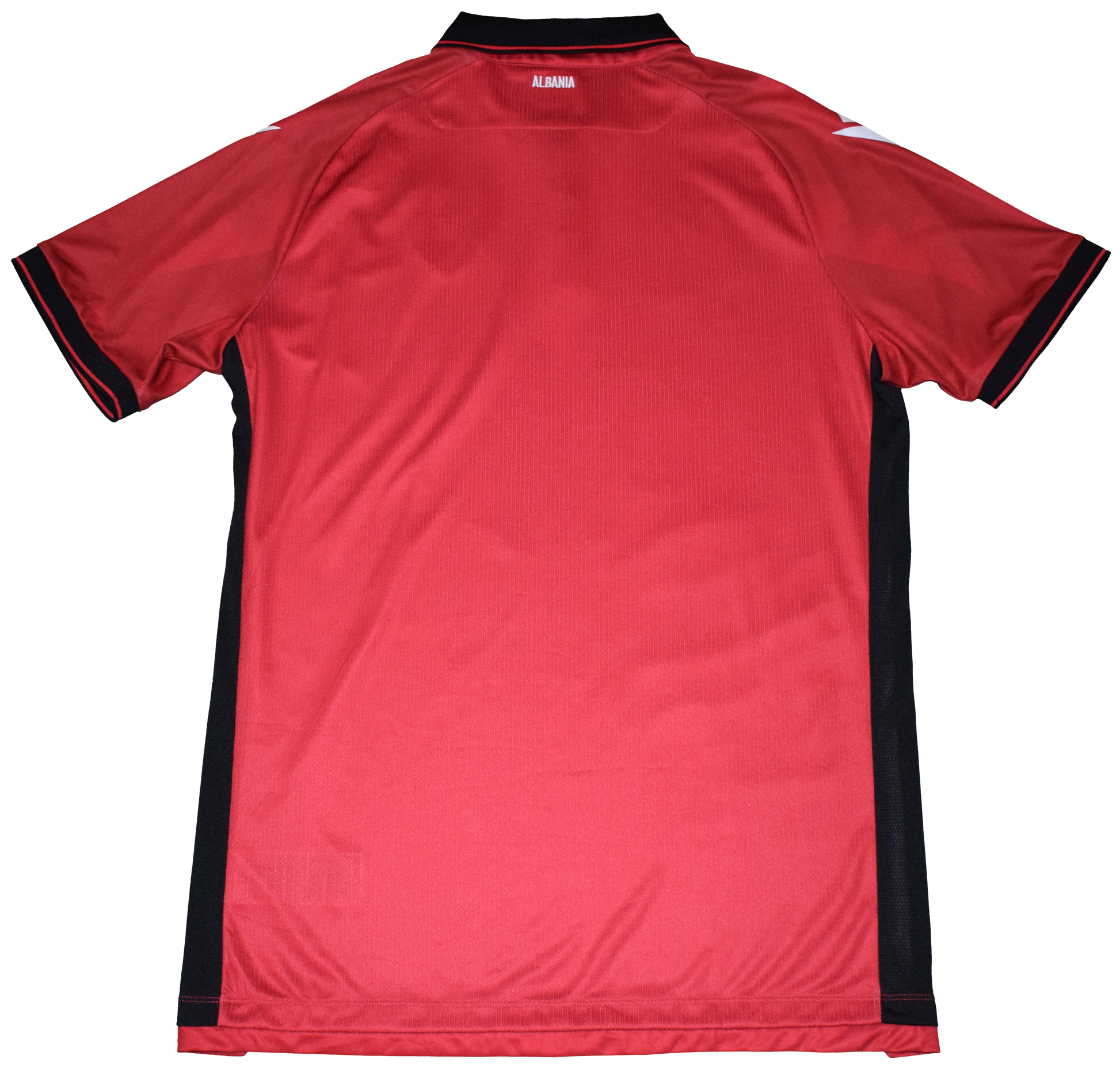 Striking red jersey made by Macron, featuring a subtle double-headed eagle across the front – the proud symbol of Albania. Official crest of the FSHF (Albanian FA) embroidered on the chest. Lightweight, breathable material and stylish collar detail.