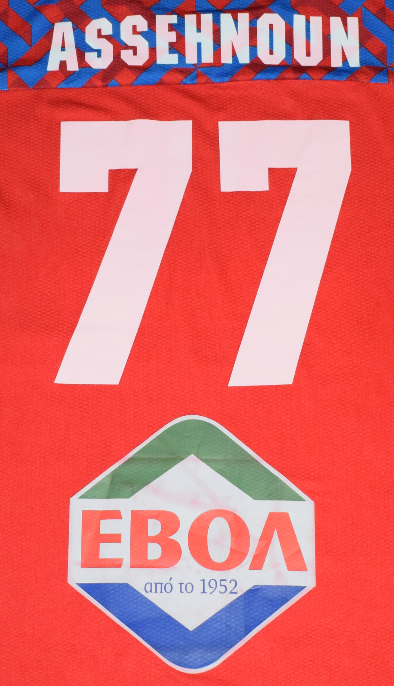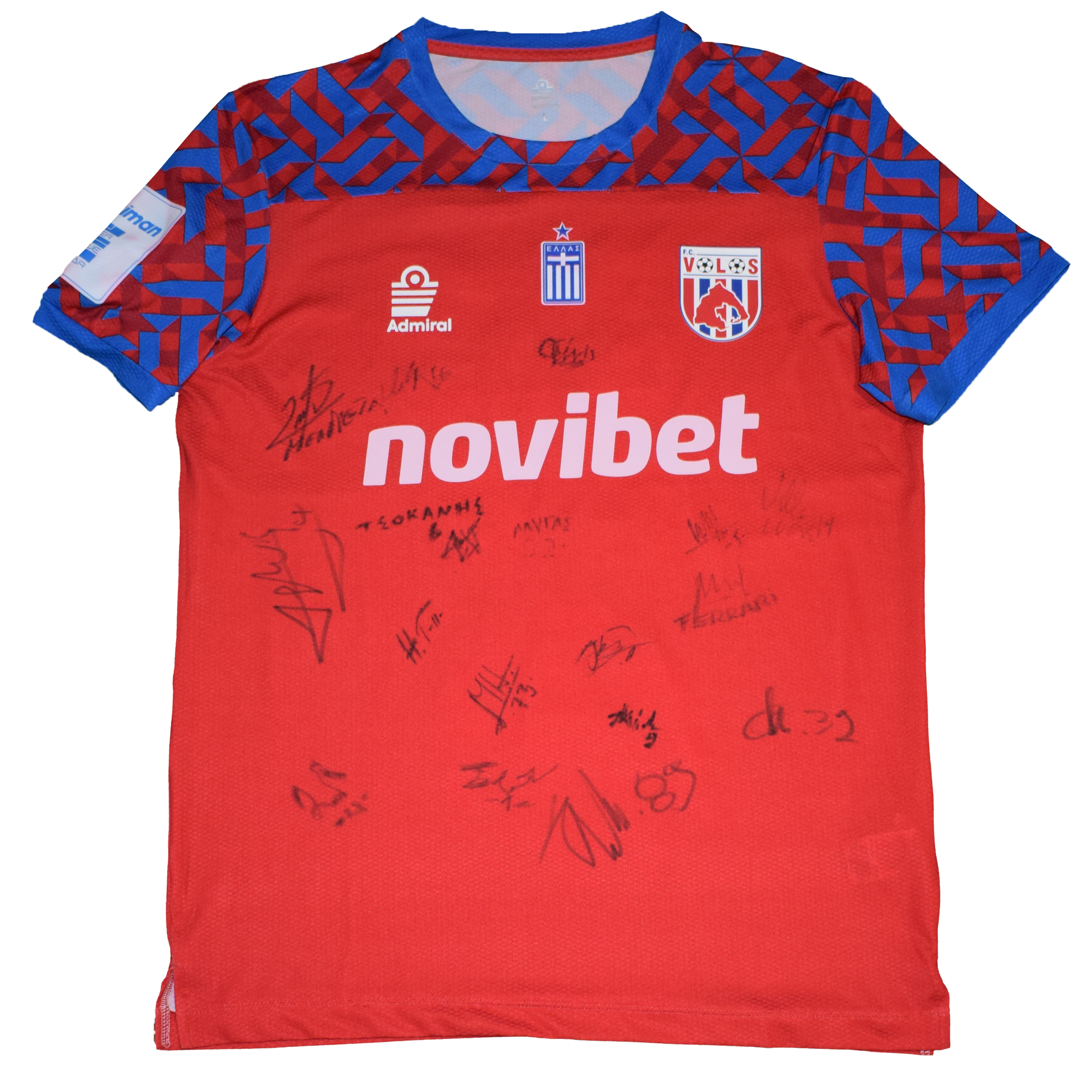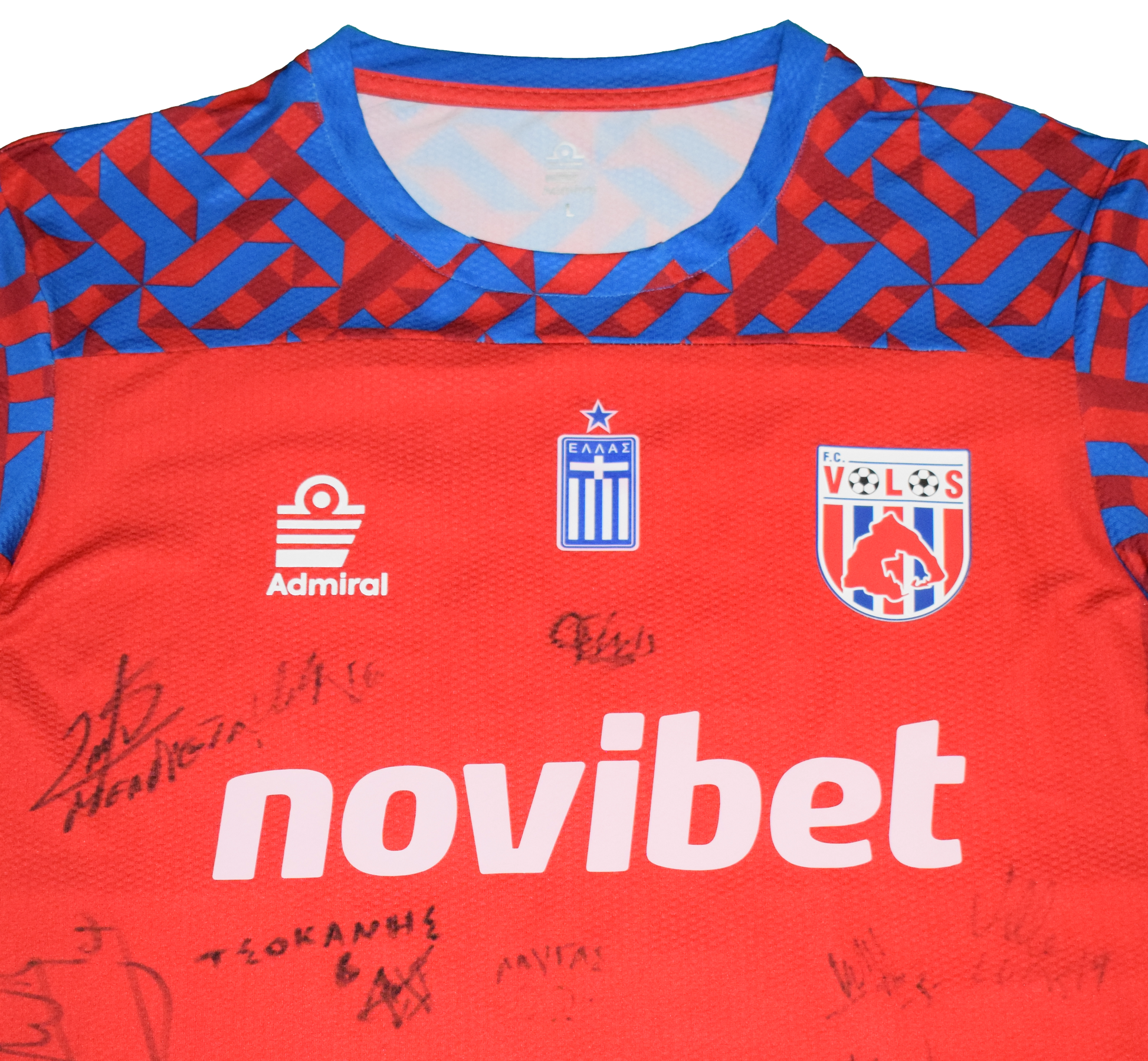 Straight from the heart of the Stixoiman Super League Play Out Round, this rare Volos FC 2024/25 away kit was worn by none other than Jasin Assehnoun in the April 23, 2025, away victory over Lamia. This striking Admiral-designed shirt in vibrant red and geometric blue sleeves features the official Greek league badge, sponsor logos, and the number 77 on the back—alongside the signature of Assehnoun himself. Even more impressively, it is covered in squad autographs, making it a true one-of-a-kind collector’s item. An exclusive piece from Volos' 2024/25 campaign—matchworn, signed, and impossible to replace.