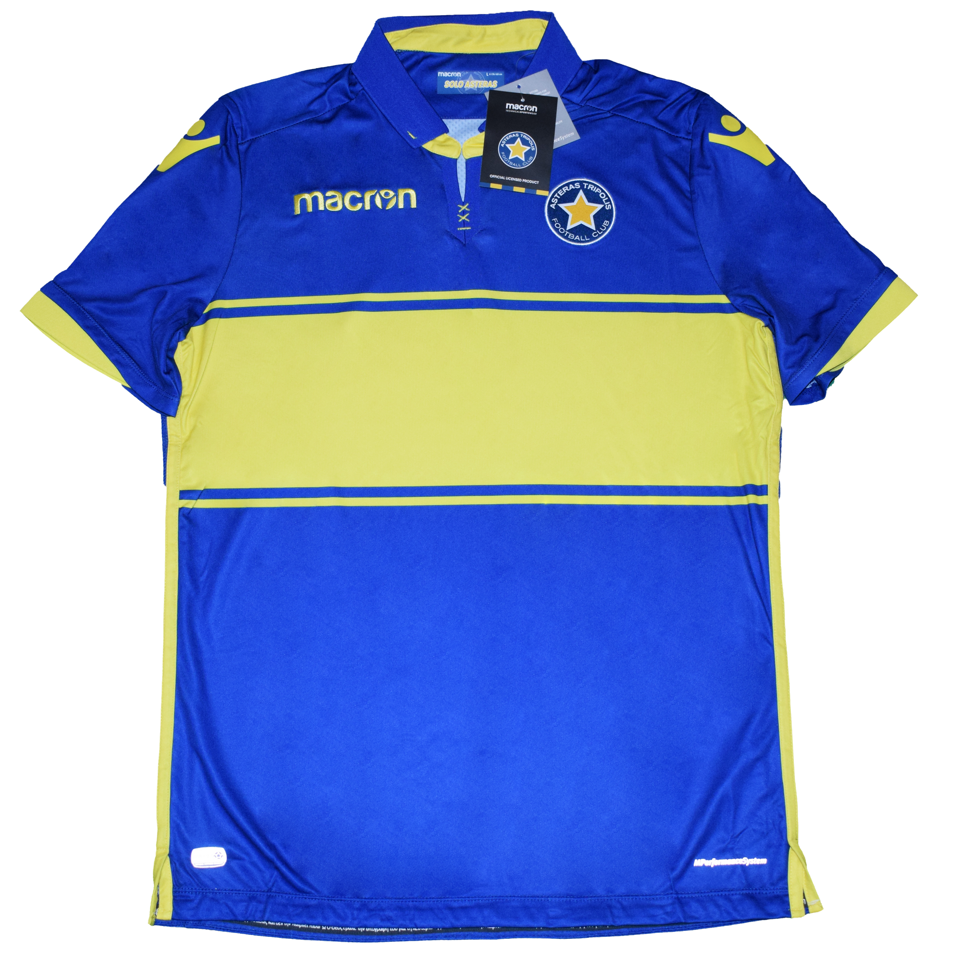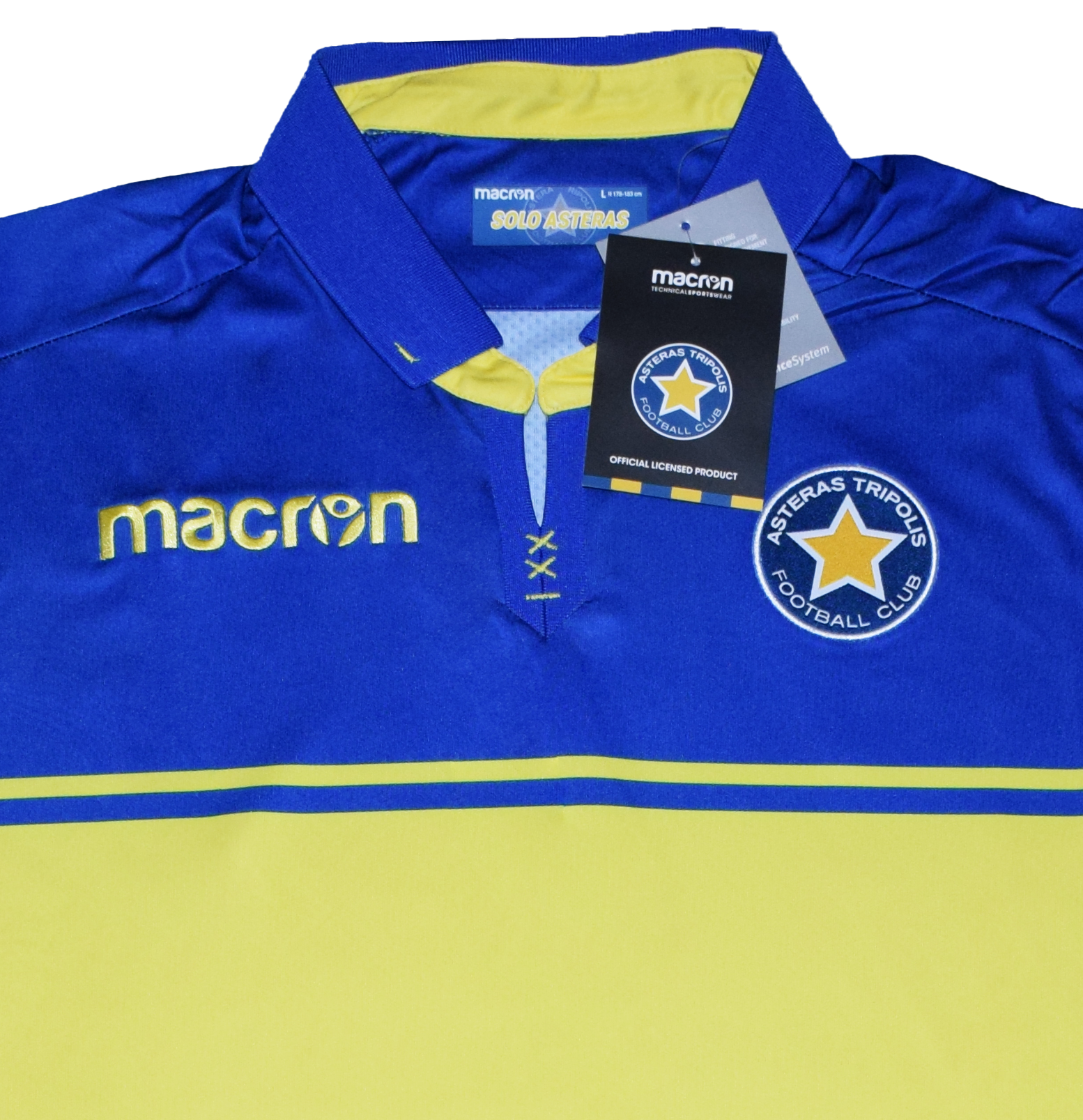 Step into the proud tradition of Greek football with the official Asteras Tripolis 2018/19 Home Jersey in Large size – Brand New With Tags. This striking design features the club’s signature royal blue and vibrant yellow colorway, crafted by Macron for both style and performance.