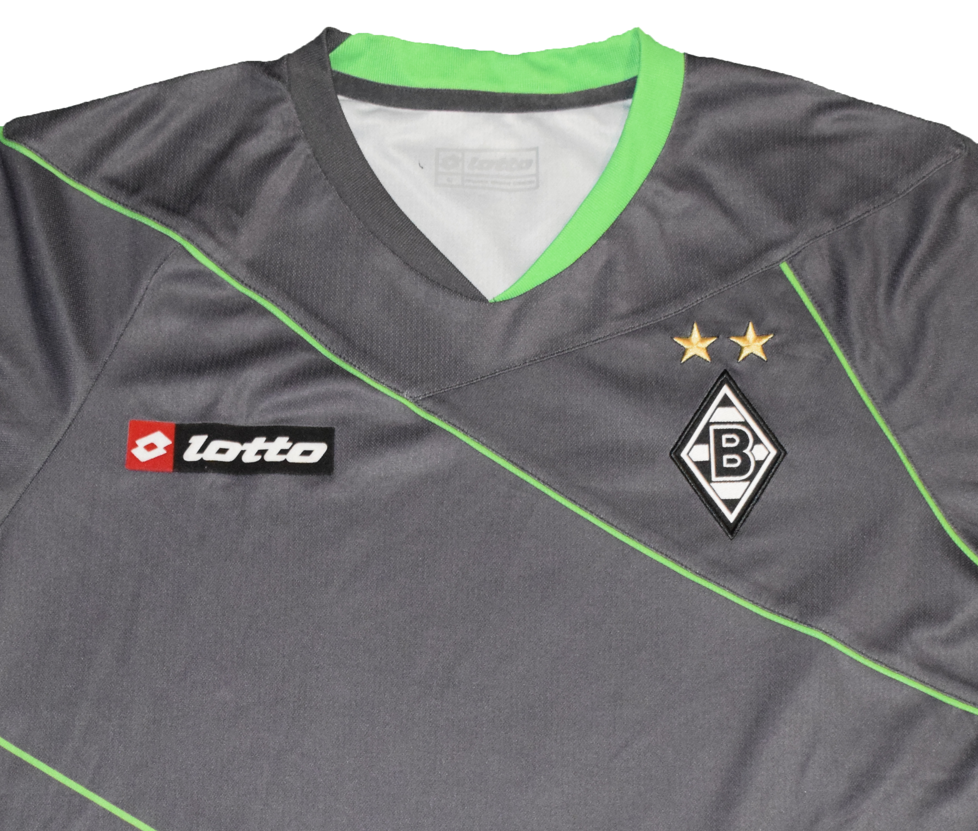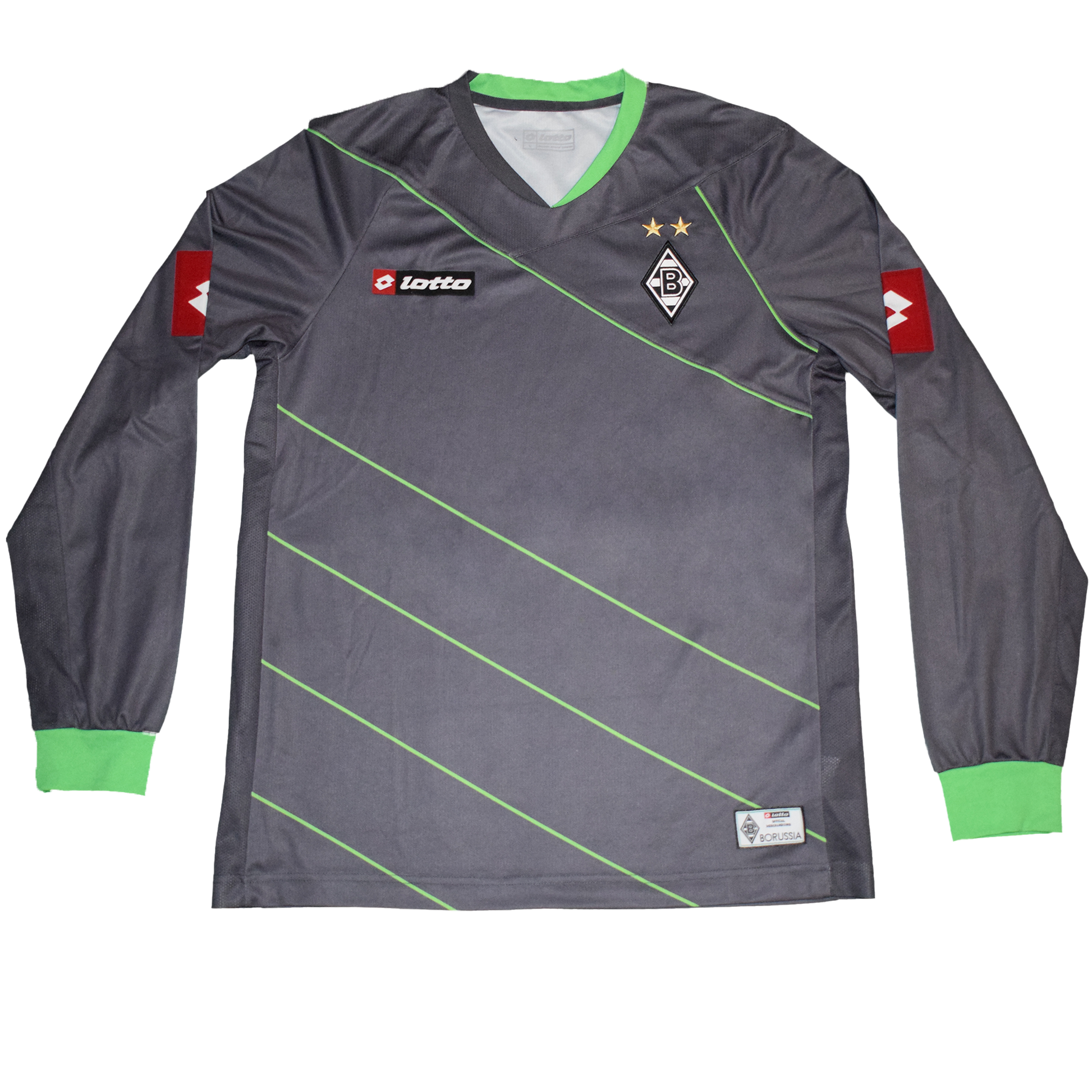 The Borussia Mönchengladbach long-sleeve away kit for the 2011/12 season is notable for its distinct design and colors, which reflected the club's identity while also appealing to fans. Manufactured by Lotto and a size Large.