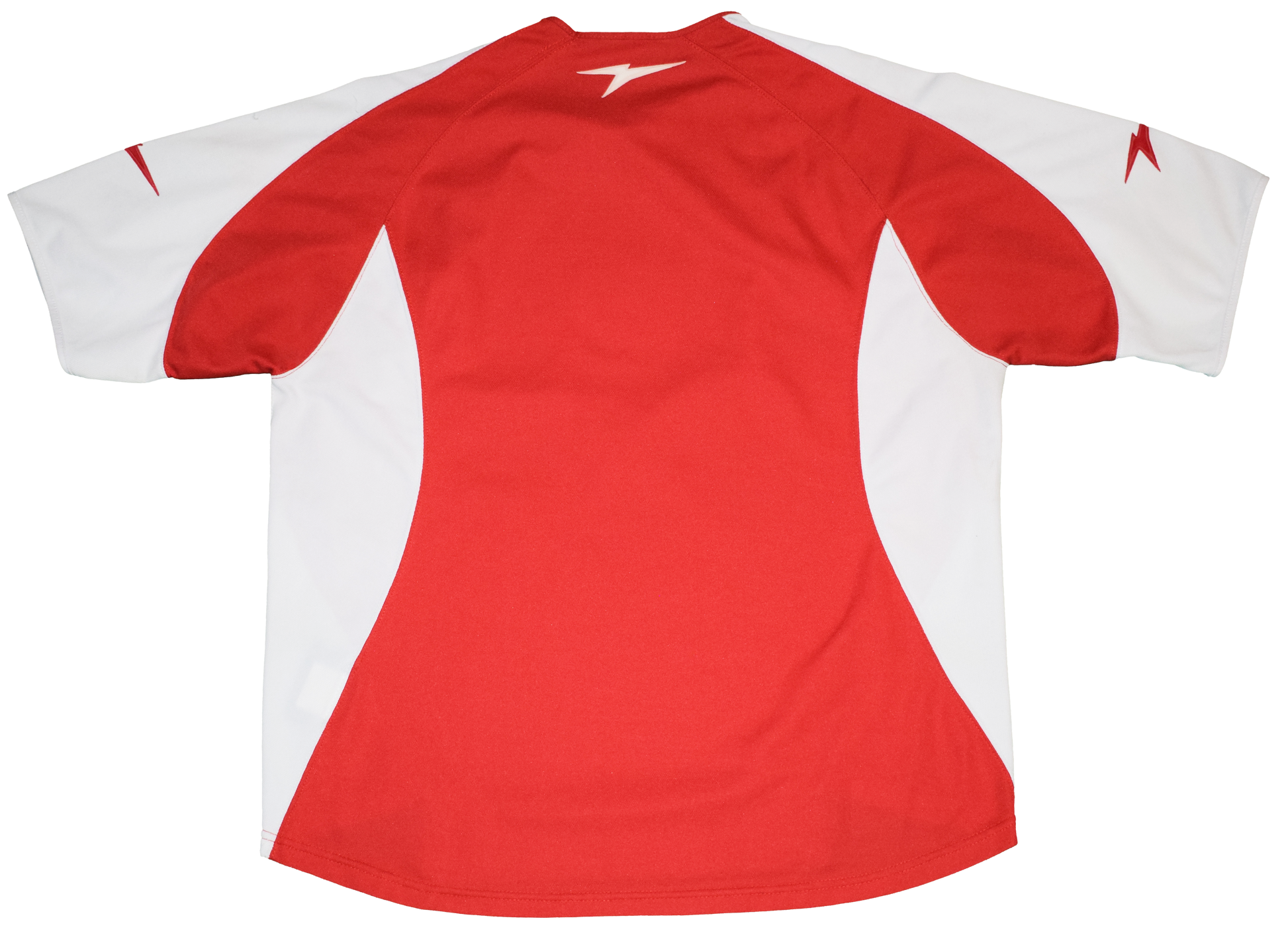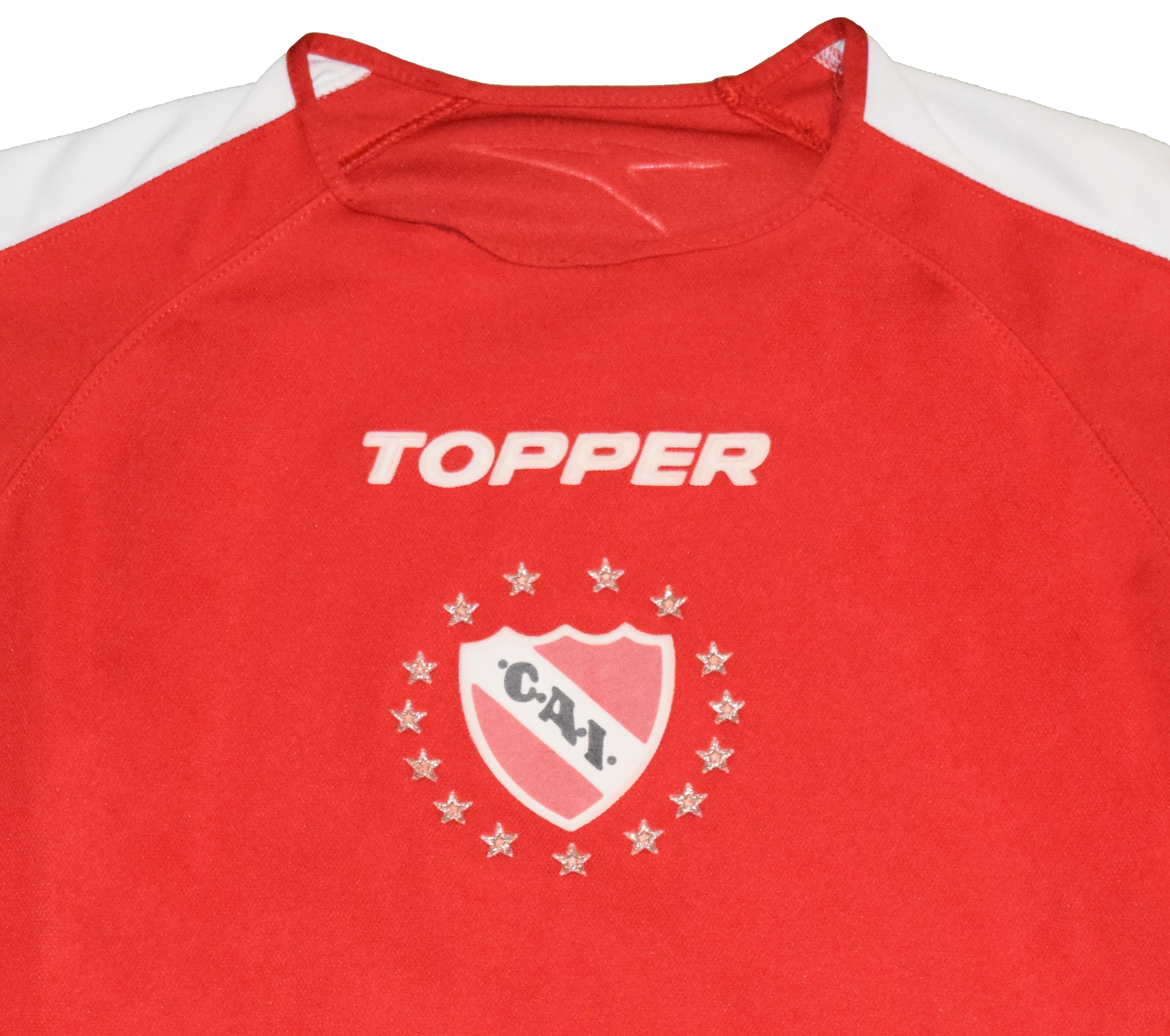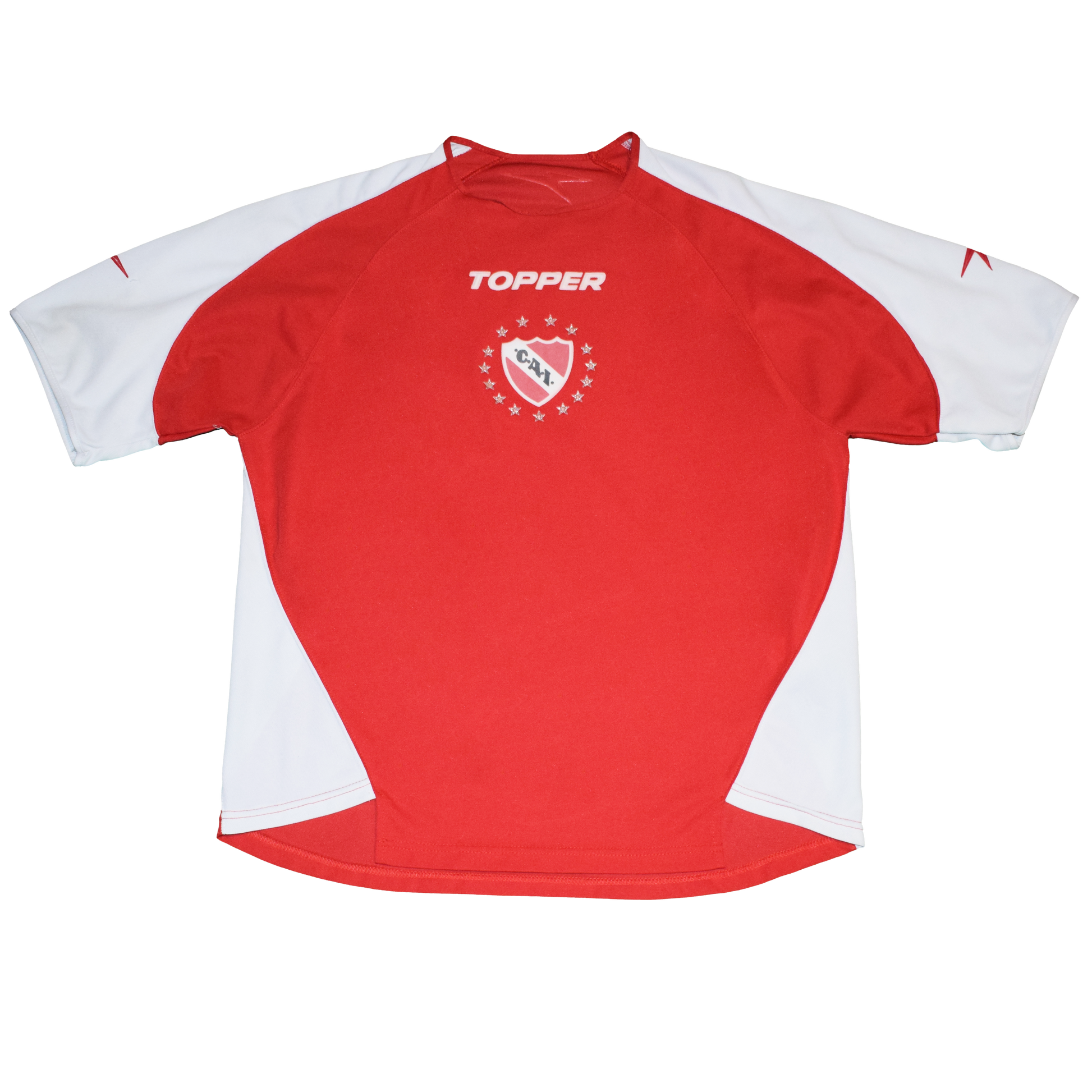 A classic red-and-white Topper training shirt worn by Club Atlético Independiente during the 2003/04 season. The shirt features a clean, dynamic design with the iconic CAI badge proudly displayed at the chest—although in this particular piece, the crest shows visible fading, adding to its vintage authenticity and character. This detail reflects the wear typical of kits used in high-intensity sessions.