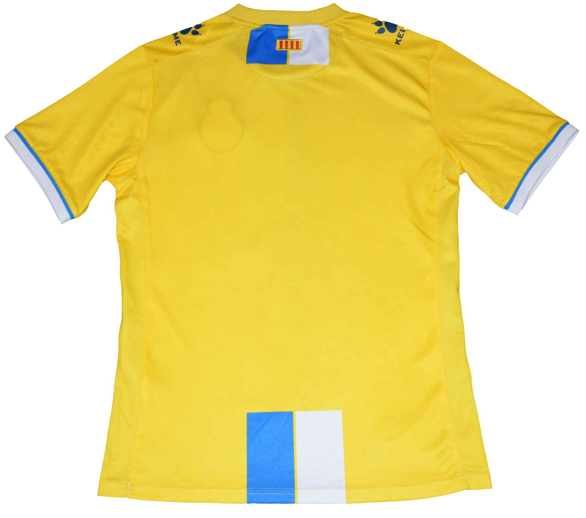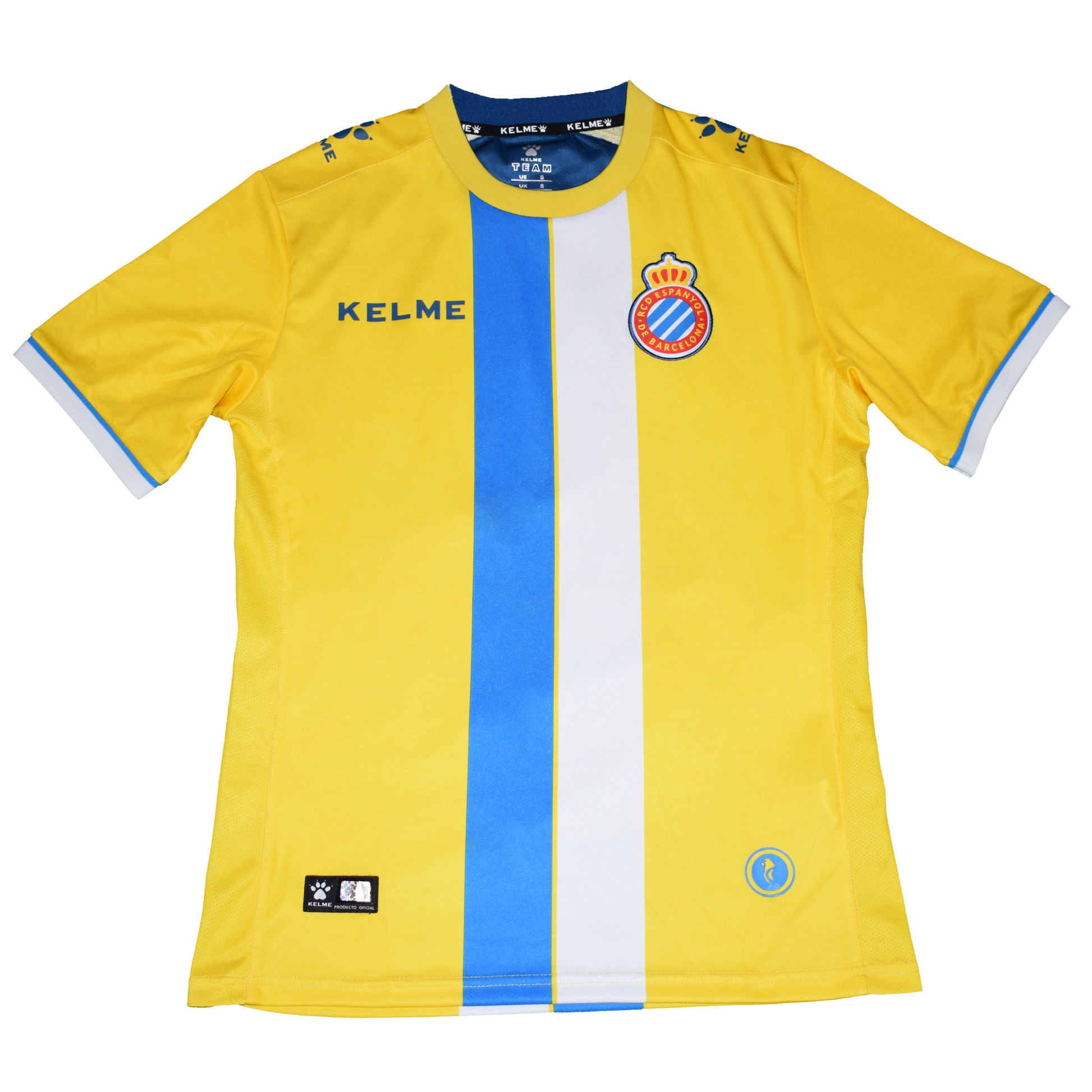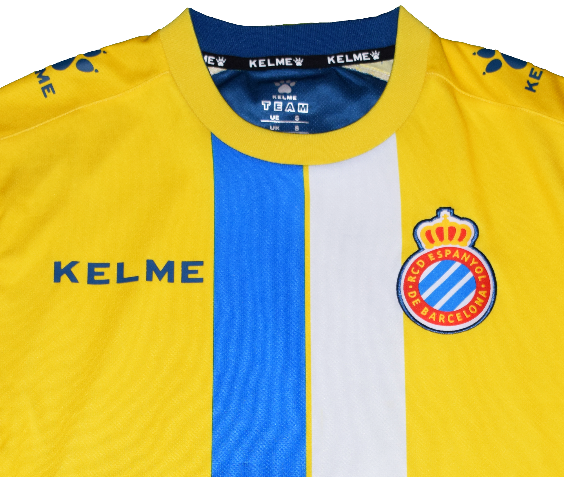 This striking Espanyol 2018/19 Home Kit features a vibrant yellow base with bold blue and white central stripes, crafted by Kelme in a clean, modern design. This rare variation of the home kit blends tradition with a standout look worn during a memorable season for Los Pericos.