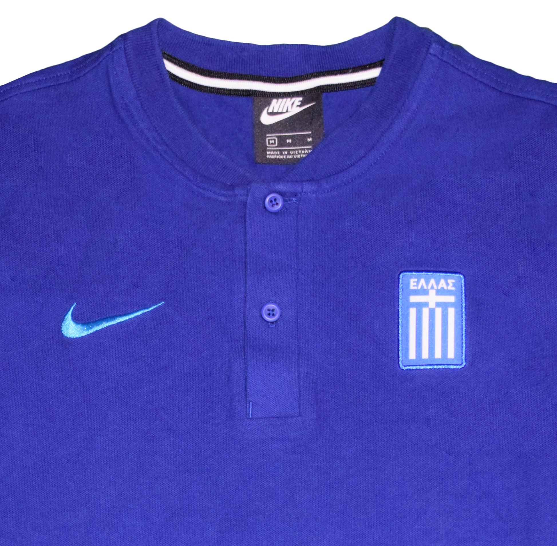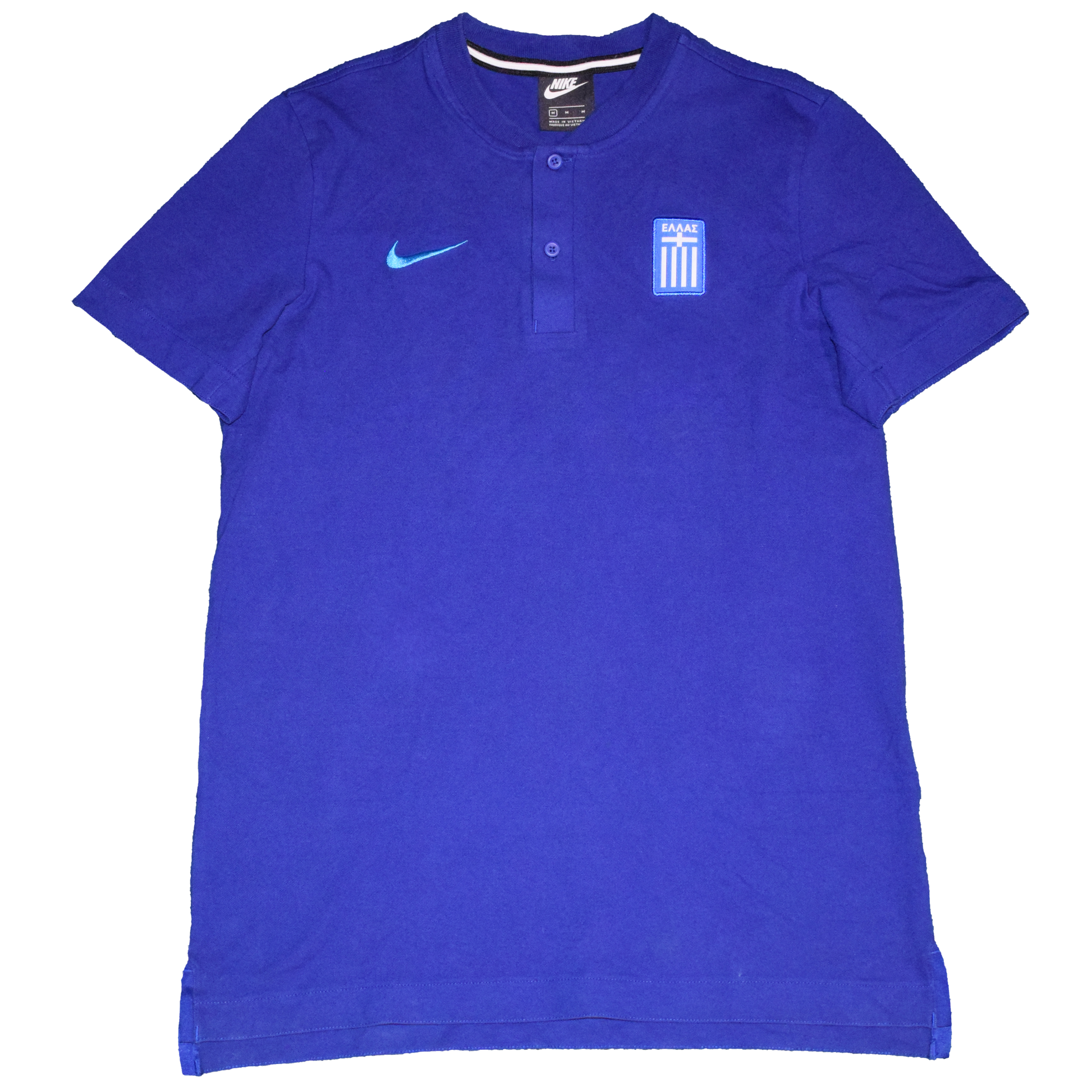 This official Hellenic Football Federation (EPO) polo shirt is a sleek, minimalist piece worn by coaching staff and players during the early 2020s. The deep blue tone reflects the traditional Greek colours, with a clean embroidered crest and a subtle Nike swoosh in cyan blue.