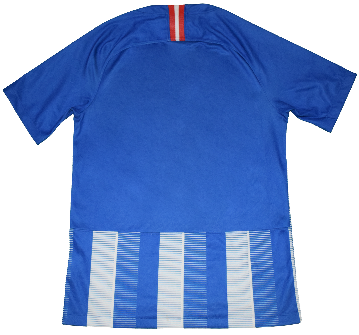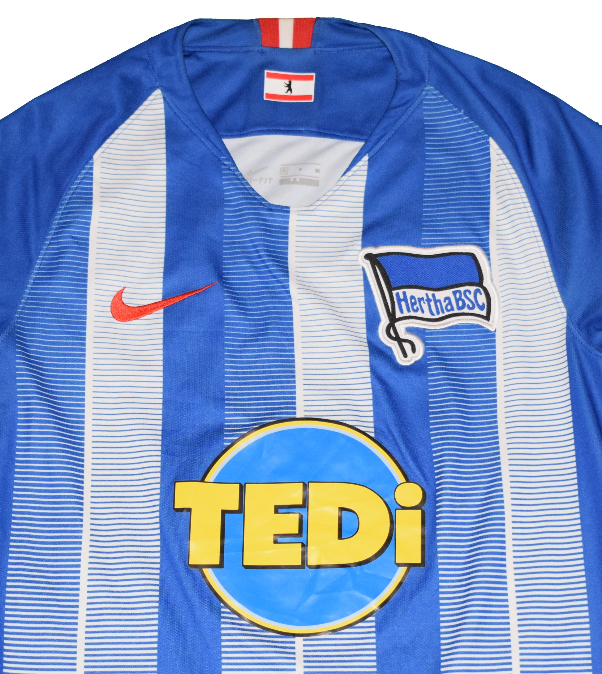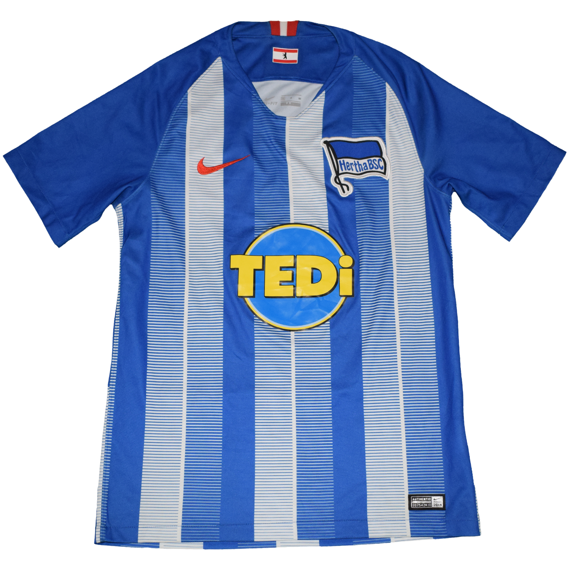 This Hertha kit is in excellent condition and a size Small. It was manufactured by Nike. It features the Berlin flag on the inside of the neck.