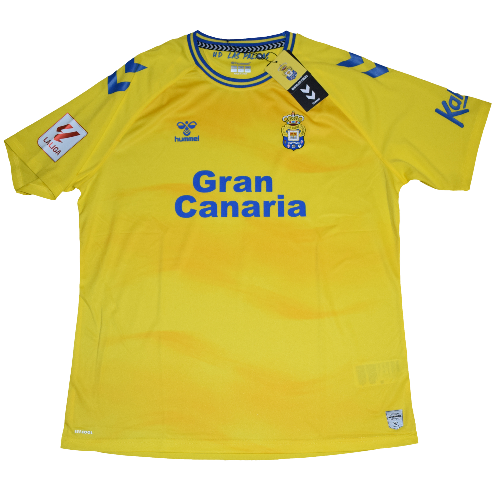 Show your passion for UD Las Palmas with the official 2023/24 Home Kit, crafted by Hummel. Designed in the club’s iconic vibrant yellow, this jersey features a subtle wave pattern that pays homage to the stunning coastal beauty of Gran Canaria. The royal blue details on the collar and sleeves add a sleek contrast, while the club’s crest sits proudly on the chest, symbolizing the rich footballing heritage of Los Amarillos. Size is XL. Has official La Liga patch.