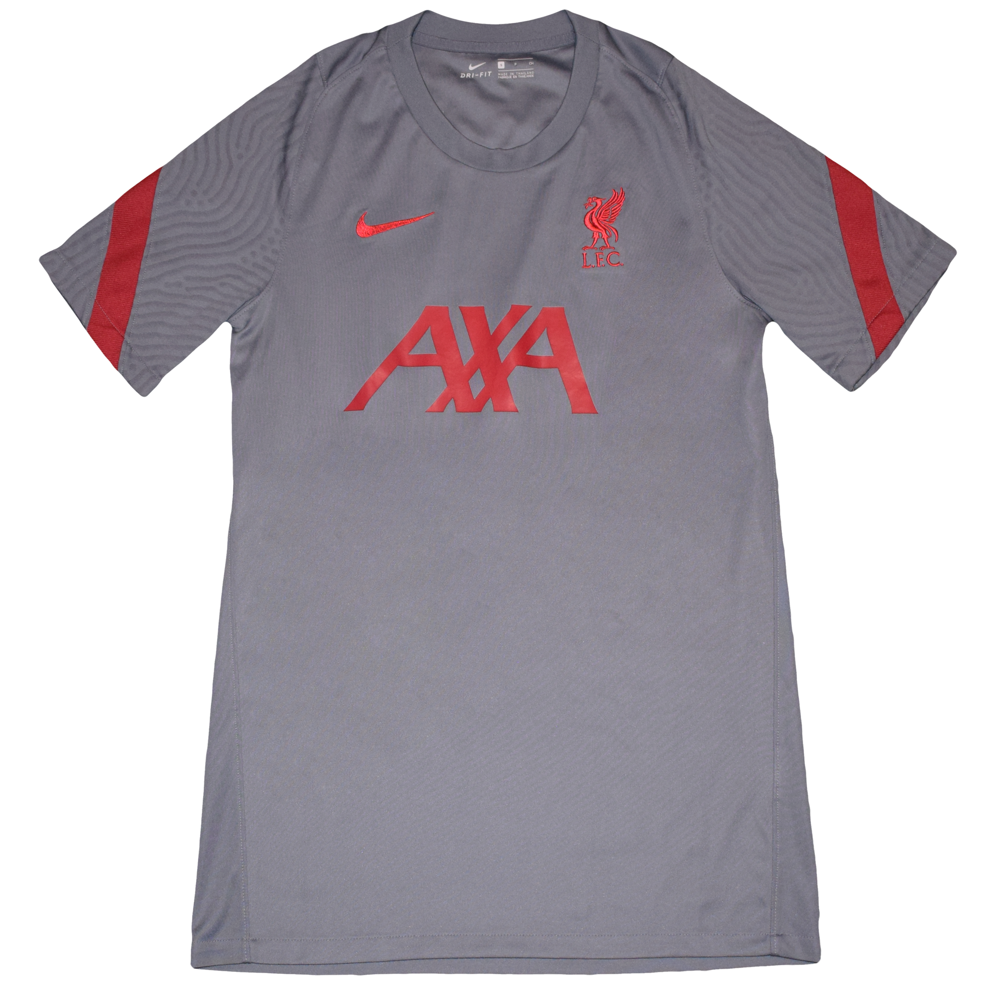 Official Liverpool training kit from the 2020/21 season, made by Nike in grey with red detailing. Designed for comfort and performance, this kit features a modern fit and lightweight fabric suitable for training or casual wear.