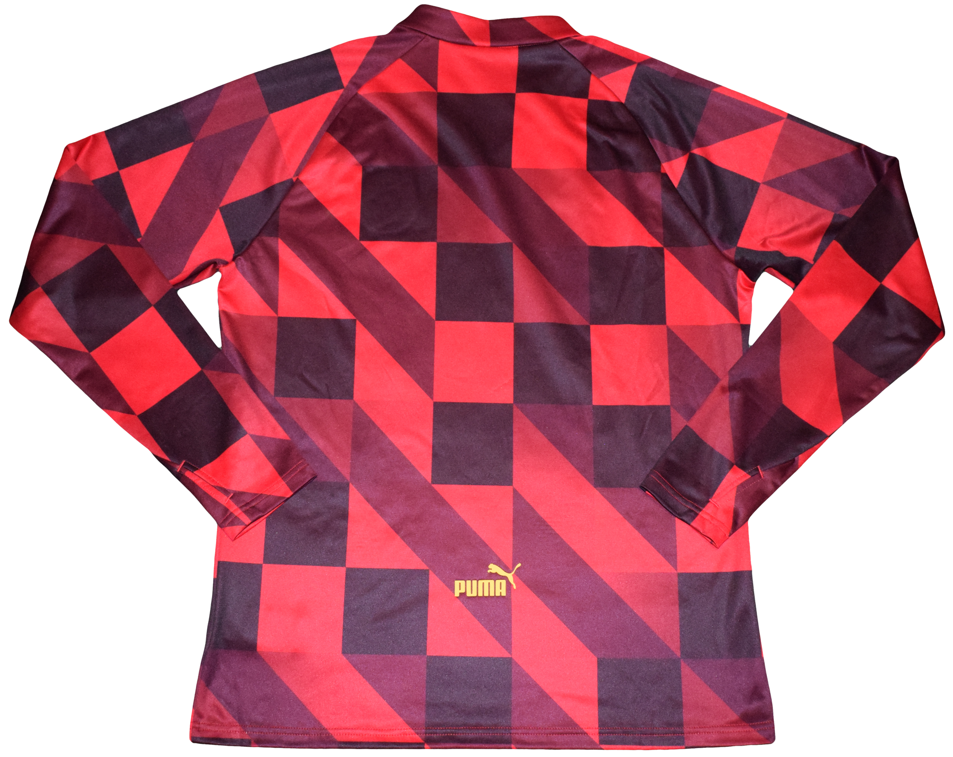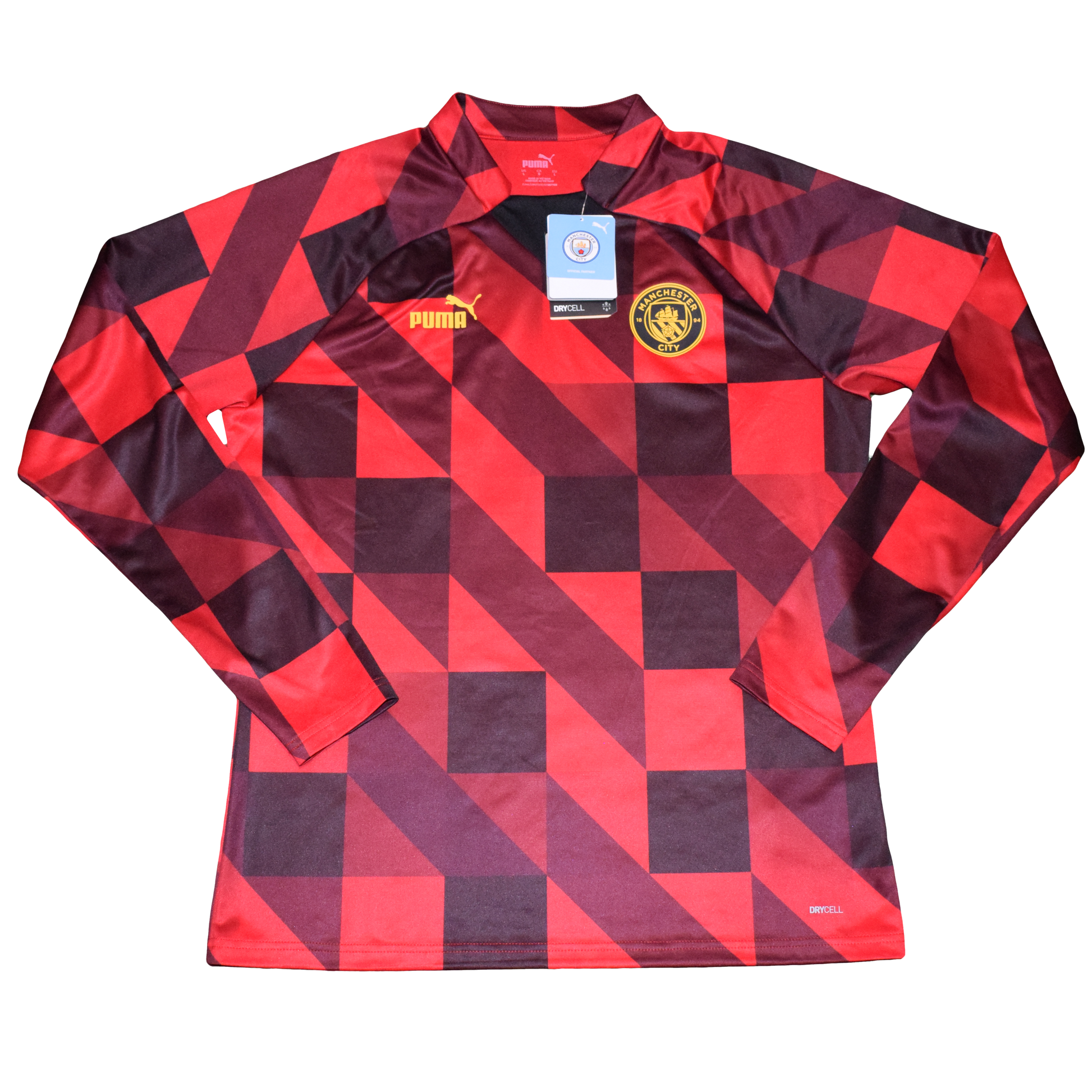 Gear up like the champions with this official Manchester City 2022/23 pre-match long sleeve training shirt in Large, brand-new-with-tags (BNWT). Designed by Puma, this shirt features a dynamic tango red and black geometric pattern, reflecting the club's modern aesthetic and energy.