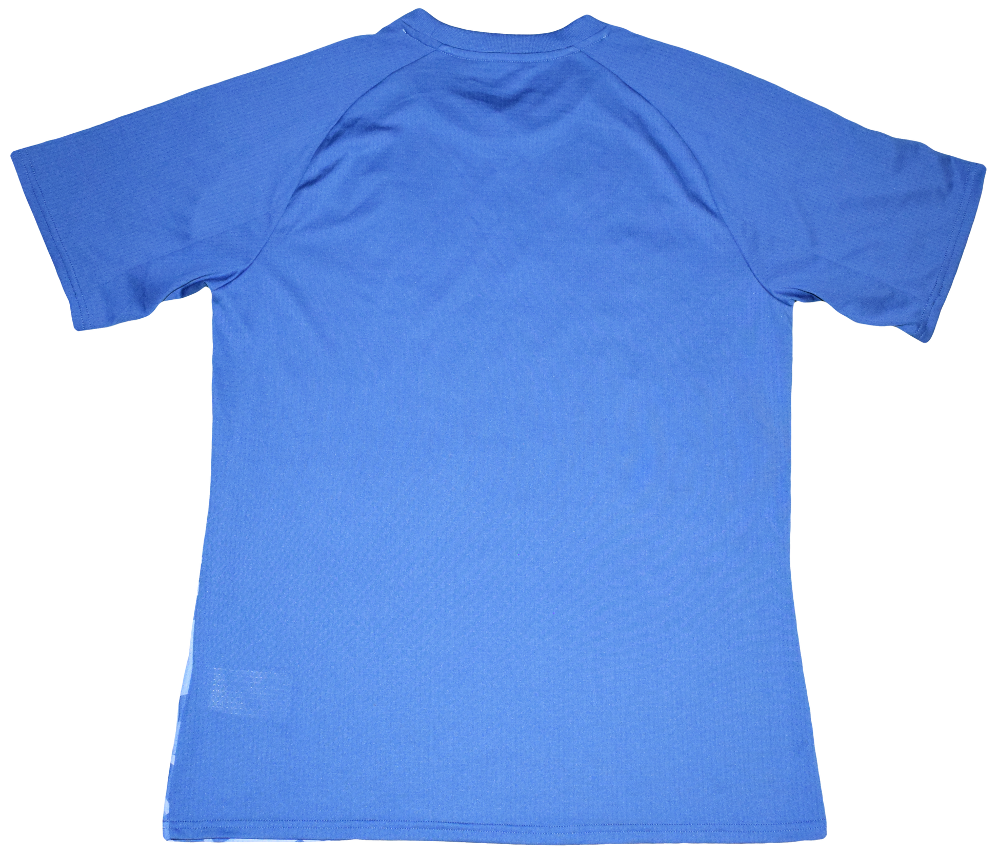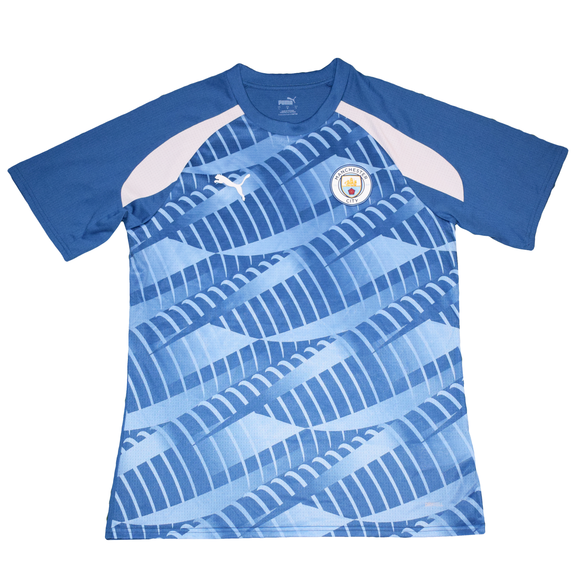 Official Manchester City 2023/24 Pre-Match Shirt, size Large, made by Puma. Features a striking blue geometric pattern inspired by the Etihad Stadium’s architecture, with white shoulder accents and the club crest printed on the chest.