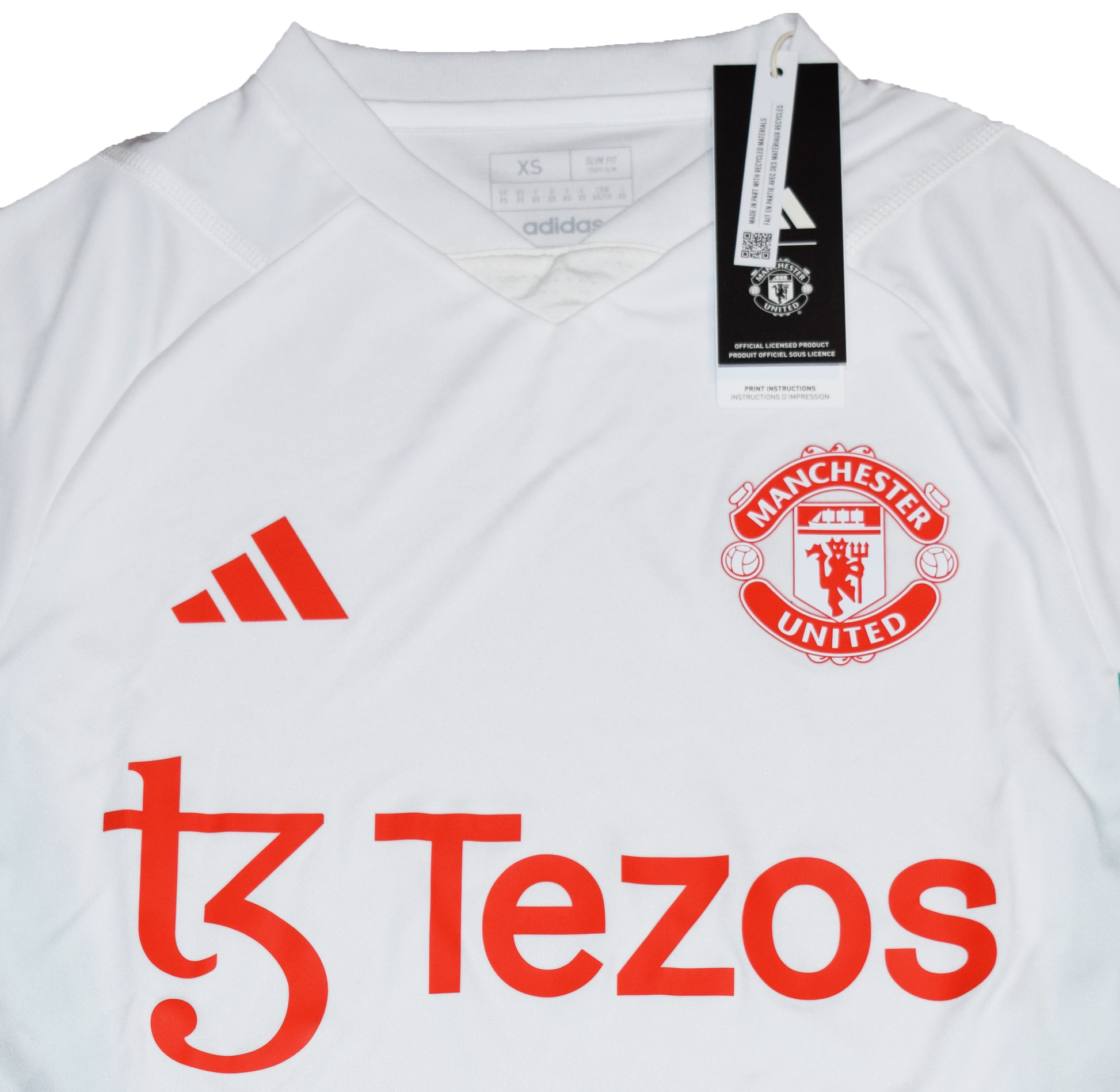 Official Adidas training jersey in white with red accents. Features red Tezos sponsor, monochrome red crest, and Adidas branding. Includes green side mesh panels, AEROREADY fabric, slim athletic fit. Size XS, brand new with tags.