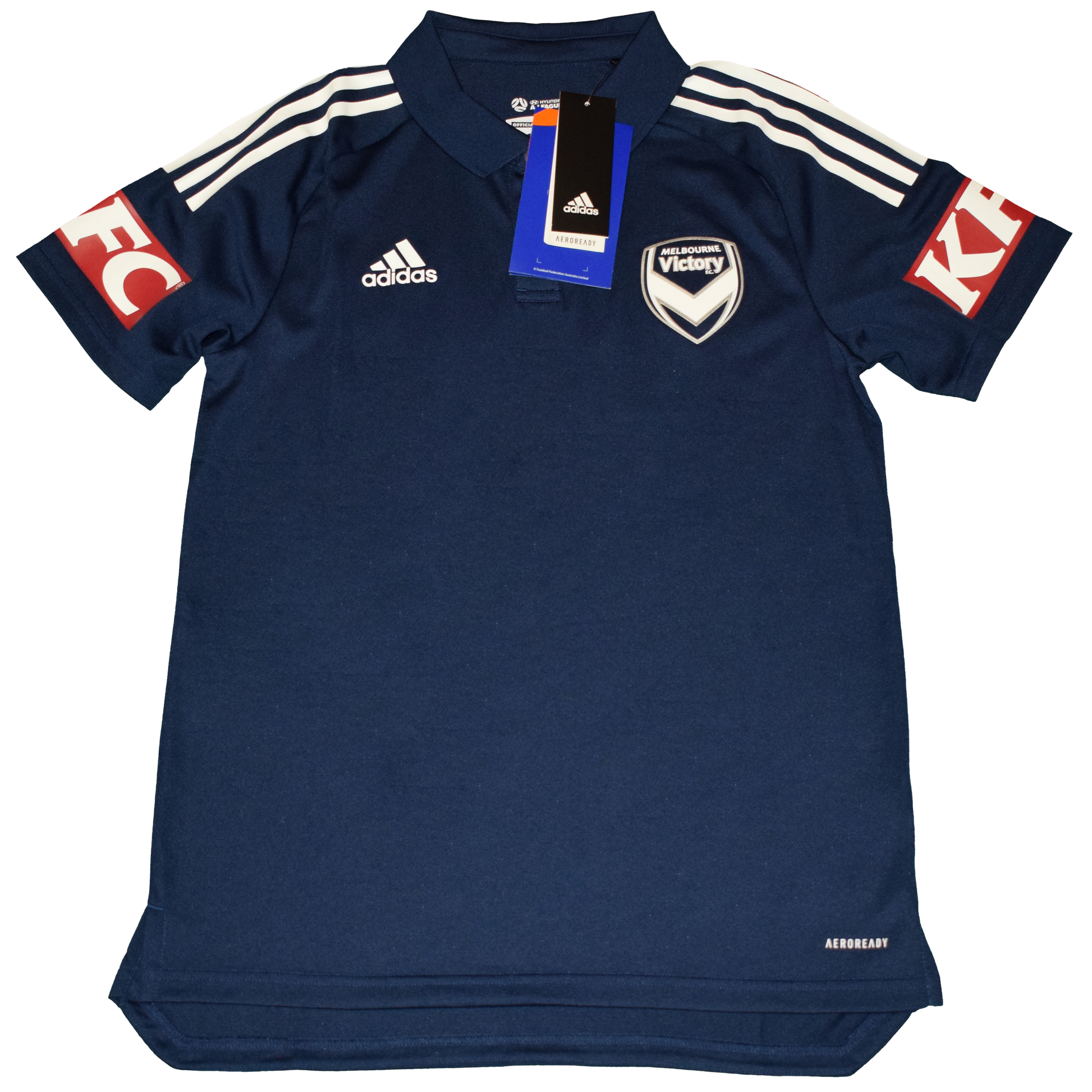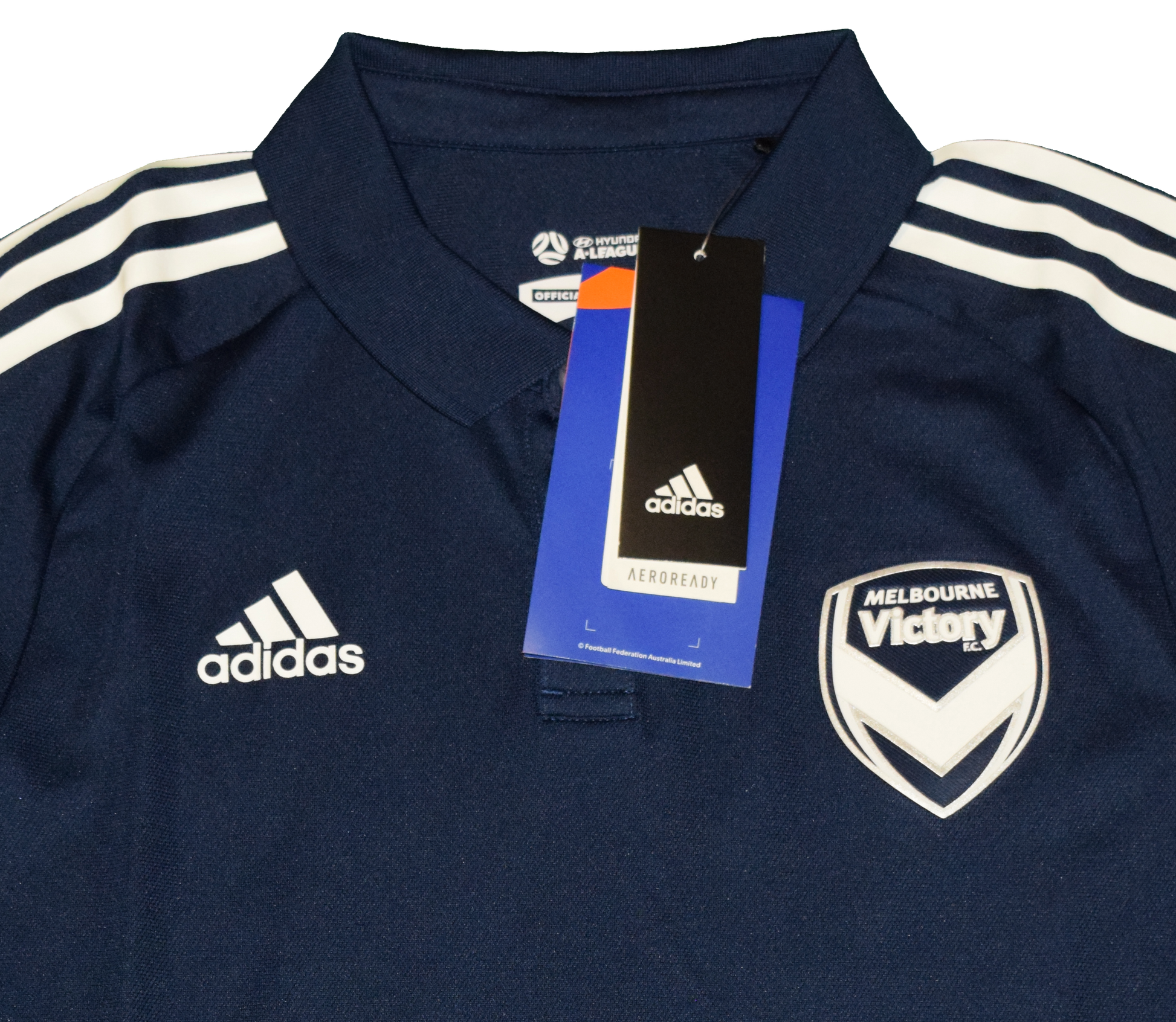 Official Adidas training polo for Melbourne Victory FC from the 2019/20 A-League season. Features the iconic navy base with white shoulder stripes and prominent sleeve sponsor KFC. The club crest and Adidas logo are embroidered on the front, while the lightweight AEROREADY fabric ensures comfort and breathability. Brand new with tags attached, this polo was part of the squad's official training and travel wear during a competitive season that saw players like Ola Toivonen, Elvis Kamsoba, and Robbie Kruse feature prominently.
