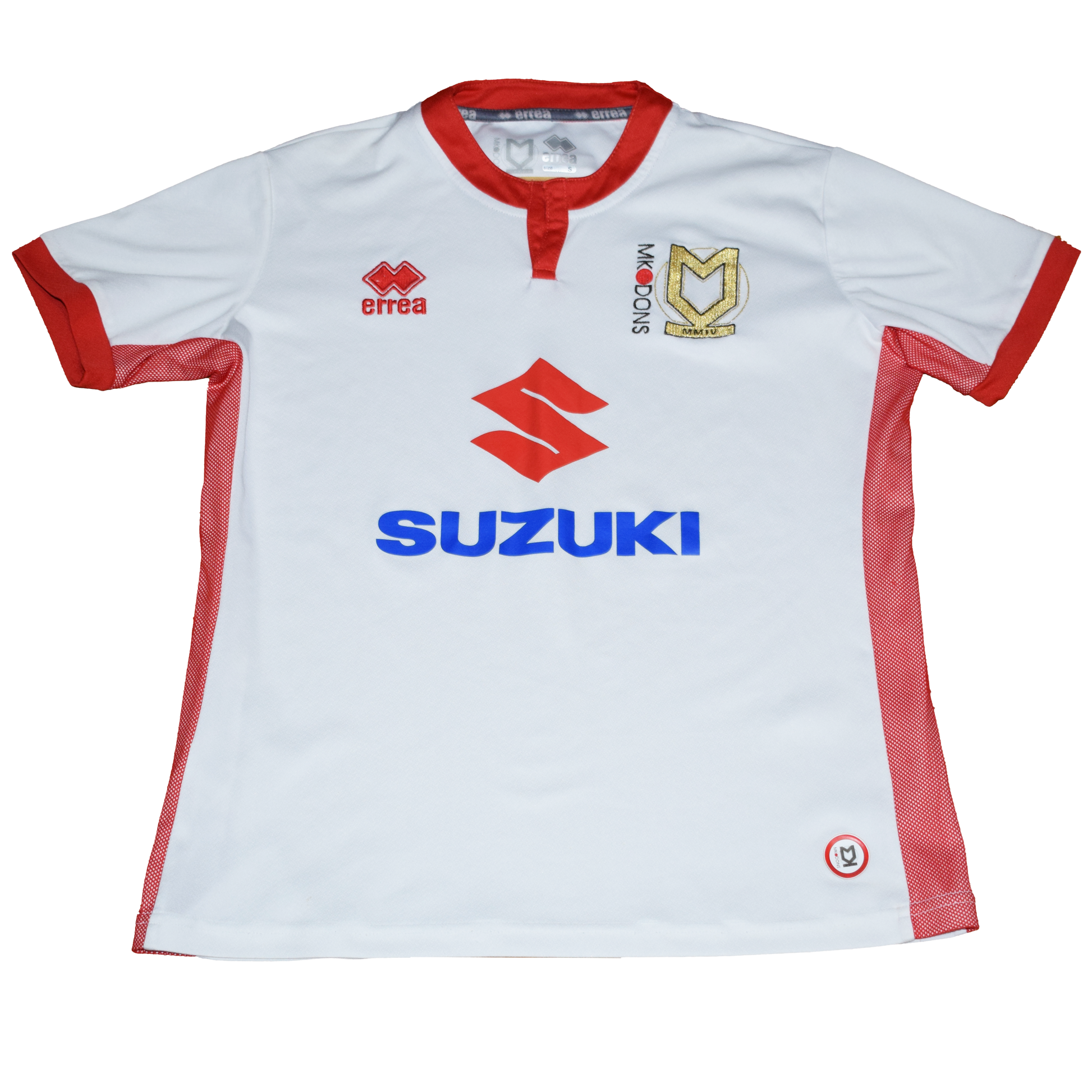 The MK Dons 2017/18 home kit, crafted by Italian sportswear brand Erreà, features a clean and modern design that pays homage to the club’s traditional colors. The front prominently displays the red Suzuki logo, reflecting the club’s principal sponsor since 2014. Size Small. Good Condition.