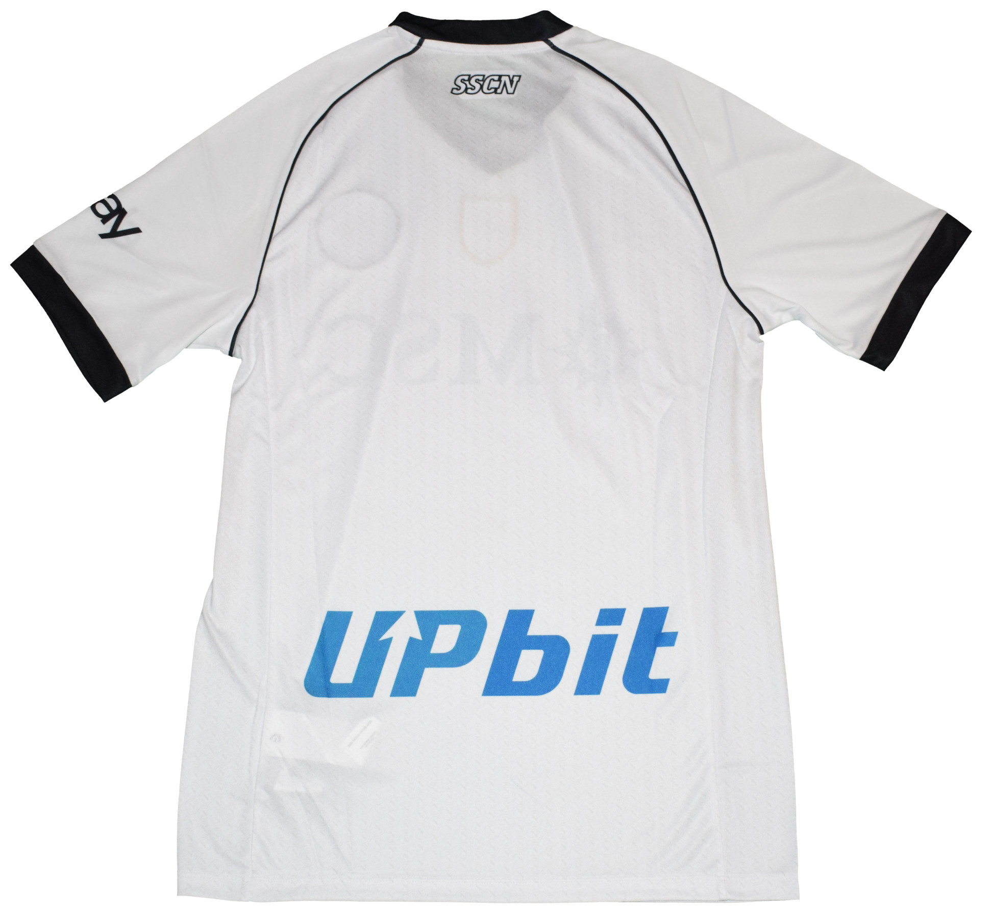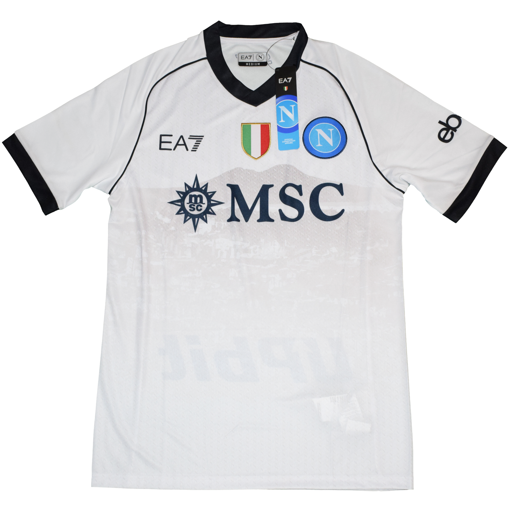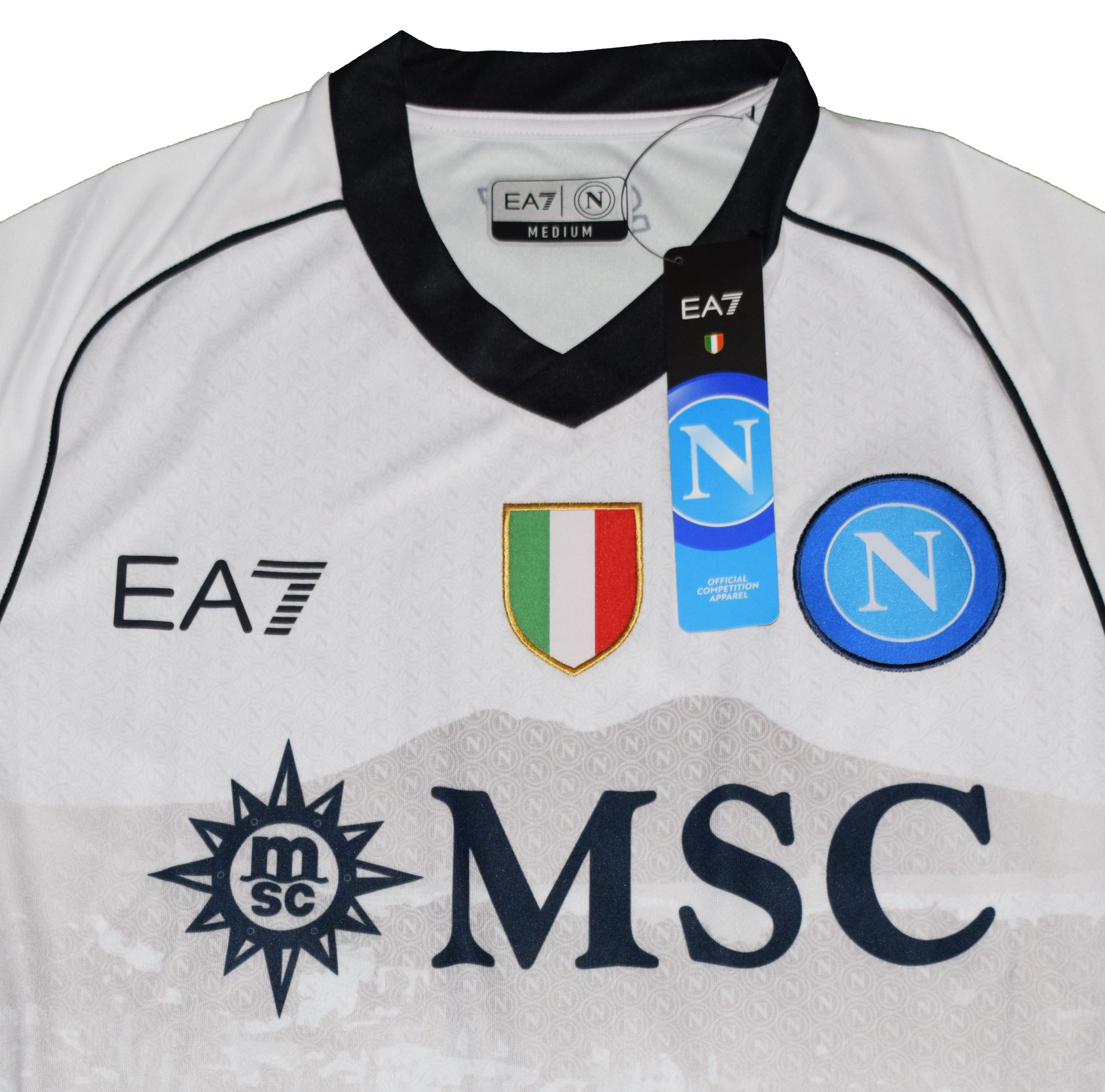 Size Medium, Brand New with Tags (BNWT). This is the official 2023/24 SSC Napoli away kit, produced by EA7 (Emporio Armani). The shirt comes in a crisp white color with black detailing on the collar, cuffs, and piping, offering a clean, modern look. The Italian Scudetto patch is proudly displayed in the center of the chest, marking Napoli as reigning Serie A champions. The club crest is stitched on the left chest, and the EA7 logo sits opposite.