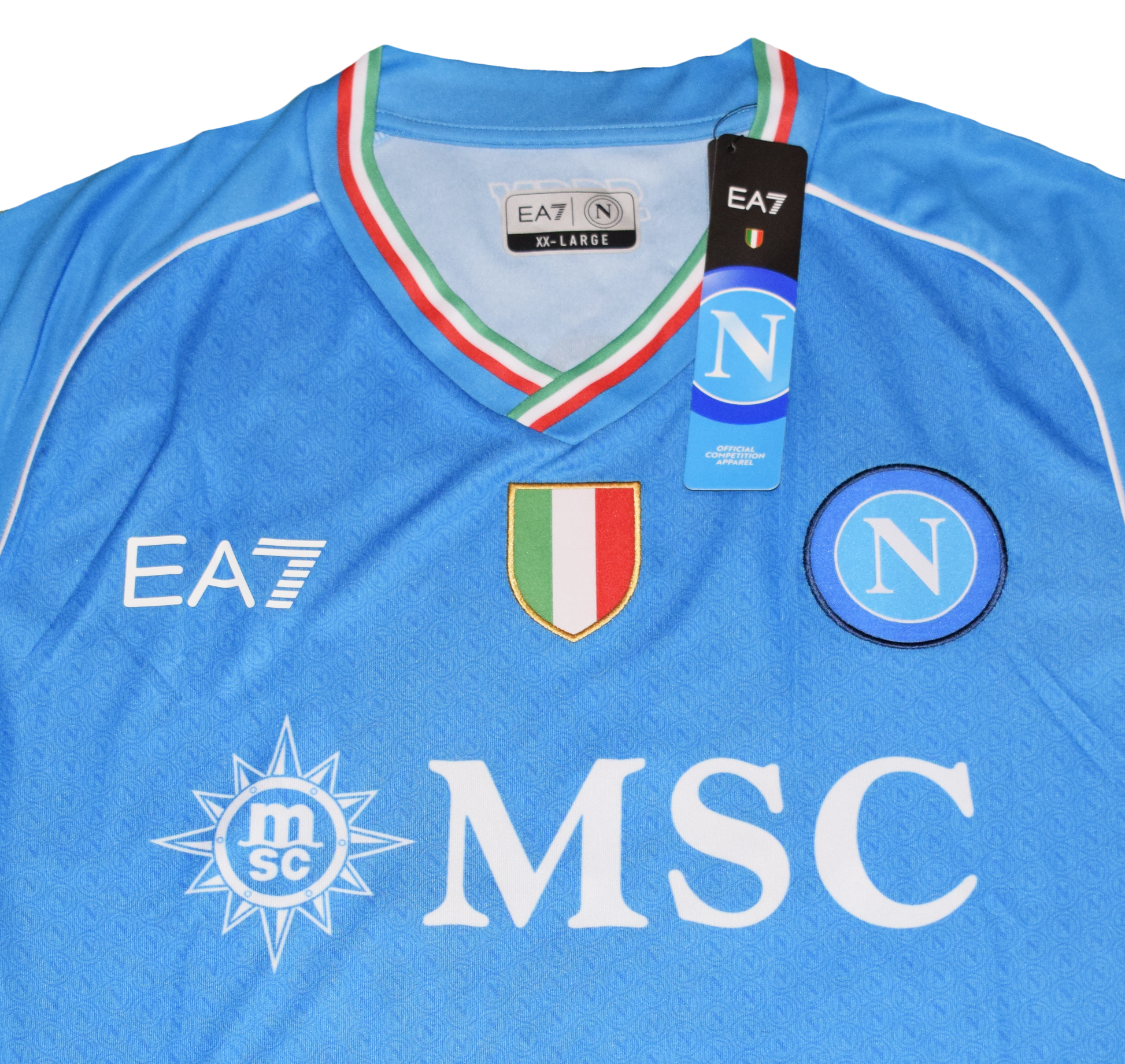 A premium EA7 Napoli home shirt, combining luxury tailoring with official player detailing, a must-have for fans of Osimhen and collectors of modern Serie A kits.