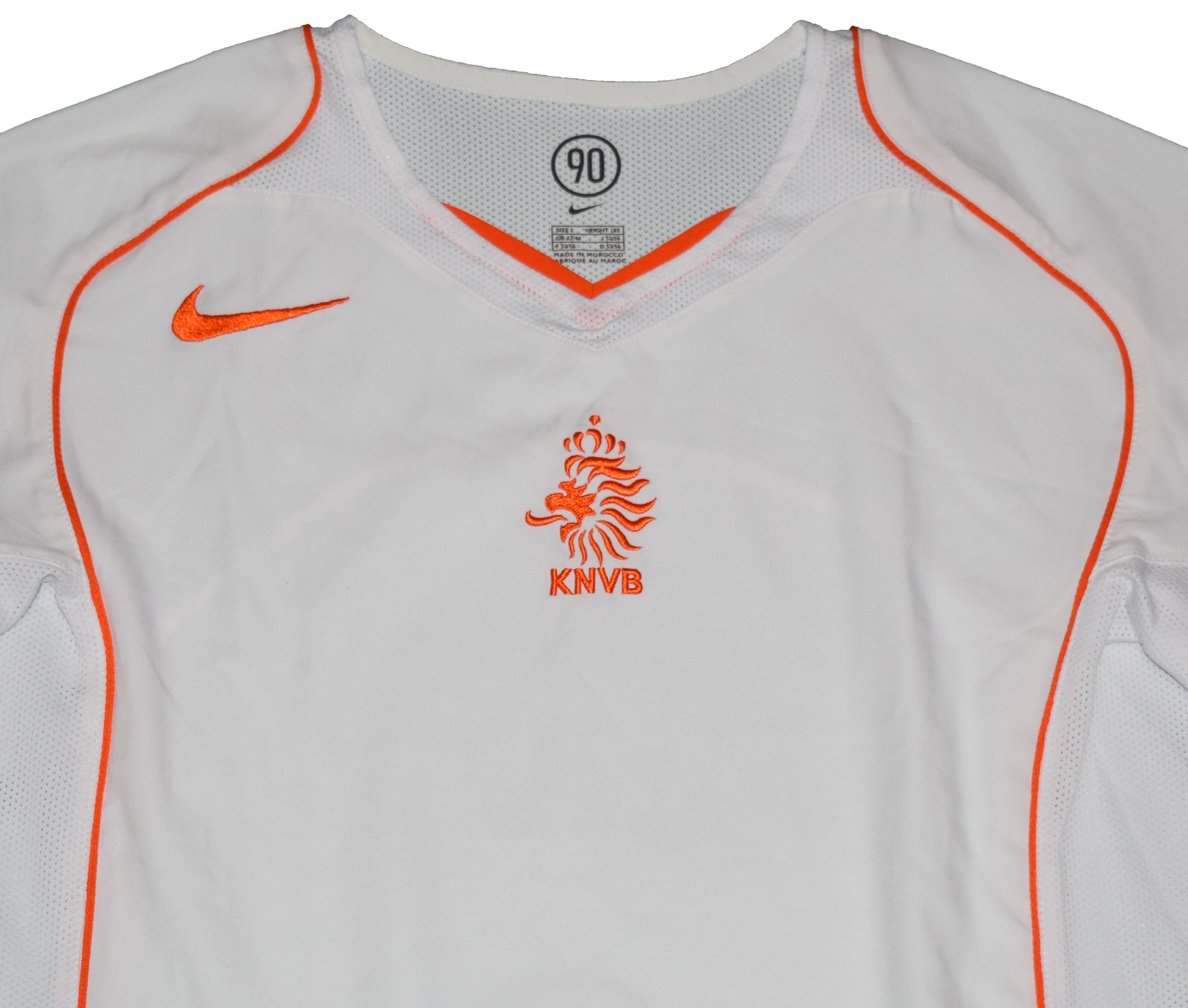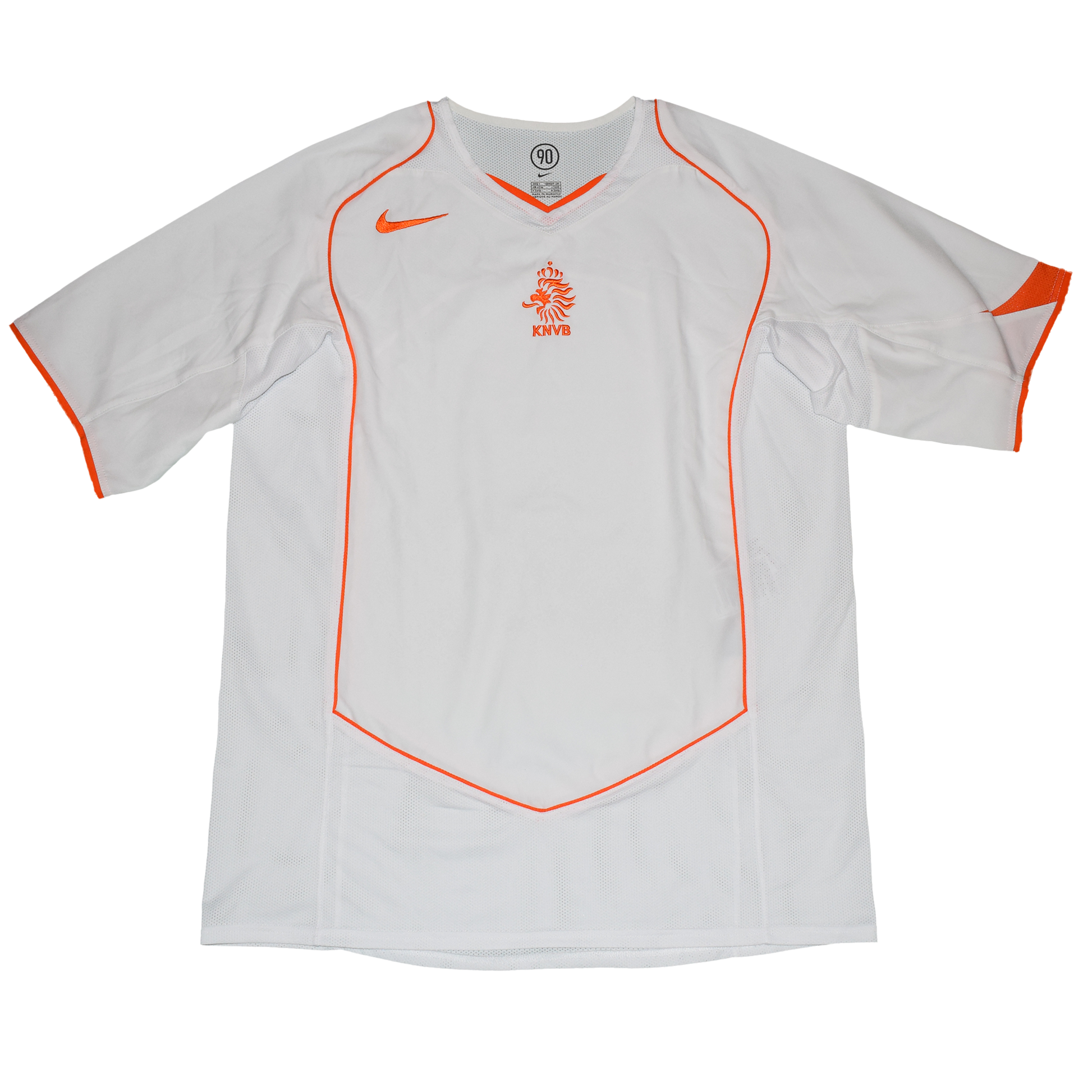 The kit worn by the Netherlands during Euro 2004 was part of Nike’s Total90 collection. It featured a vibrant orange color, representing Dutch national pride. The away kit was primarily white with orange and blue detailing. The kit featured the Dutch FA (KNVB) logo. The condition of this kit is unreal as it looks like it has never been worn and it's in brand new condition. The size is Large