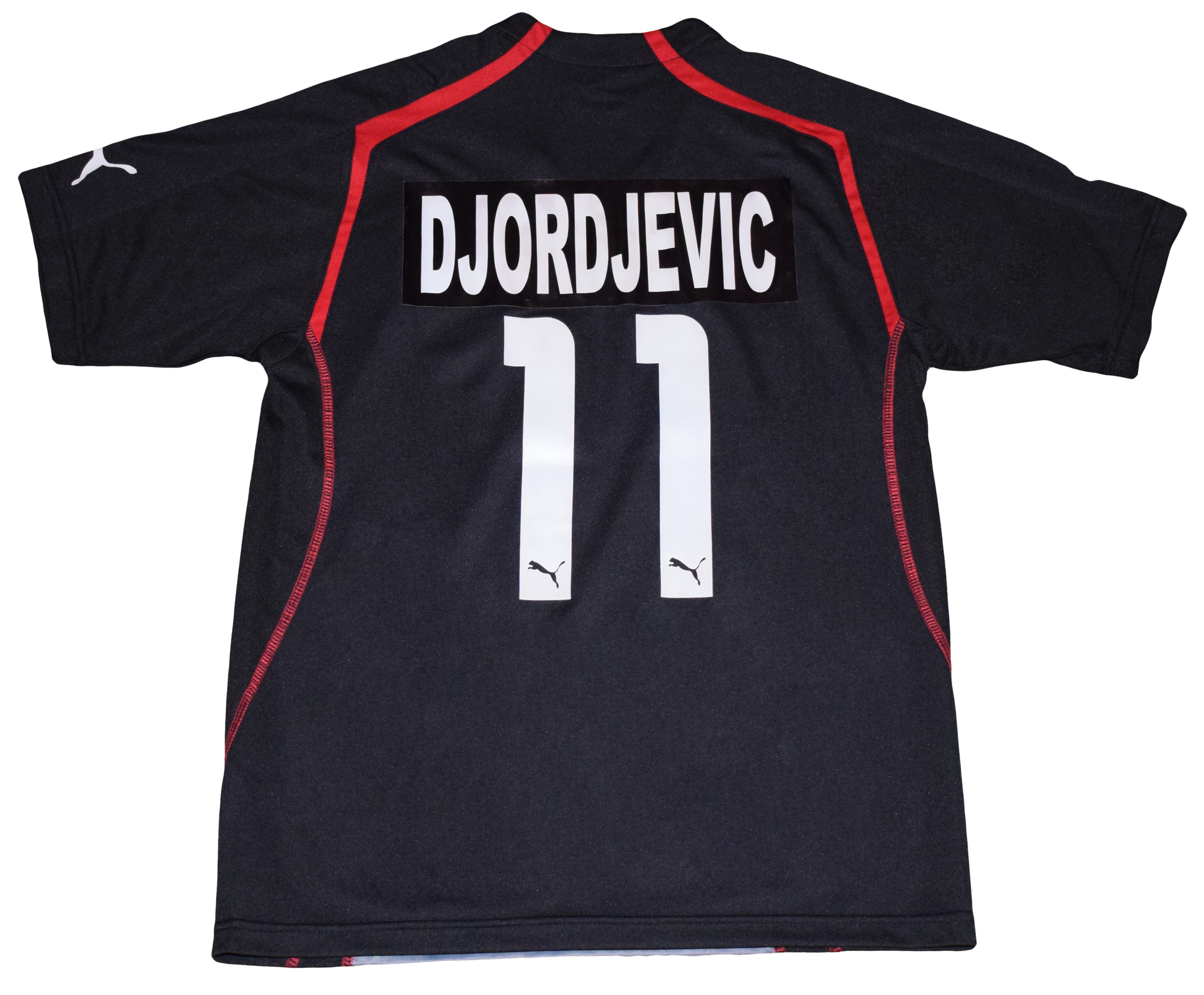 Official Olympiacos 2005/06 Away Shirt, Youth Large, made by Puma. Features the club’s sleek black design with red trim, complete with the official number 11 print for team captain and club icon Predrag Djordjević.