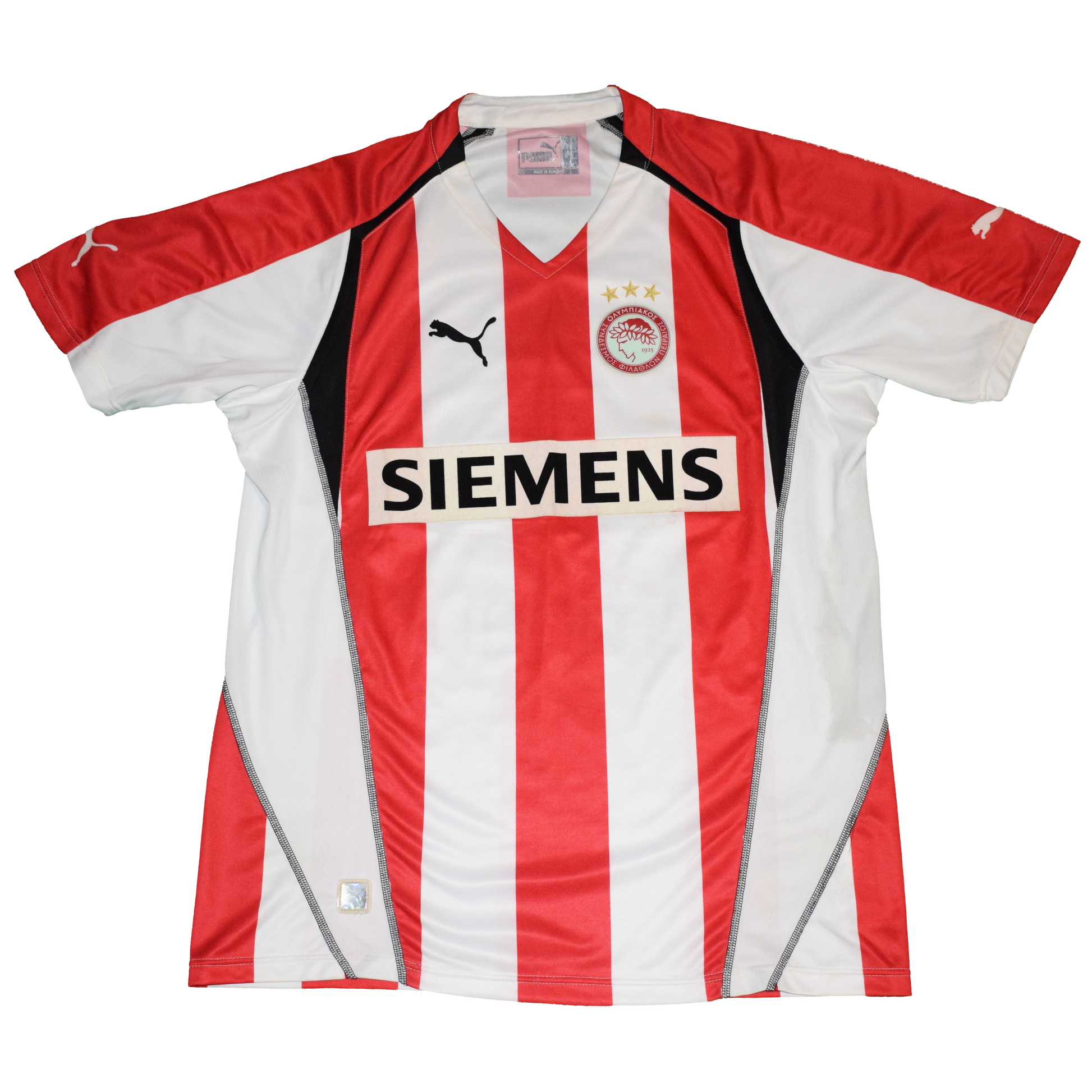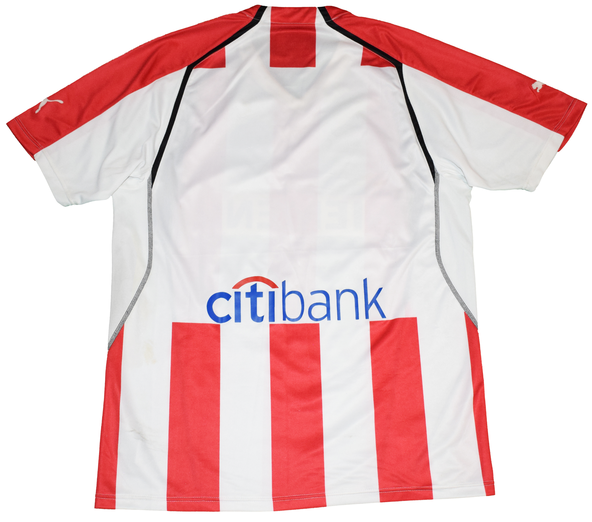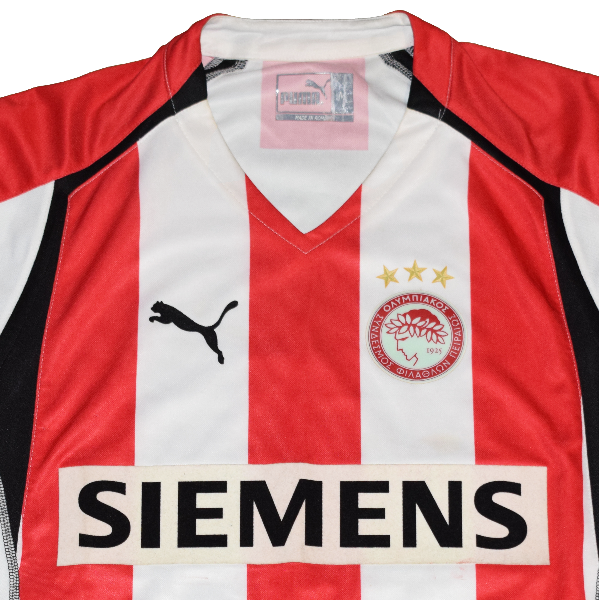 This Olympiacos home shirt from the 2005/06 season, crafted by Puma, showcases the club’s iconic red and white vertical stripes — a staple of Greek football tradition. Worn during a domestic double-winning campaign, this kit reflects a dominant era for the Piraeus giants. This particular piece shows minor flaws/wear, consistent with age, adding to its vintage character.