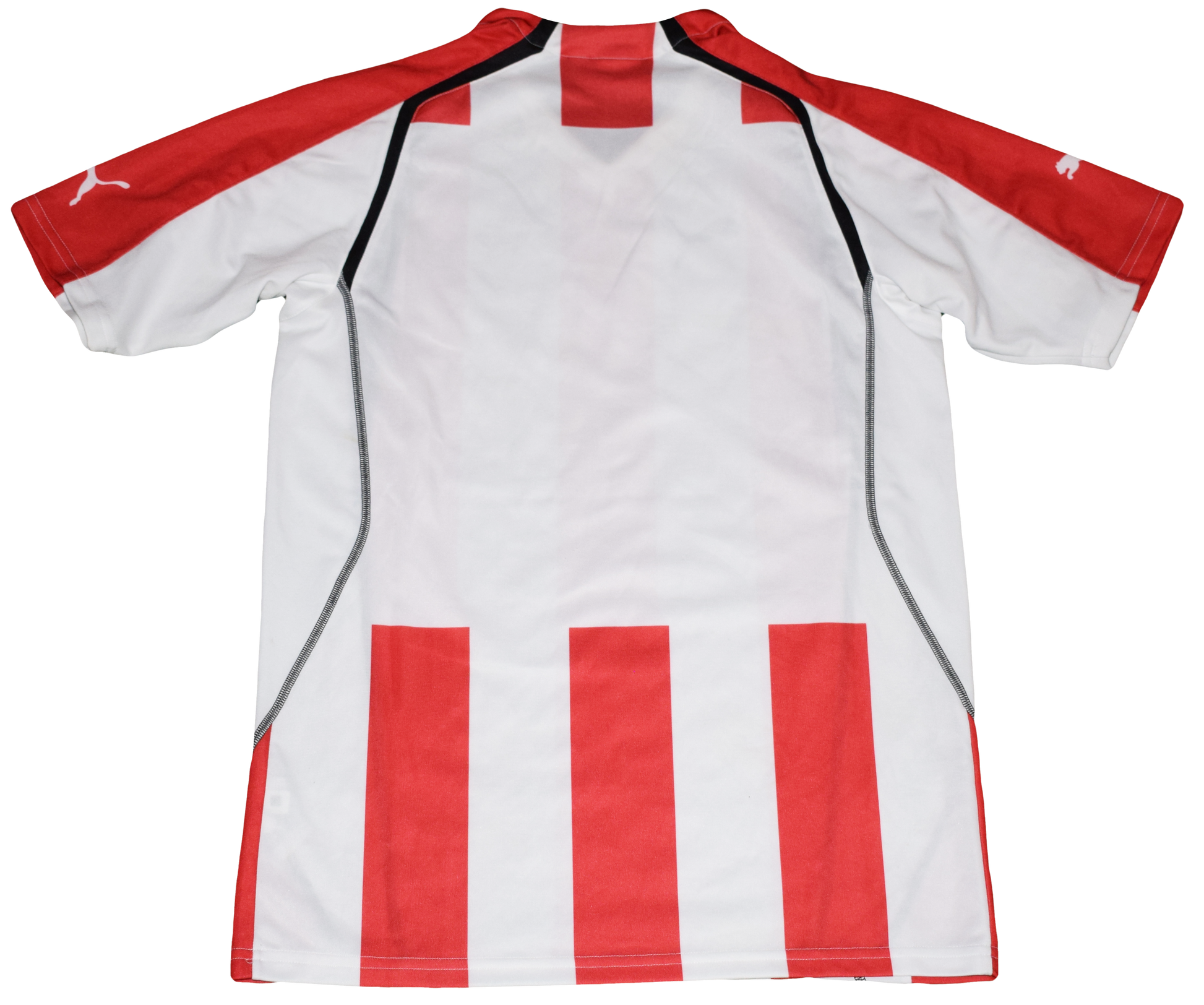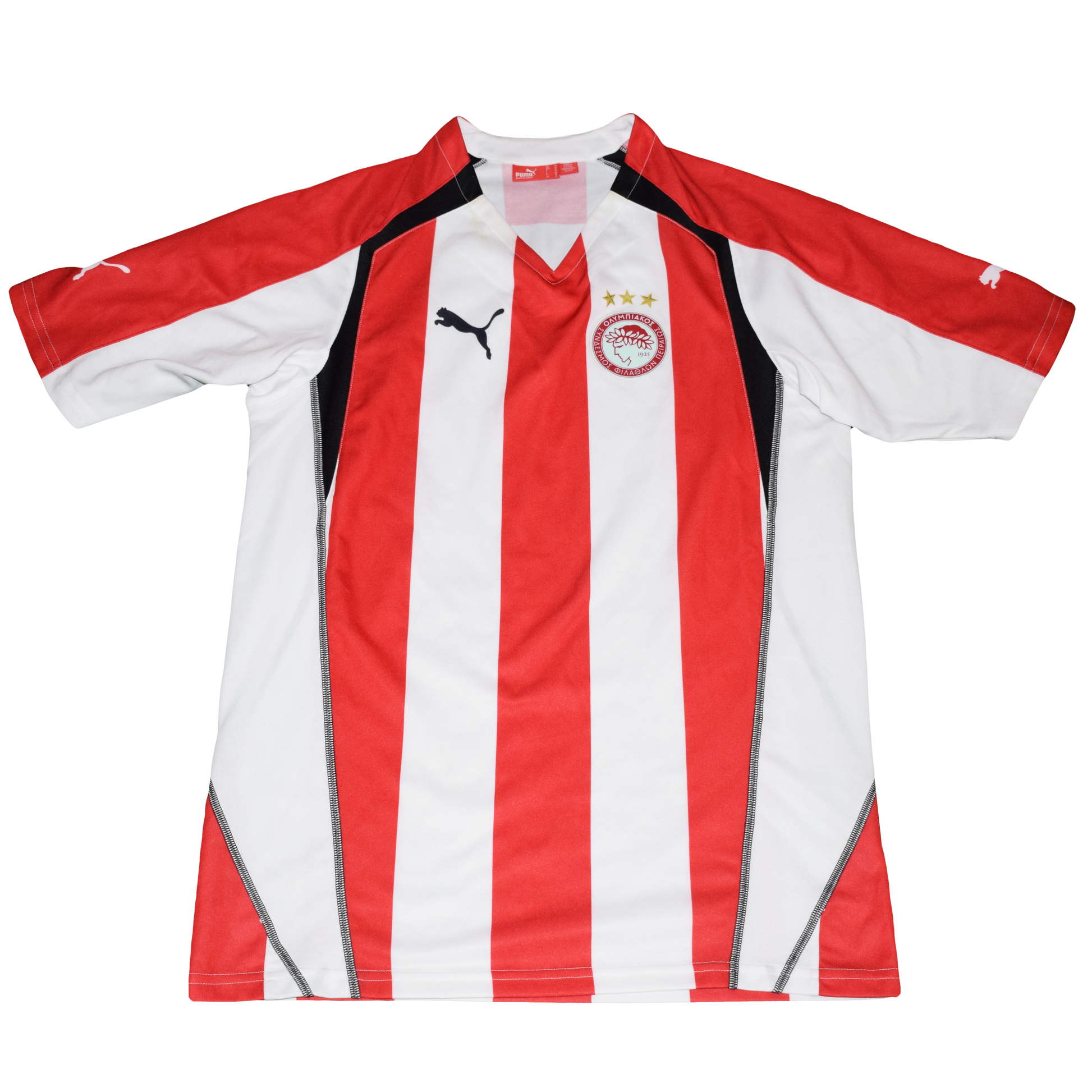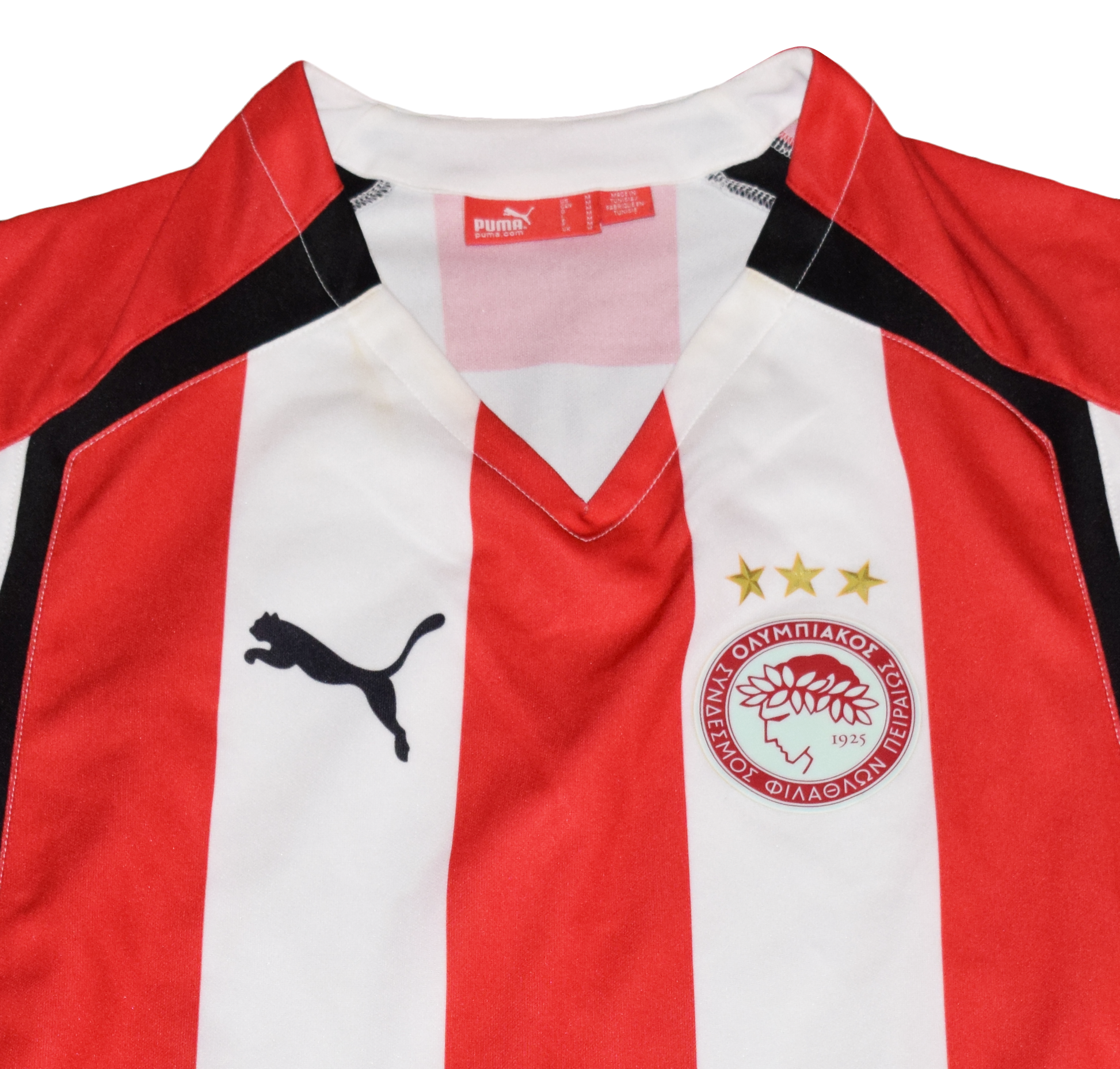 An iconic piece from a golden era in Greek football. This Olympiacos home shirt from the 2005/06 season, made by Puma and in medium size, features the club’s legendary red-and-white stripes with a sleek black trim—an aggressive yet elegant look fitting the dominant champions of that season.
