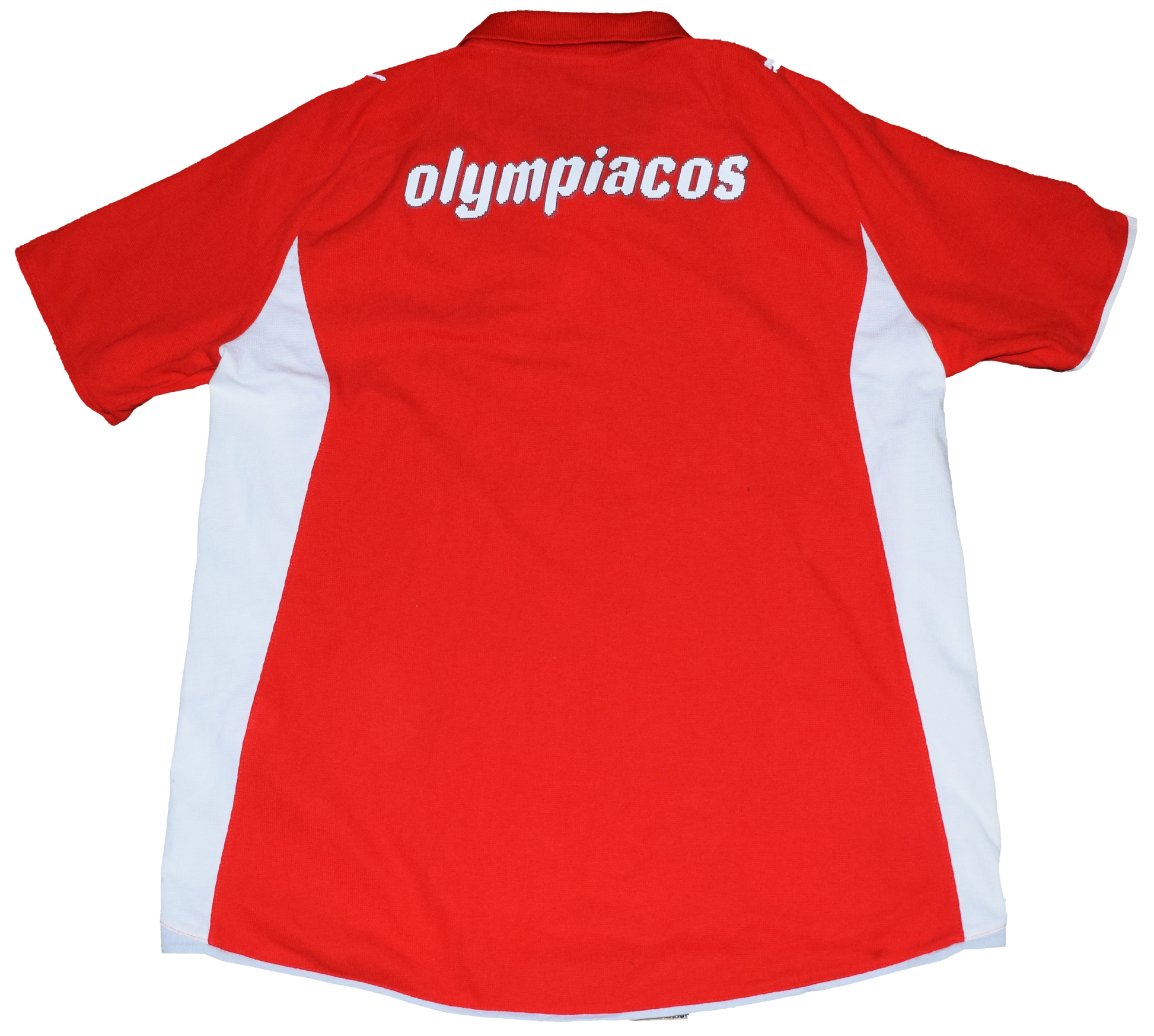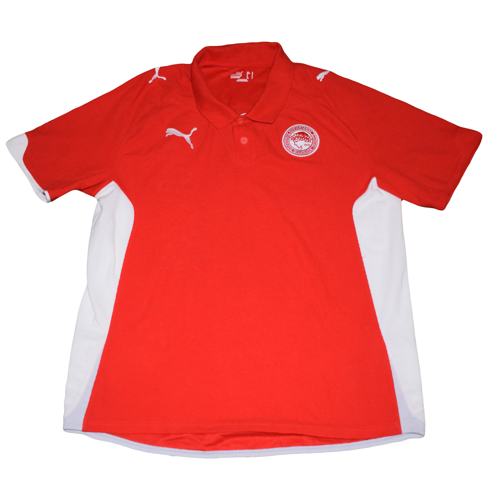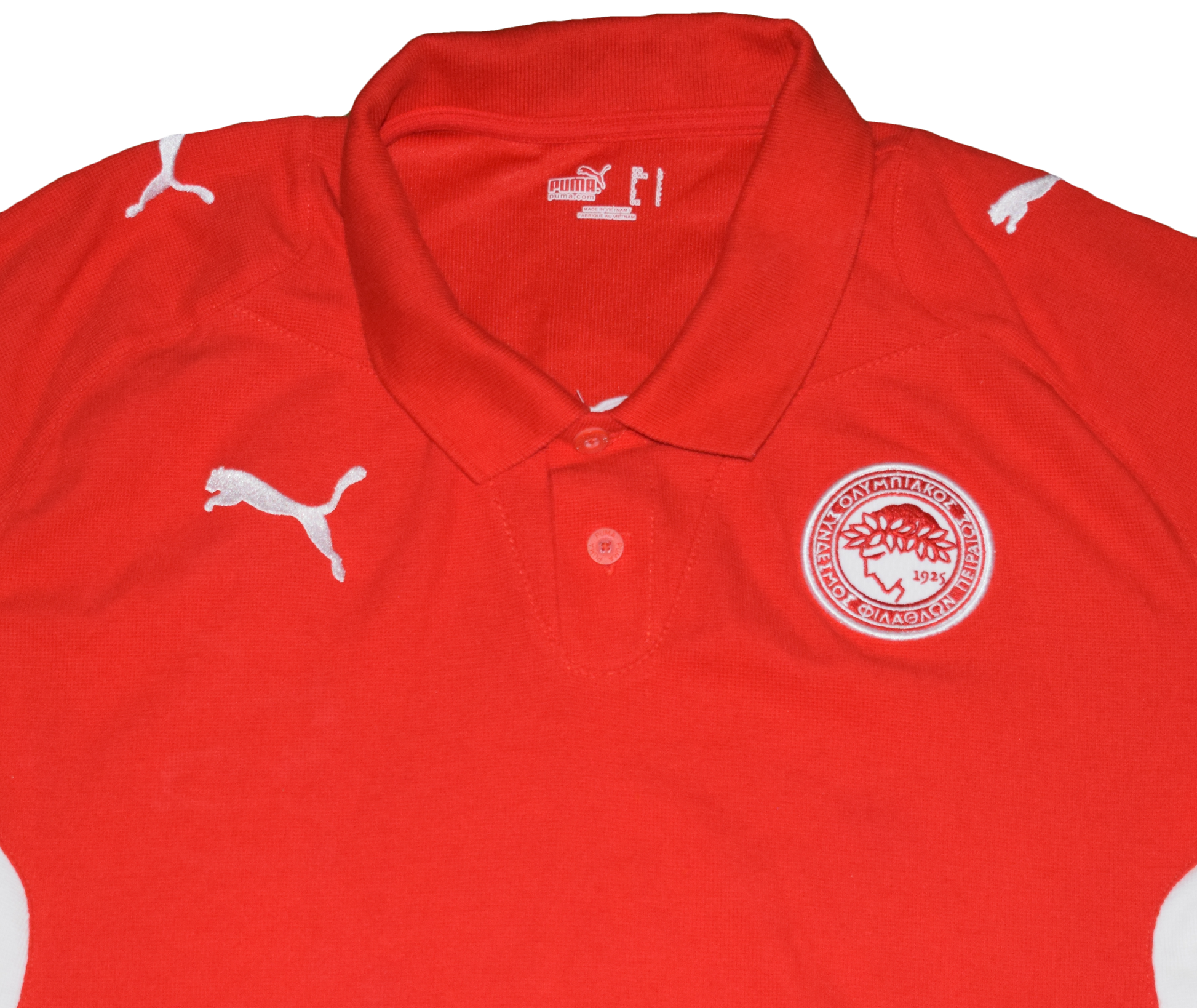 This sleek red-and-white Puma training polo was worn by Olympiacos players and staff during the 2009–10 season, a year of transition and turbulence for the club.
