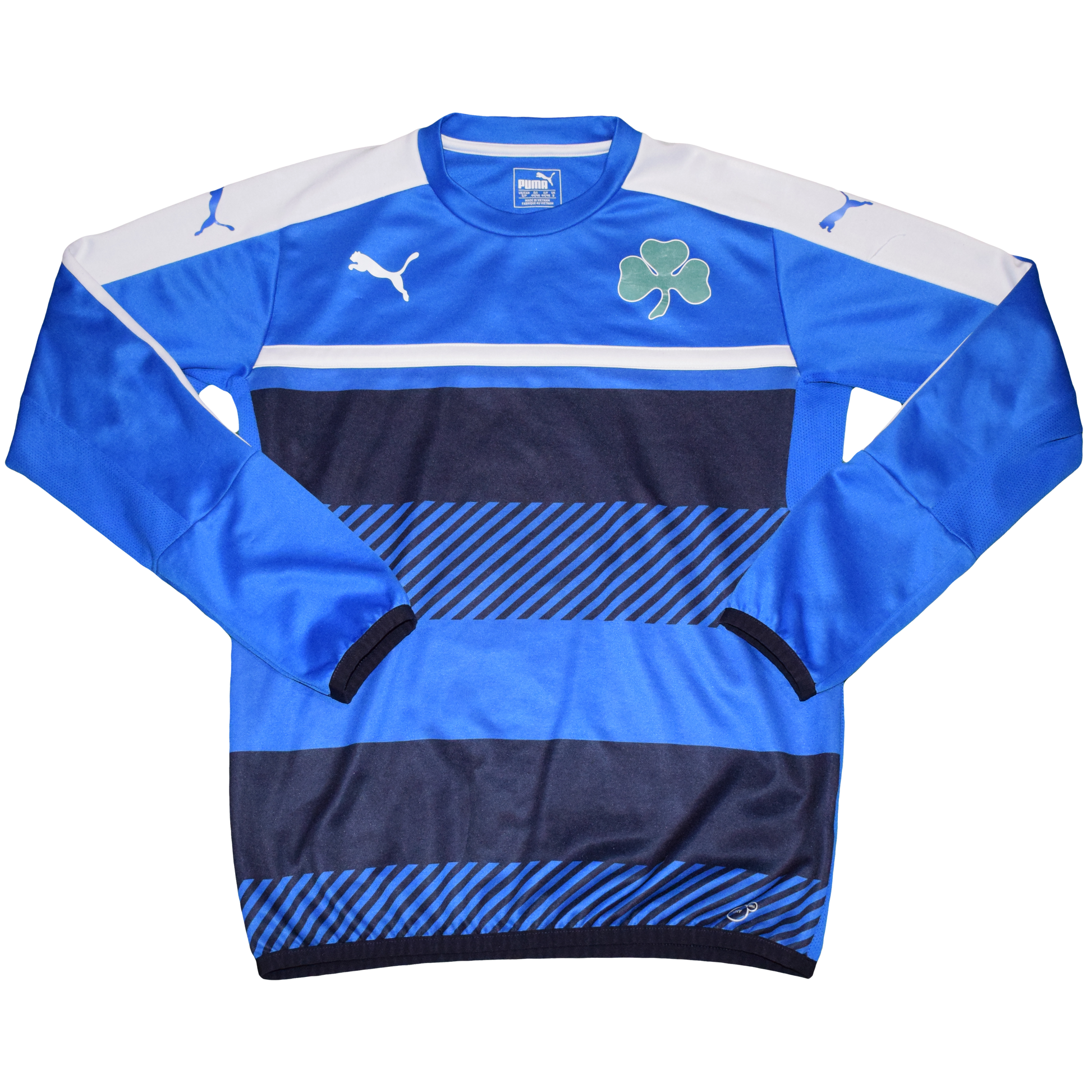 Official Panathinaikos training sweatshirt from the 2015–2017 era, made by Puma. Featuring a unique blue training colourway with dark blue and white detailing and the iconic clover crest on the chest, this piece instantly reflects the look of Panathinaikos during a competitive and demanding period.