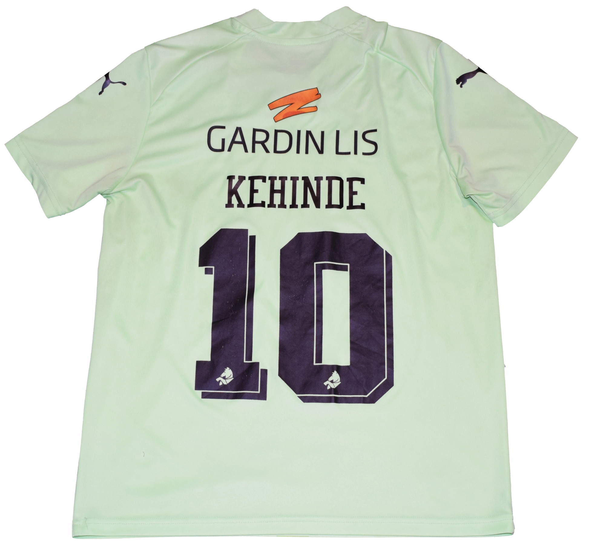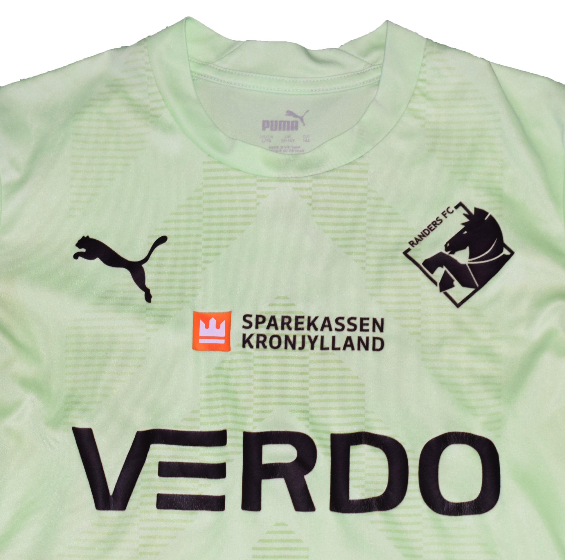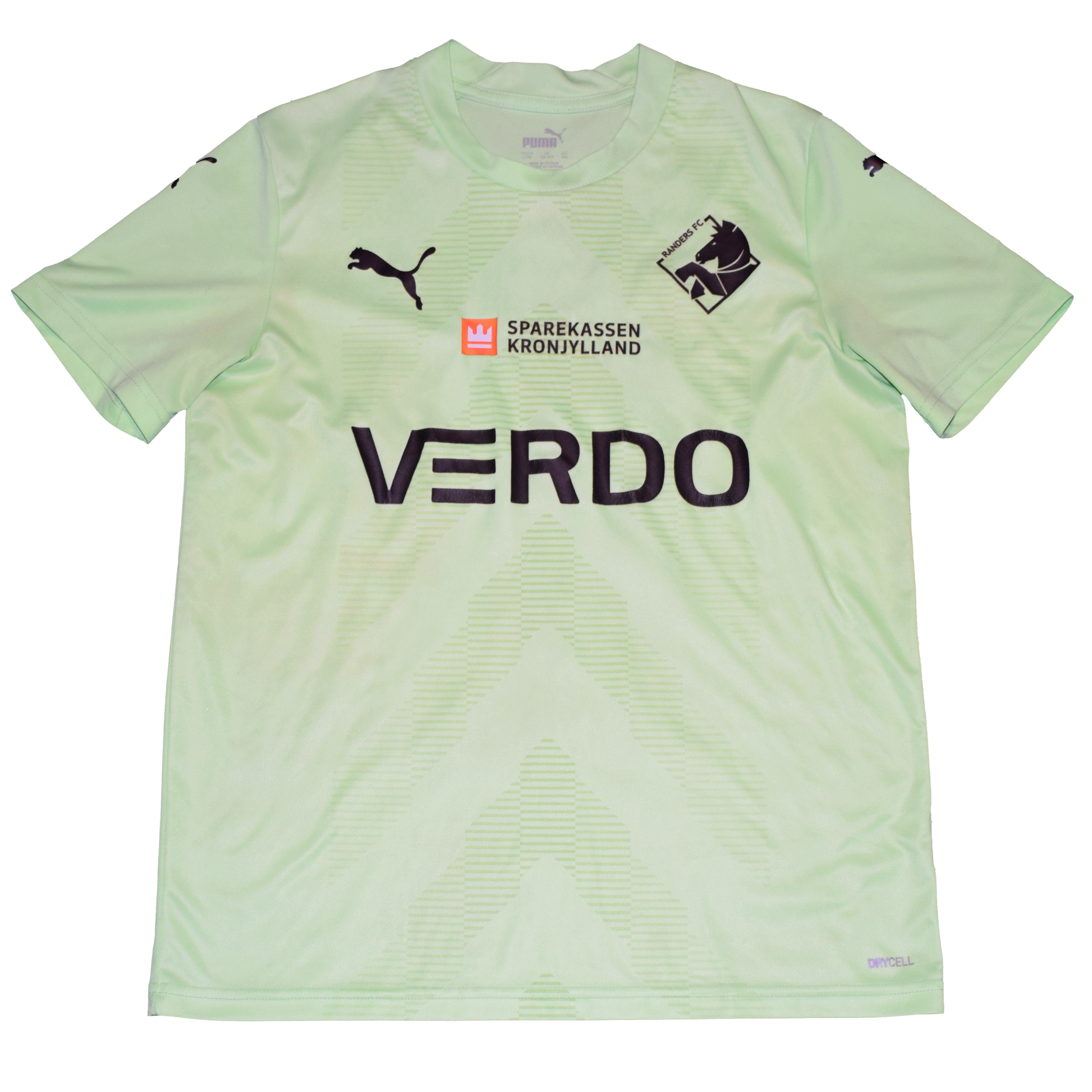 Official third shirt of Danish side Randers FC from the 2021/22 season, produced by Puma. This rare kit comes in a stunning pale mint green color with black sponsor detailing and features the official player print of Kehinde (#10) on the back. The shirt uses Puma's dryCELL technology for moisture control and features all original sponsors.