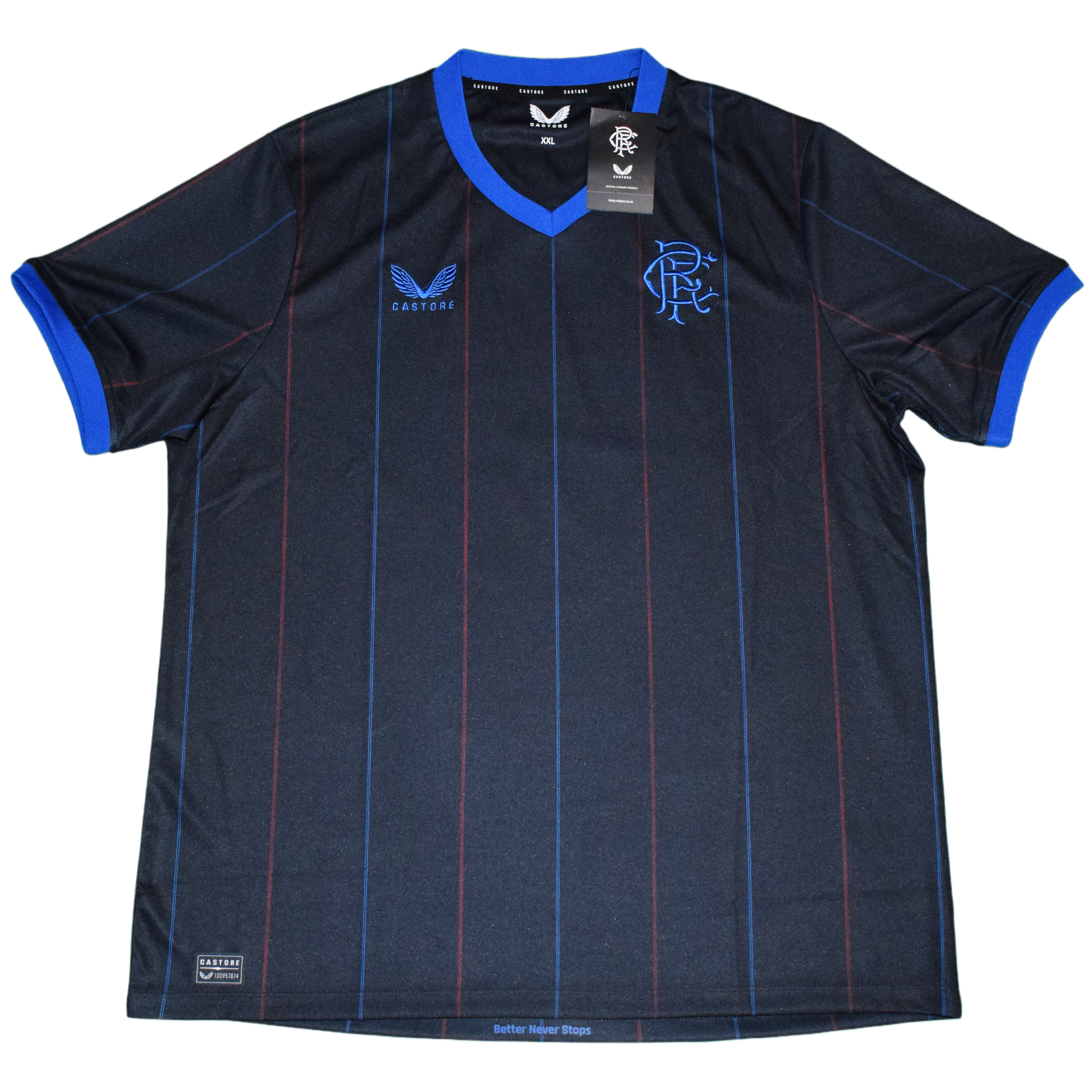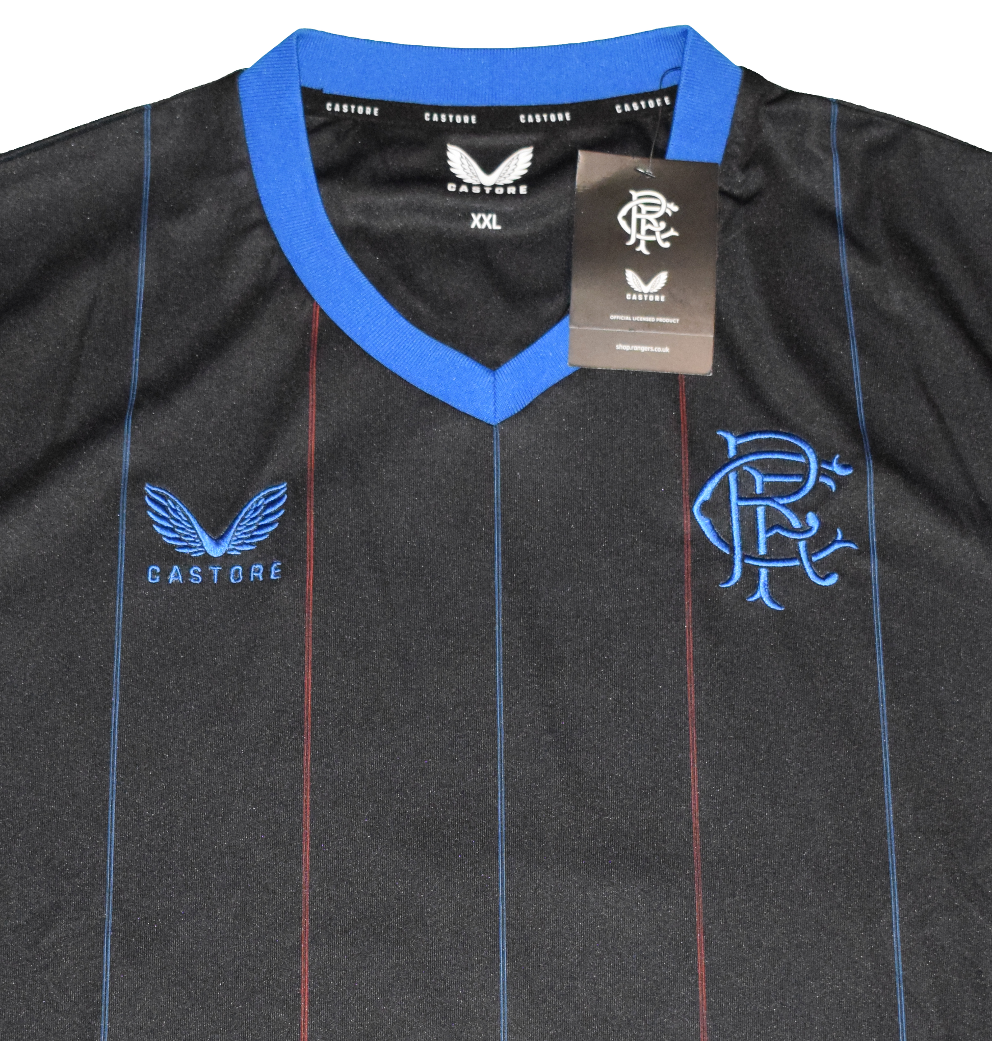 This limited-edition Rangers 2022/23 fourth kit, made by Castore, features a modern, clean black base with sharp blue and red accents. A rare alternate strip, it was introduced as part of a special club release, used in select away matches and fan engagements.