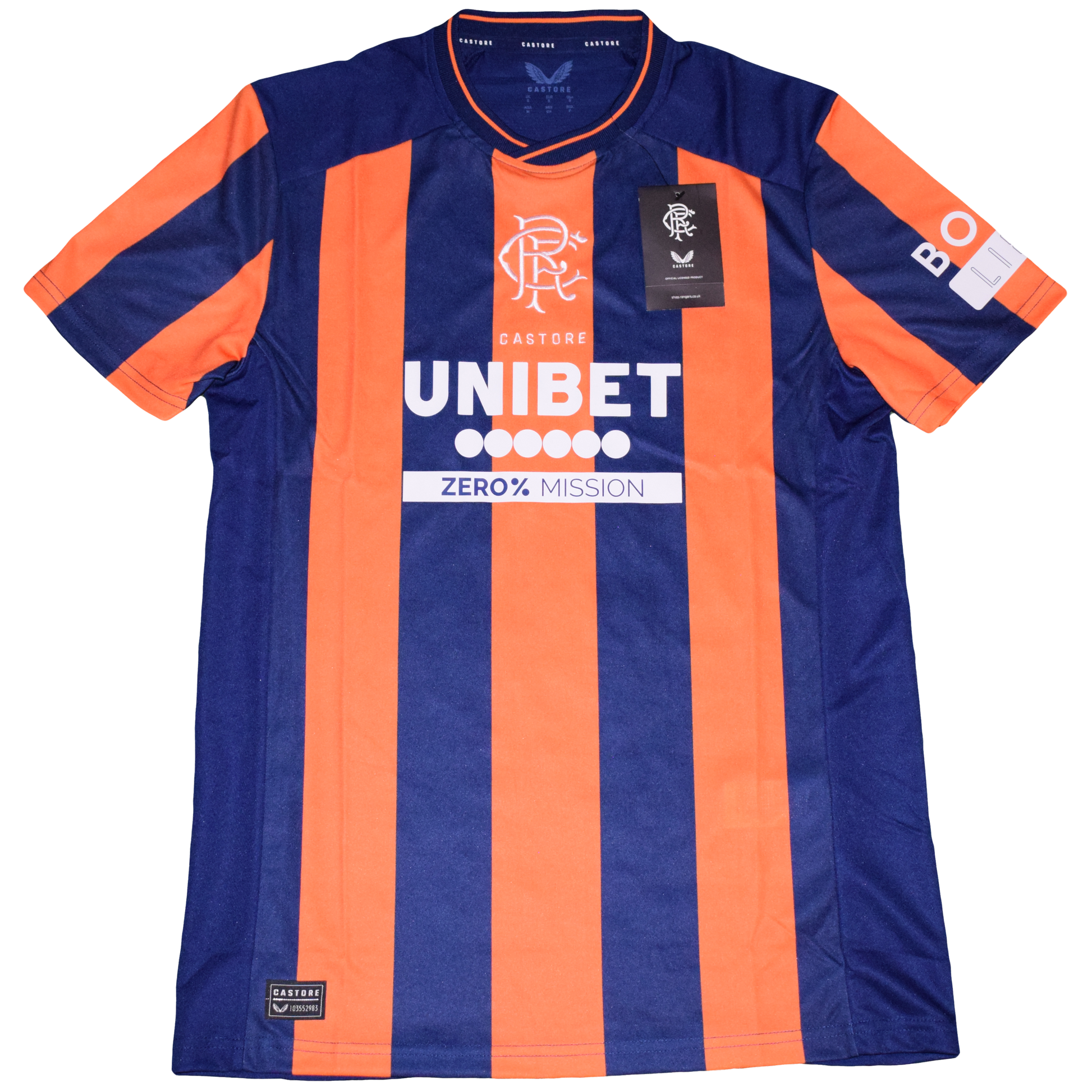 This Rangers 2023/24 third shirt by Castore delivers a striking look with deep navy and vibrant orange vertical stripes, blending tradition with a modern edge. Featuring the RFC monogram crest and sponsor detailing, this kit stands out as one of the most distinctive designs of the season. In excellent brand new condition with tags, it’s perfect for collectors or fans looking for a fresh addition.