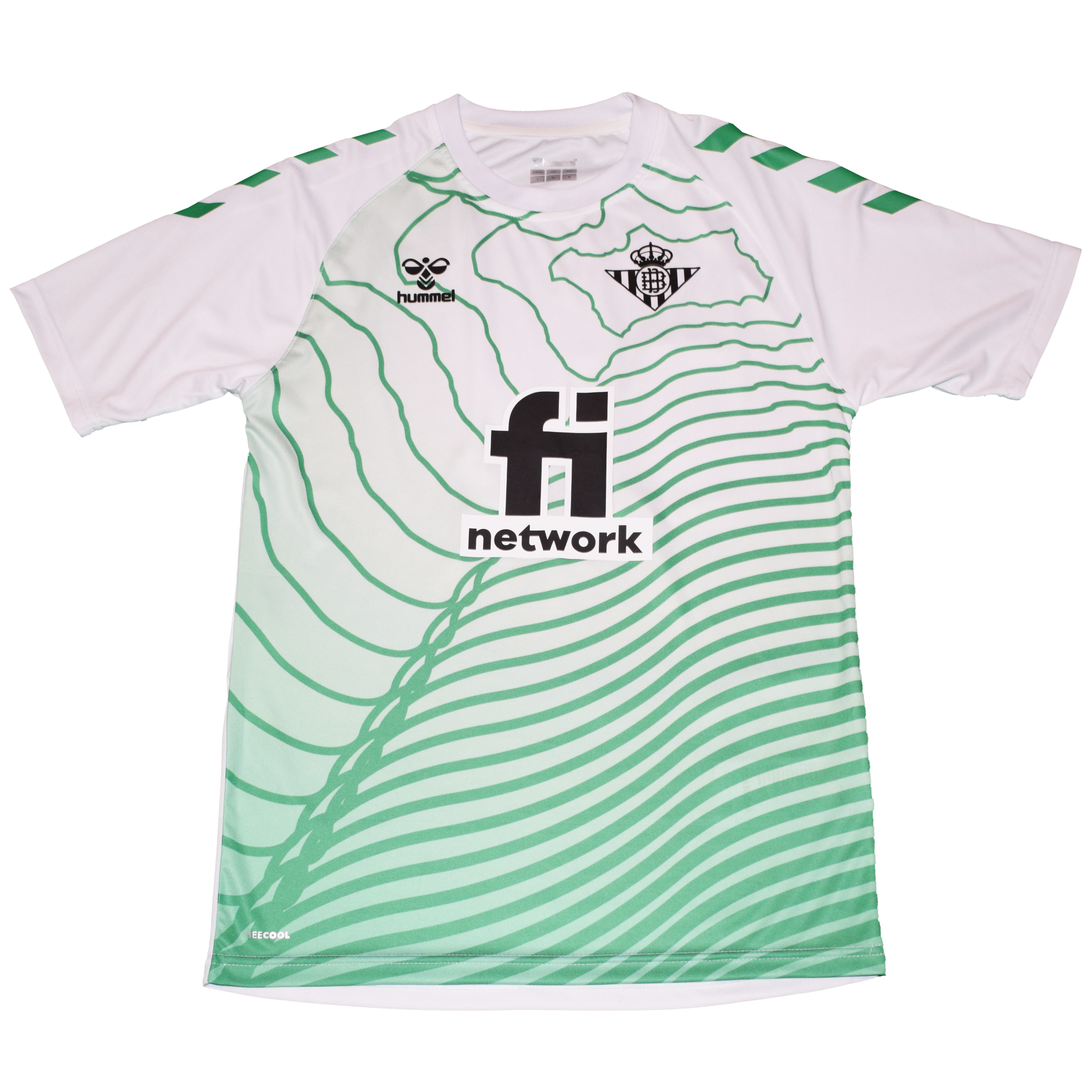 This vibrant pre-match shirt, designed by Hummel, features a bold, wave-like green pattern across the front, echoing the energy and creativity Real Betis bring to the pitch. The sleek design is paired with the club crest and iconic sponsor “fi network,” creating a modern, standout look for warm-ups.