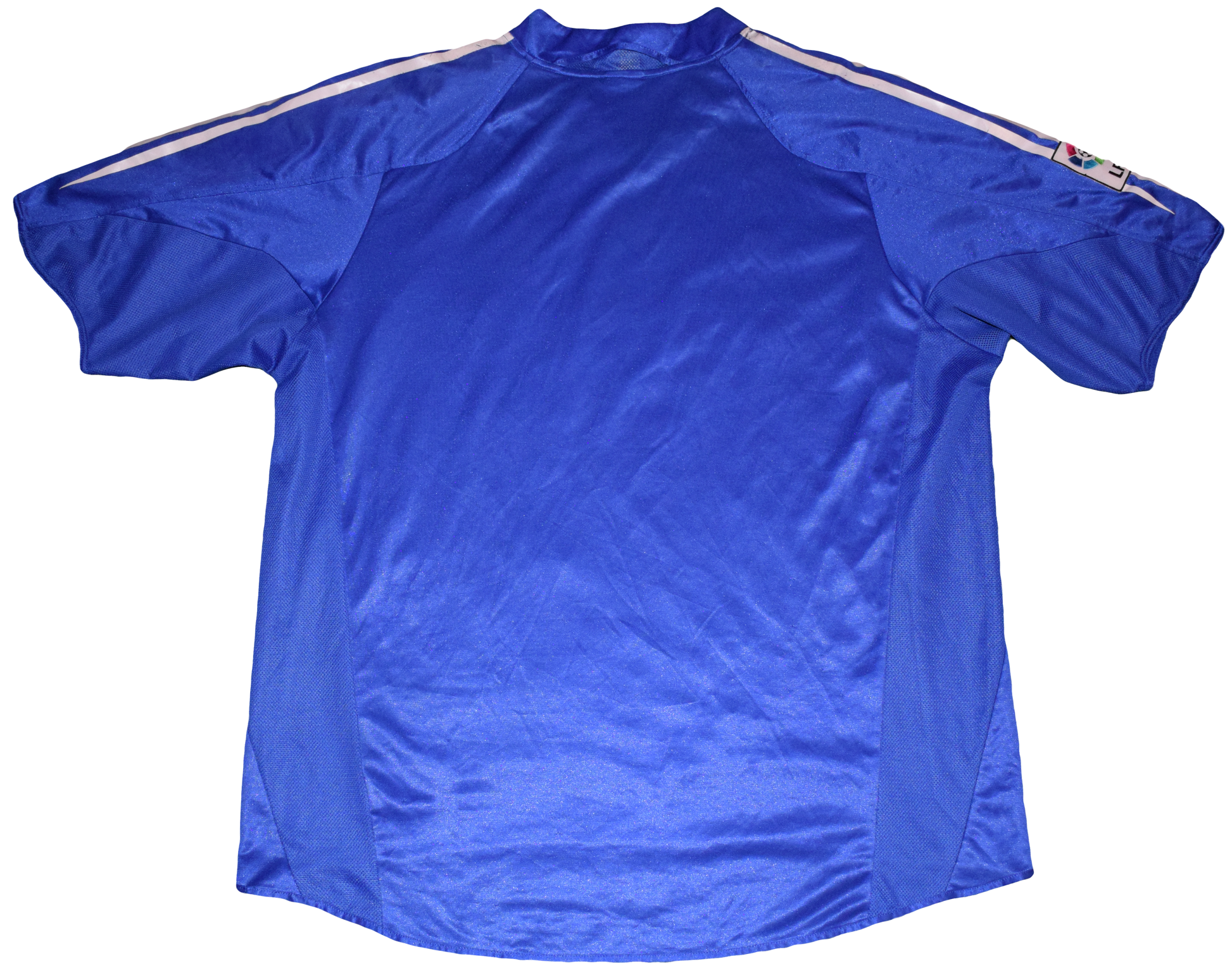 Own a very rare piece of football history with this blue Real Madrid 2004/05 third kit by Adidas, size XXL. Worn during a season where Real Madrid finished 2nd in La Liga, competing fiercely with Barcelona, this kit features classic Adidas three-stripe detailing, though there is some wear on the shoulders as typical of kits from that season.