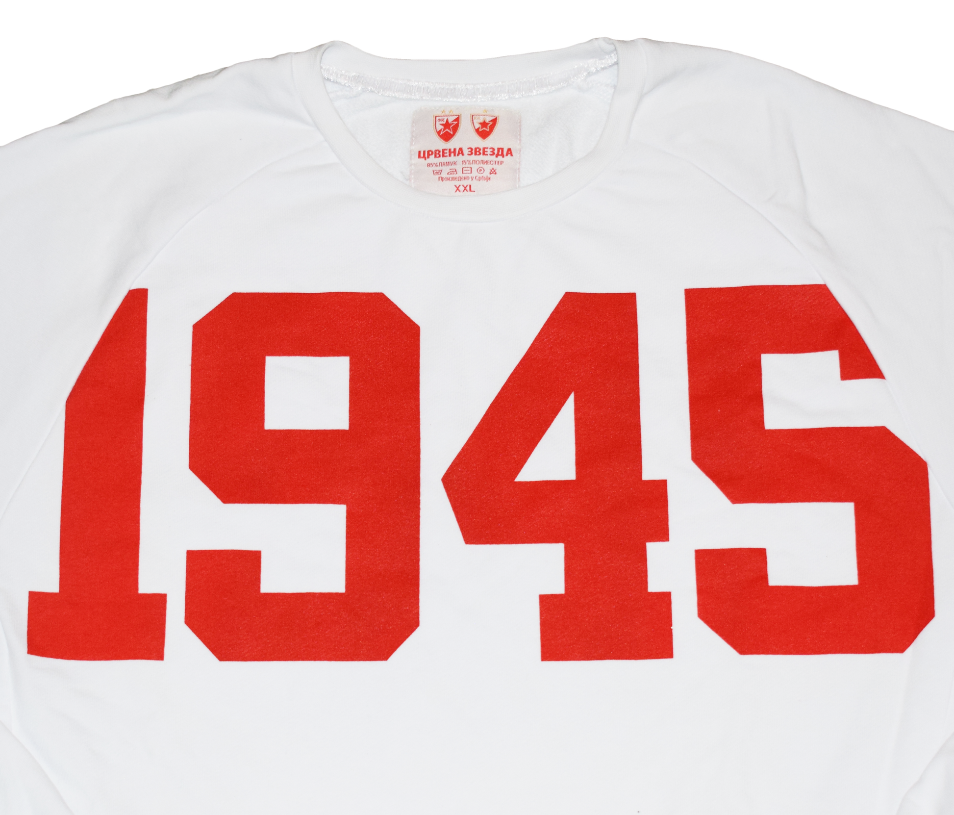 Celebrate the proud heritage of Red Star Belgrade with this bold and stylish “1945” sweatshirt, marking the year of the club’s foundation. This piece combines simplicity with classic symbolism, a clean white base contrasted by large red “1945” lettering across the chest and the Red Star crest stitched near the hem.