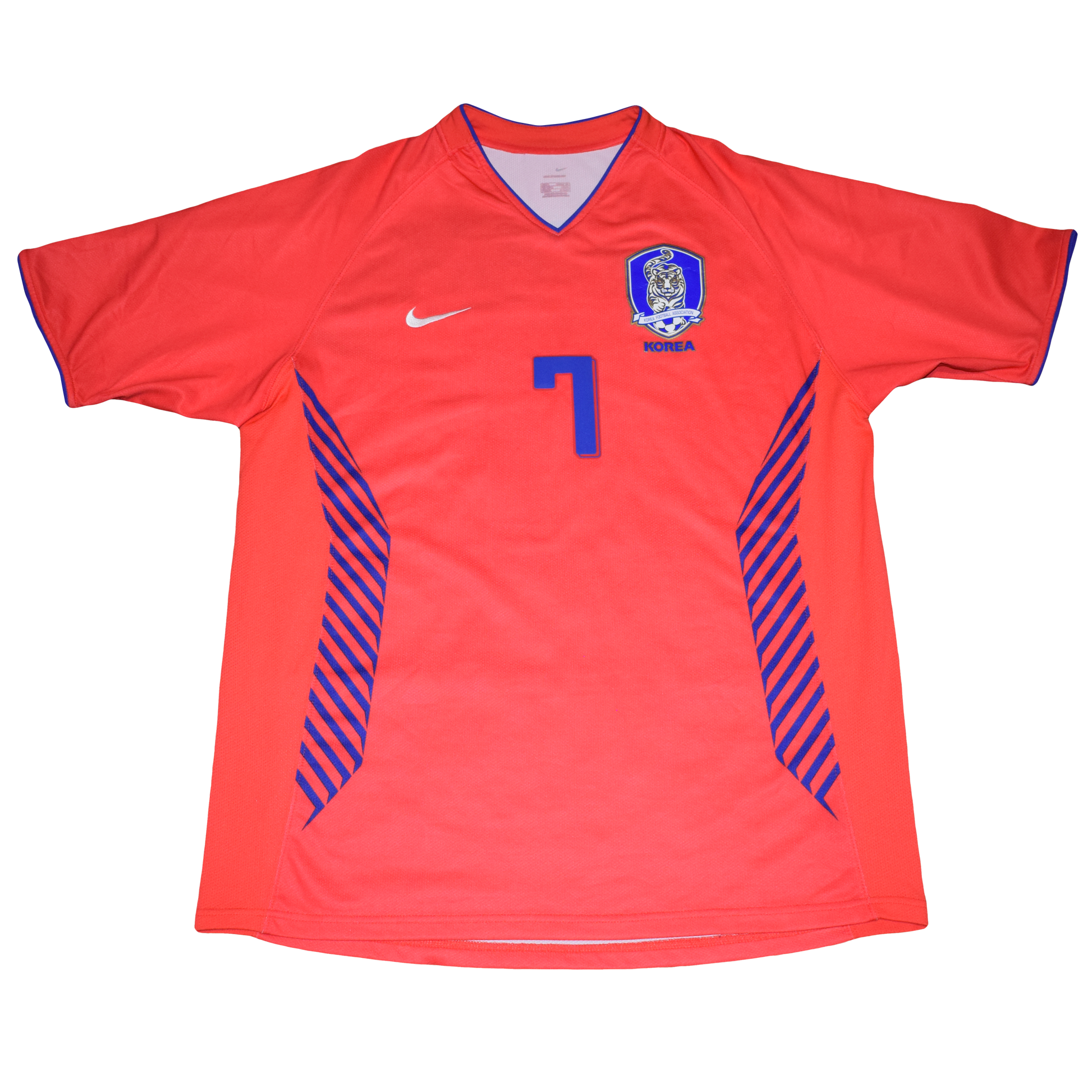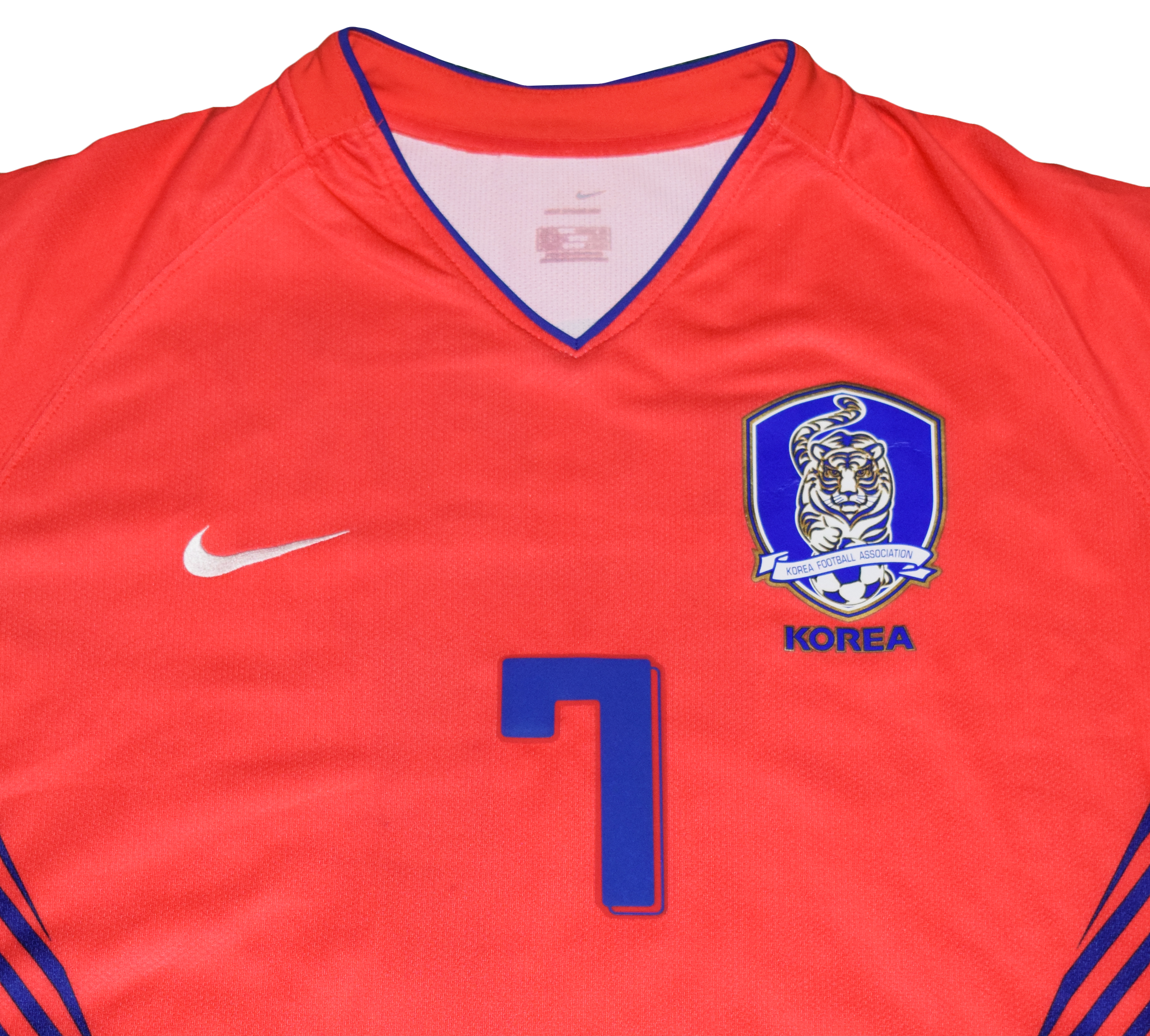 This kit captures the peak of Korean footballing pride – bold red base with striking blue diagonal accents down the sides and a crisp white collar. A rare Nike authentic edition with original font, it’s not just a jersey – it’s a statement piece for collectors who appreciate both legacy and design.