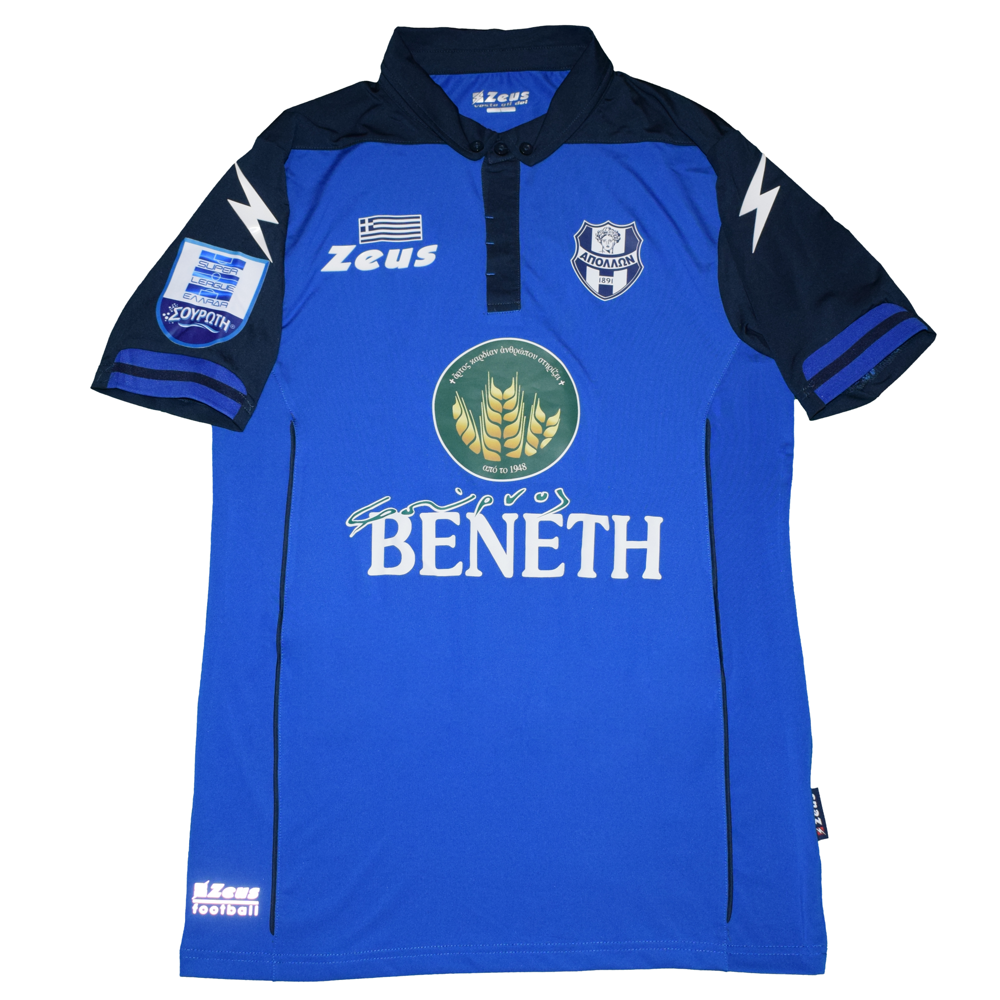 This is an authentic matchworn short-sleeve third kit shirt from the 2018/19 season of Apollon Smyrnis, worn by defender Nikolaos Vafeas. The shirt is size Large and features the distinctive design used by the club during their Super League Greece campaign.