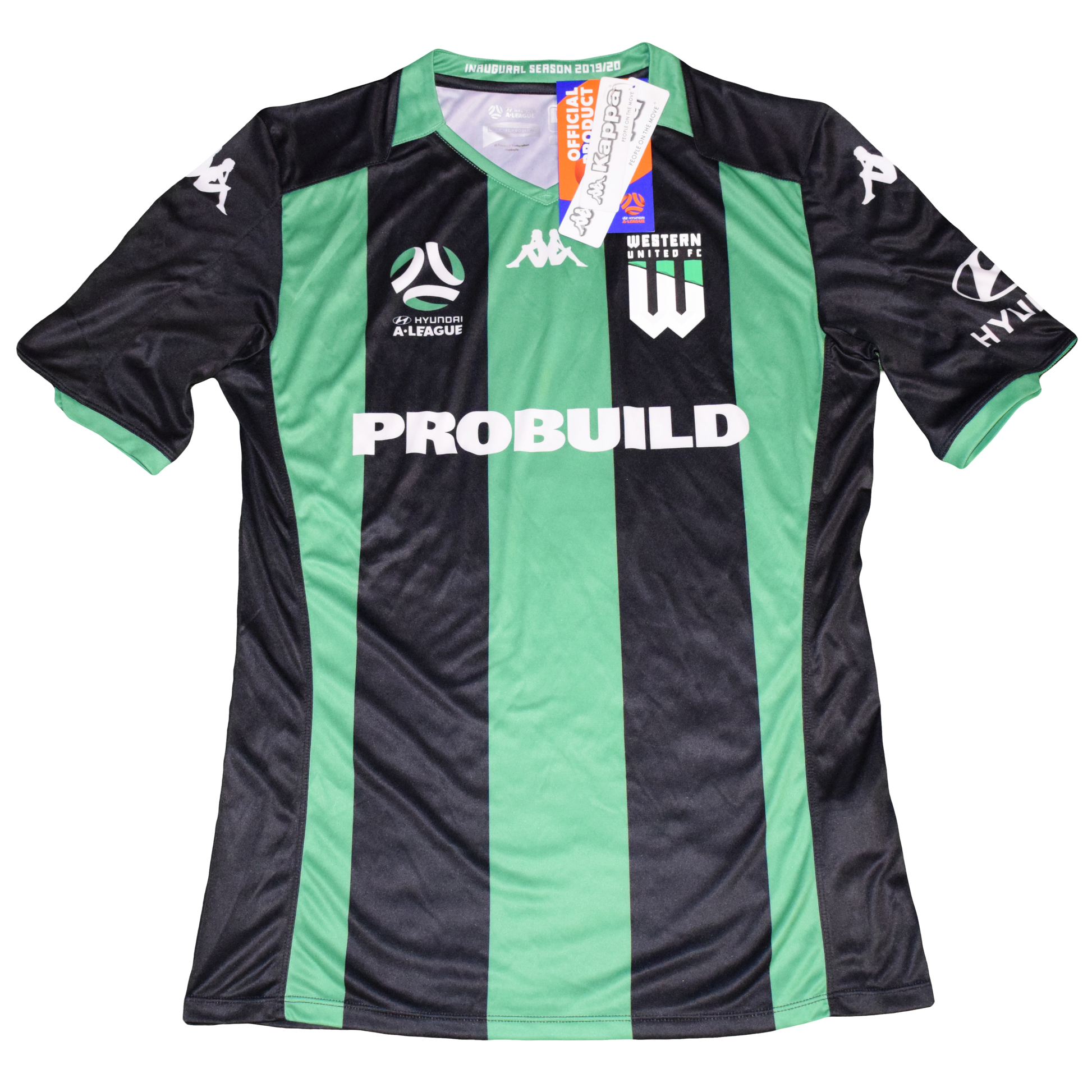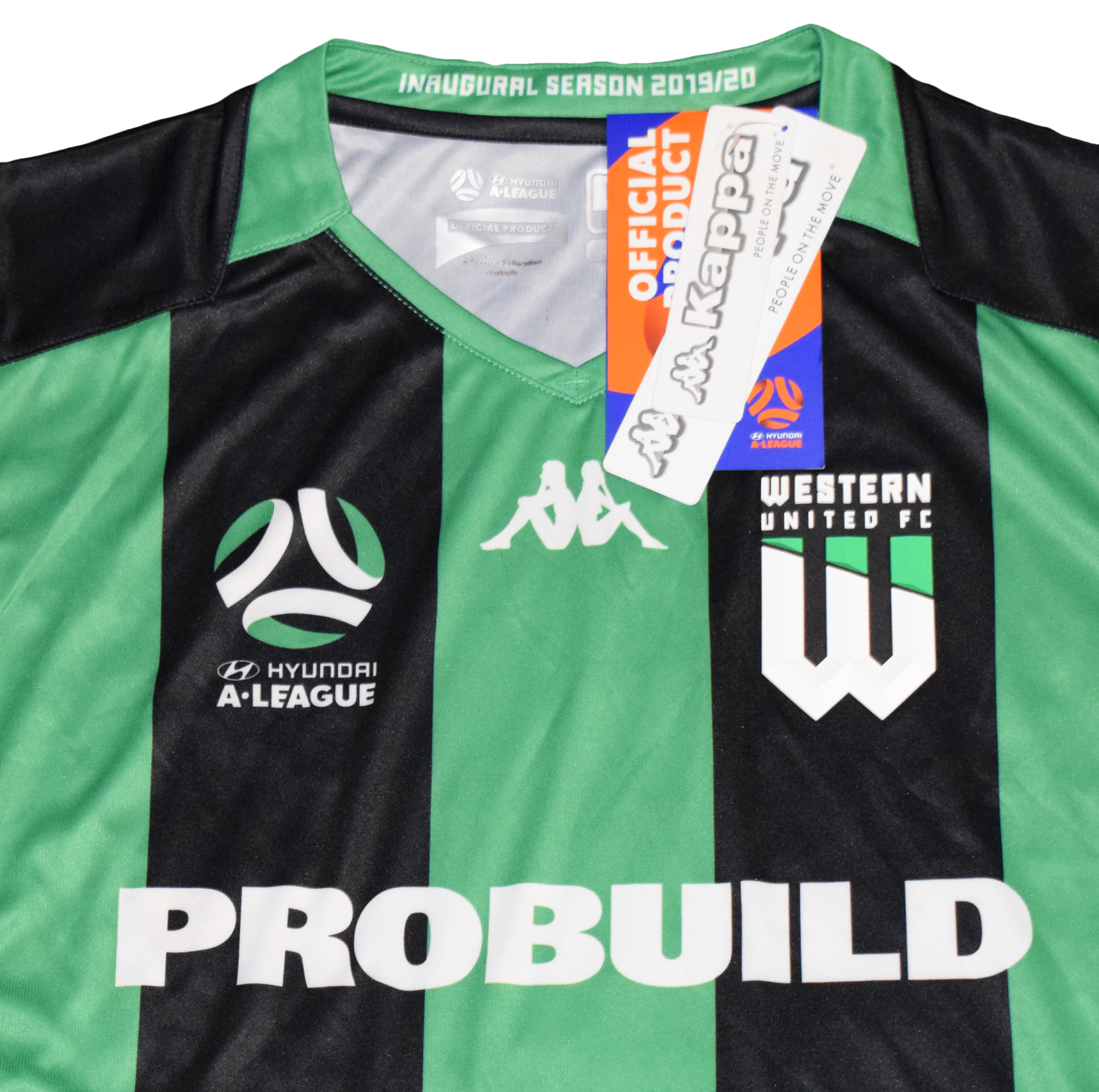 A piece of A-League history — this is the official home shirt from Western United’s inaugural 2019/20 season, as worn during the club’s very first campaign in Australia’s top flight. Produced by Kappa, the kit features bold black and green vertical stripes, a clean white PROBUILD sponsor across the chest, and Hyundai A-League and manufacturer logos on the sleeves.