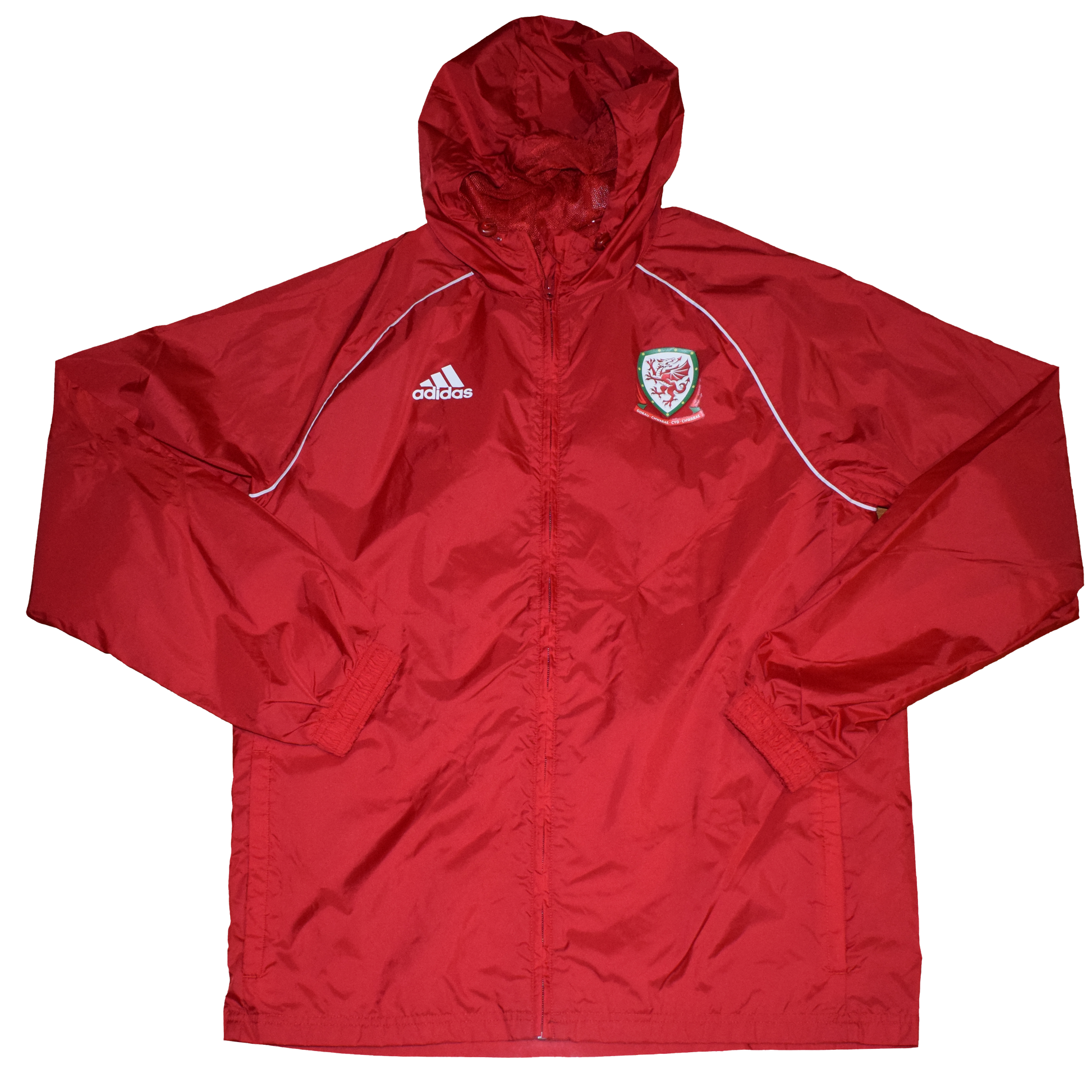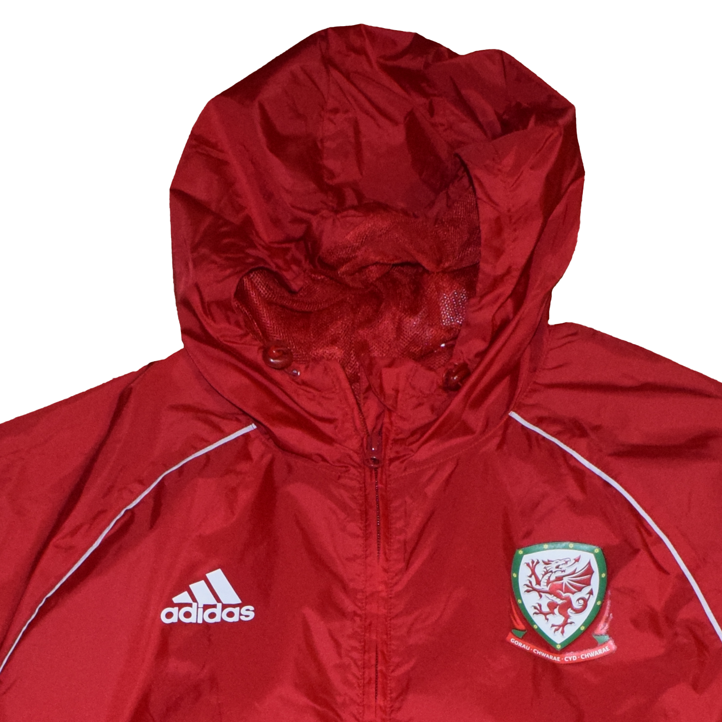 Official Adidas rain jacket for the Wales National Team. Features a red water-resistant shell, hood, full zip, side pockets, and embroidered FAW crest with Adidas logo. Worn during the 2018–19 season. Size Medium, excellent condition.