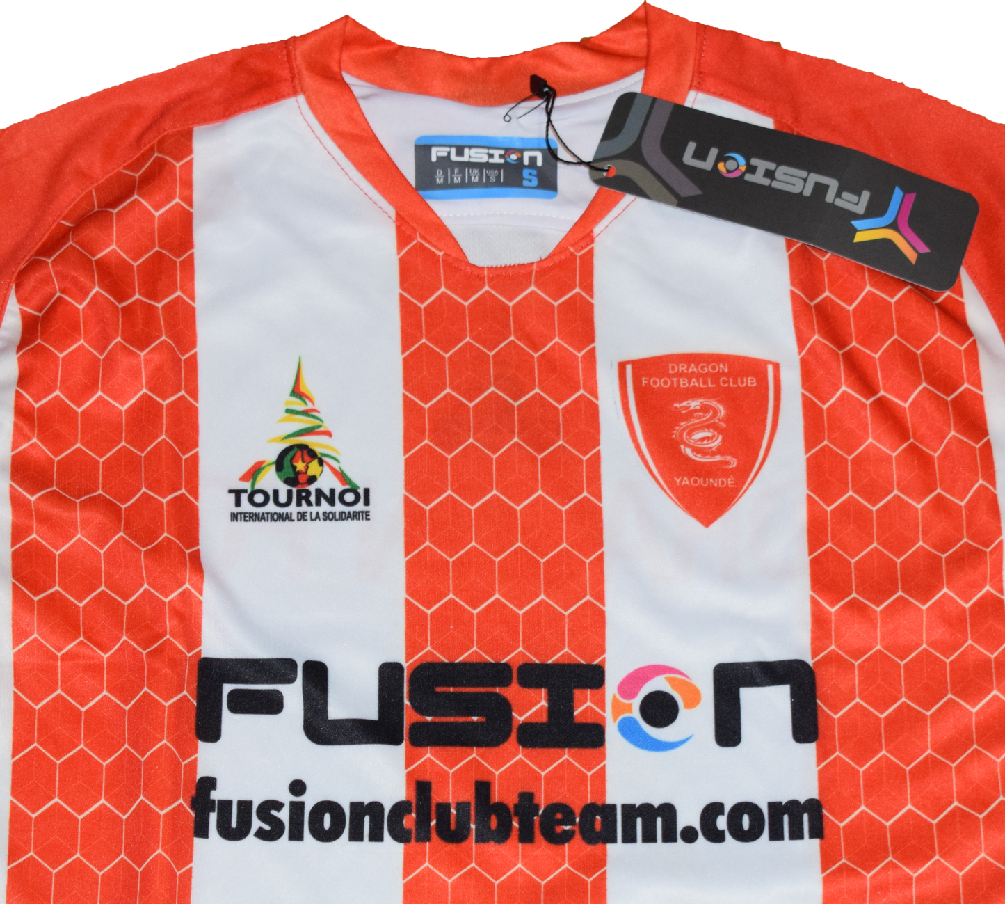 The front of the jersey proudly displays the Dragon Football Club Yaoundé crest, a symbol of the team’s legacy in Cameroonian football. Also featured is the logo of the Tournoi International de la Solidarité, an event promoting unity through the sport. The Fusion branding and sponsor details add a professional touch, making this kit perfect for both players and passionate supporters.