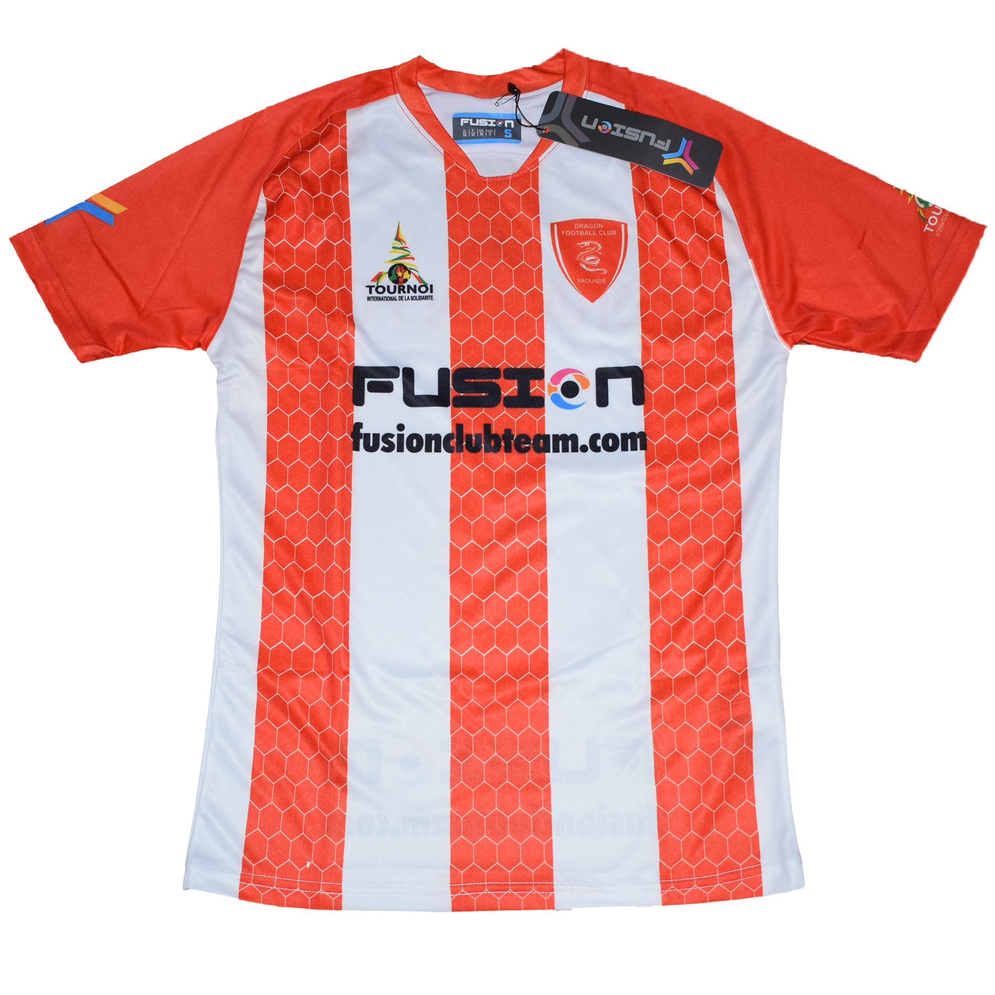Step onto the pitch in style with the Yaoundé Dragon FC from the 2020 season, home kit. This striking jersey features a bold red and white vertical stripe design with an eye-catching hexagonal pattern woven into the red sections. Crafted by Fusion, the kit is built for performance, offering a lightweight, breathable fabric that ensures maximum comfort during intense gameplay. Size Medium and in Brand New With Tags condition.